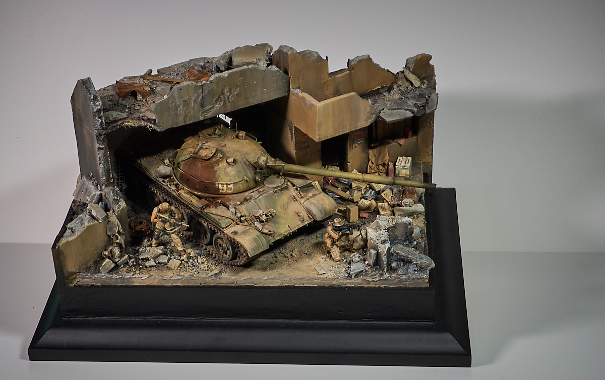 Строилось все это дело спонтанно. В танке заменил поручни, спаял ограждения фар да заменил на самодельный трос. Городские руины из строительного гипса, добавил наемников да немного хлама.