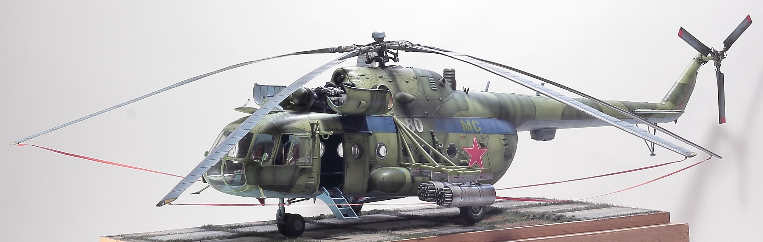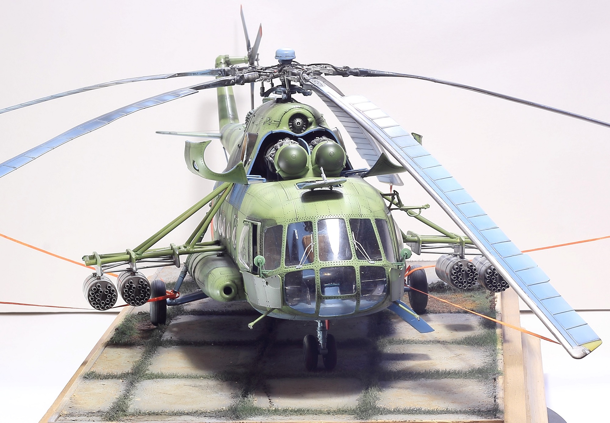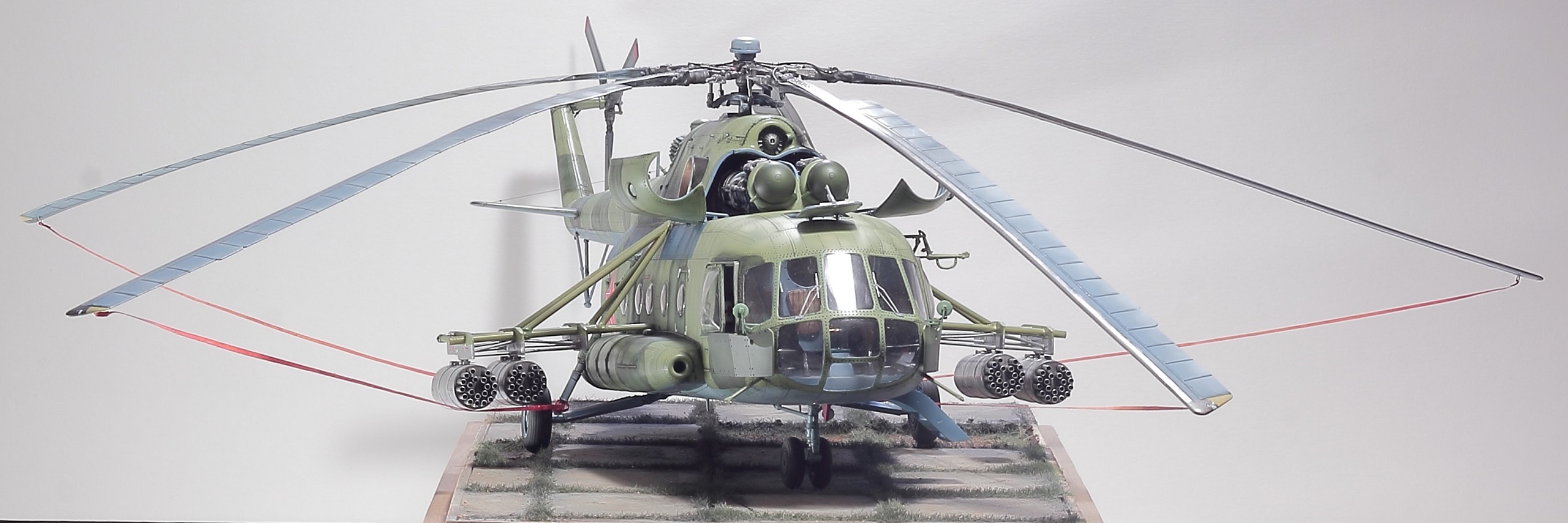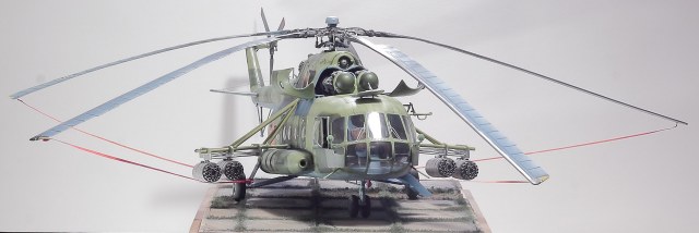 Модель собирал из коробки, за исключением балок вооружения с пилонами, нурсы взял с другой модели, сделал кресла в салоне, только их почти не видно. Модель вертолет делал впервые, перемудрил с наклоном лопастей. Красил автомобильной акриловой краской из аэра.
