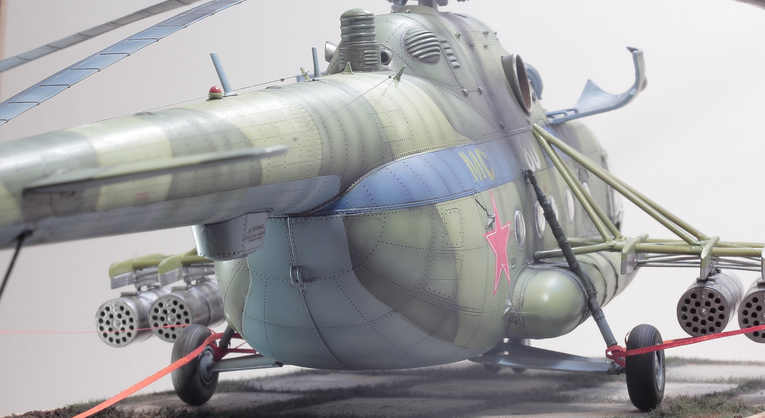 Покрашен здорово, а в деталях много вопросов. Провисли не только лопасти но и фермы вооружения, очень в глаза бросается. Лебедка должна быть ЛПГ-150, большая такая штуковина над входной дверью. Торцы труб ферм вооружения прокрашены красным и зеленым -это БАНО?