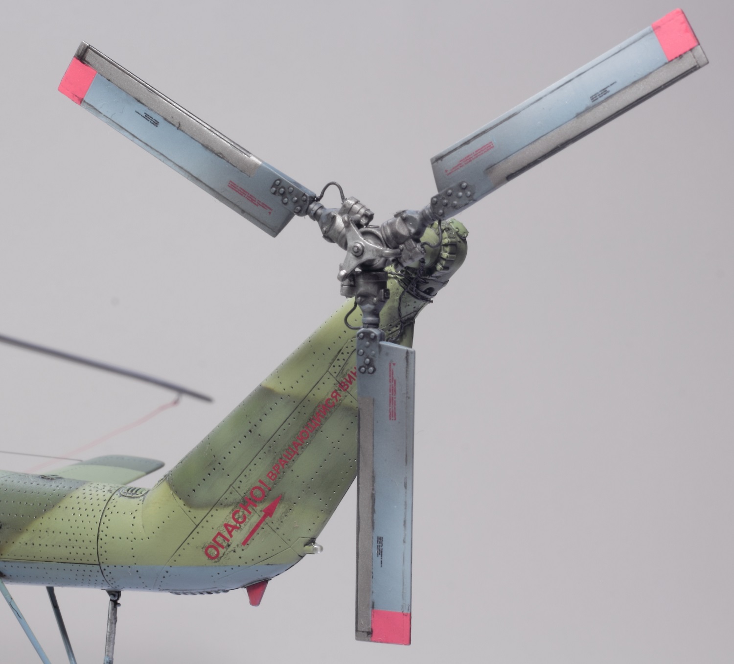 Это я по поводу перегиба лопастей. Можно лопасть согнуть до уровня головы, если швартовочными лентами подтягивать и в таком положении закрепить на стоянке. Но это нужно делать как минимум двумя-тремя жилистыми техниками. Только зачем? На практике, так никогда не делается. С небольшим усилием даже один техник подтягивает лопасть и закрепляет ленту за проушины. У модели на первом фото видно, лопасть нагнулась аж ниже хвостовой балки!!!! А швартовка даже провисшая.