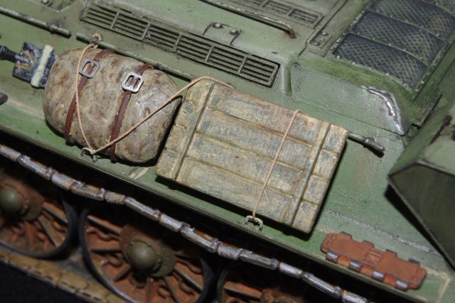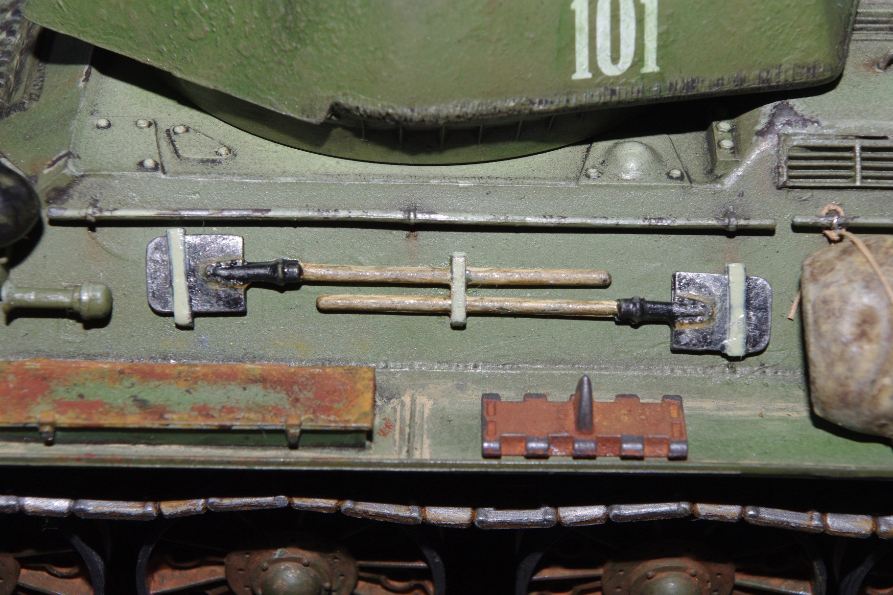 Не мудрствуя лукаво, подрезал пташке крылья (кто в теме, тот поймёт), заменил траки на MSD. Высверлил бойницу и глазки, добавил недостающих болтов на маске орудия, кое как захлопнул люки и вздёрнул ресничку. Восстановил утерянные скобы, ну, и некое подобие пулемётов. Газорезкой уже не заморачивался.