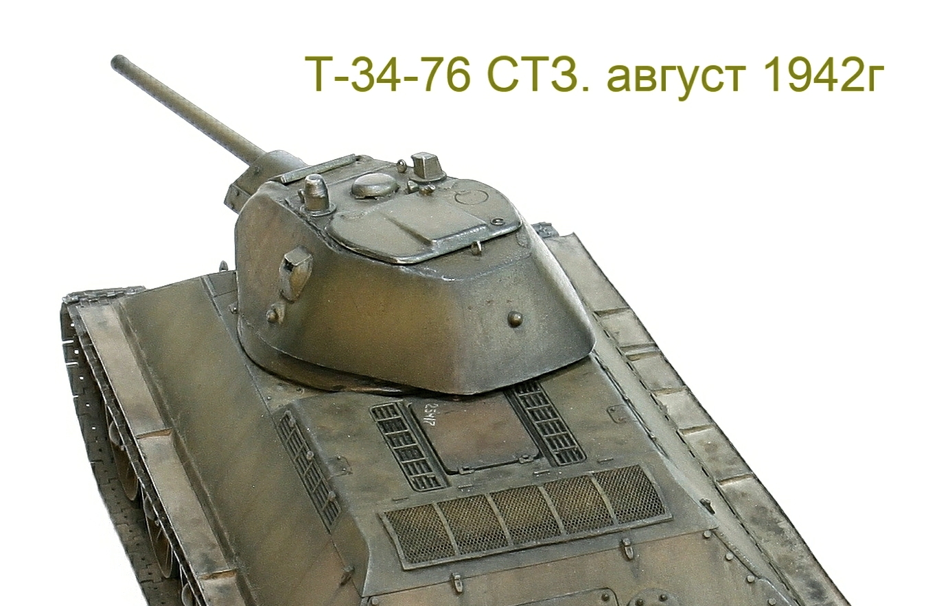 Т-34-76 СТЗ. август 1942г. Производитель: DRAGON, Звезда, самодел. ... Машина производства СТЗ , последней серии, августа 1942 года. Машина с литой башней характерной только для СТЗ. В 1942 г. на танки производства СТЗ устанавливались 2 основных вида литых башен с глухой кормой (с 06.1942) и спрямлённой бронировкой ПОУ. Первый вариант внешне полностью повторял башни 183 и ранние 112 заводов. Второй вариант, судя по снимкам, имел необычный прямой носовой литьевой шов . Башни отливались на Сталинградском Металлургическом заводе «Красный Октябрь» . Потом отправлялись на Сталинградский судостроительный завод, номер 264. Там башня доделывается и отправляется для окончательной сборки...