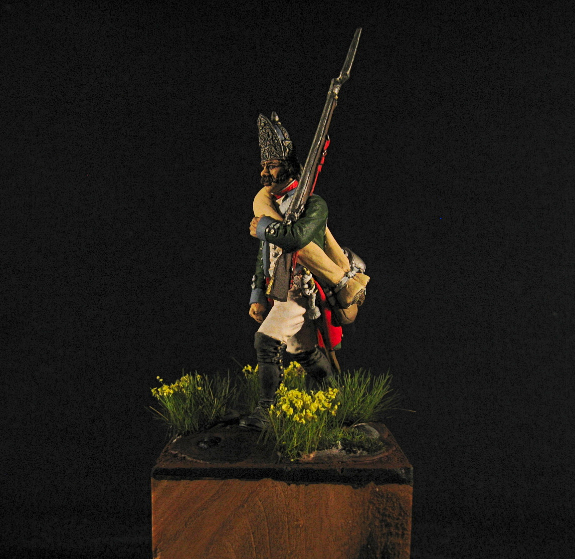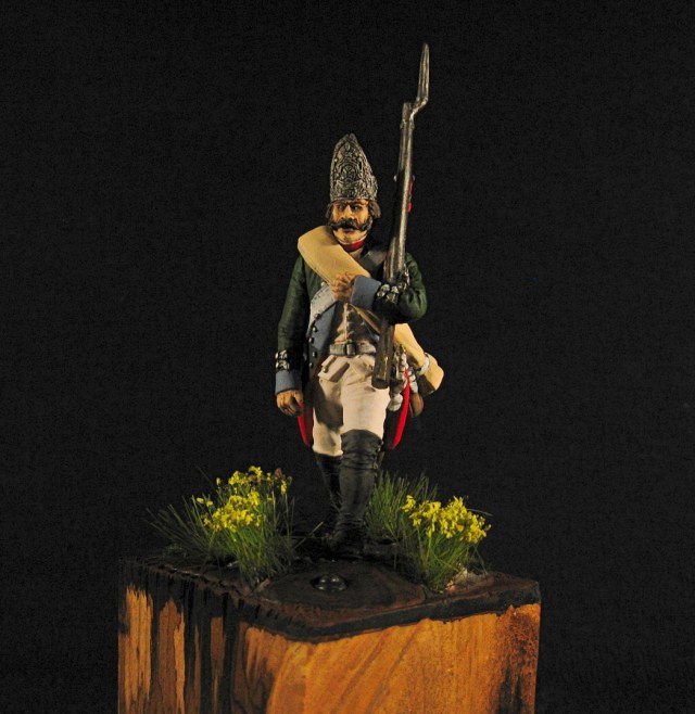 Здравствуйте. Вот такой фузилер, 2 фузилерная рота, 1 батальон, генерал-майора Жеребцова (Фанагорийский) гренадерского полка. 1799 год, Голландская экспедиция. 54 мм, акрил, эмаль.