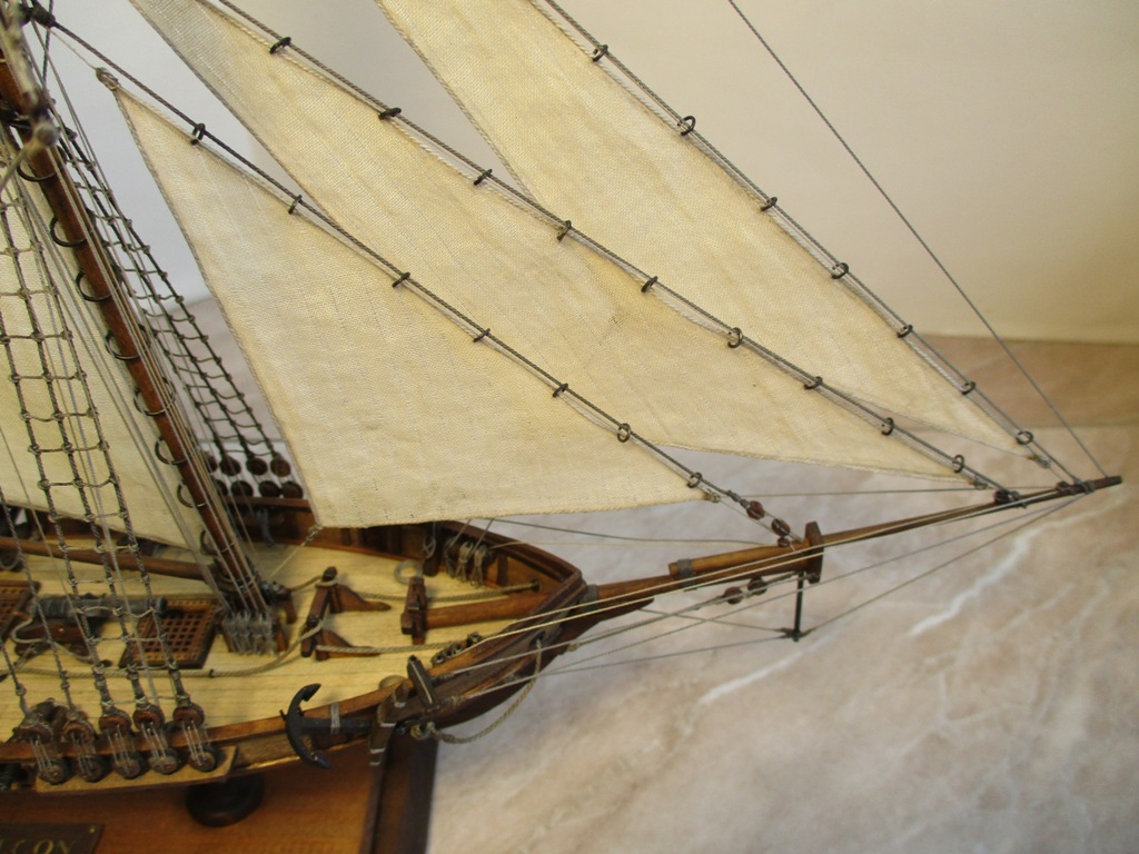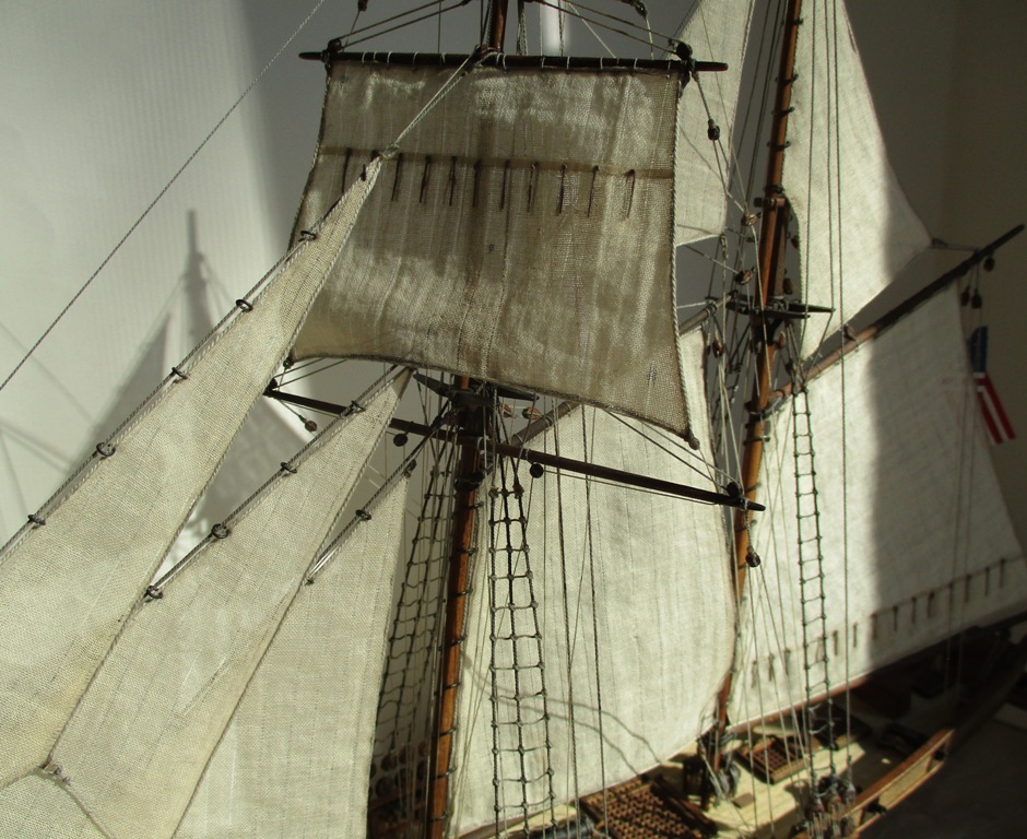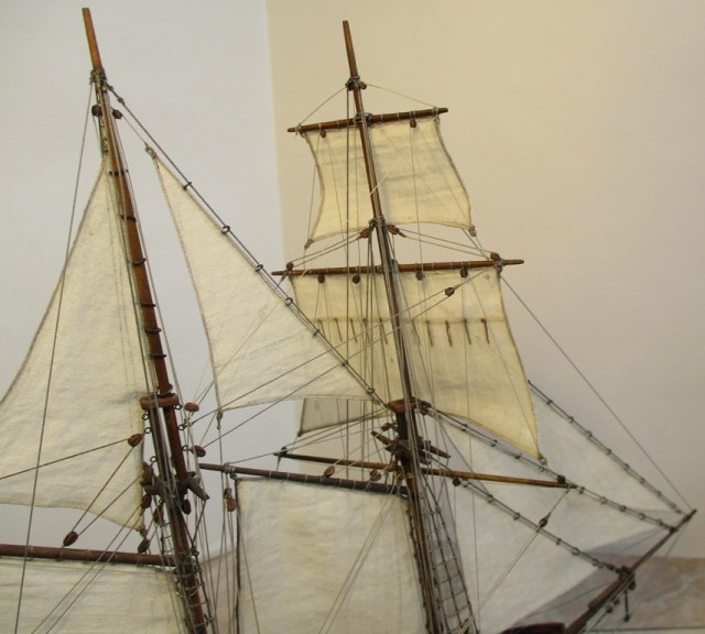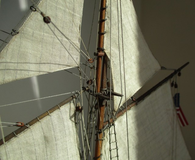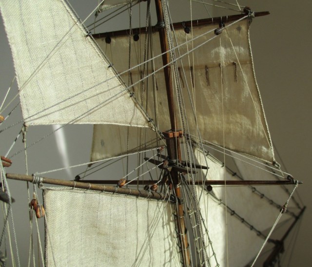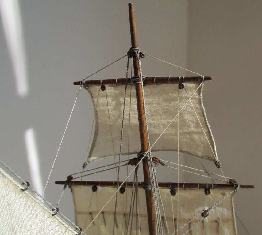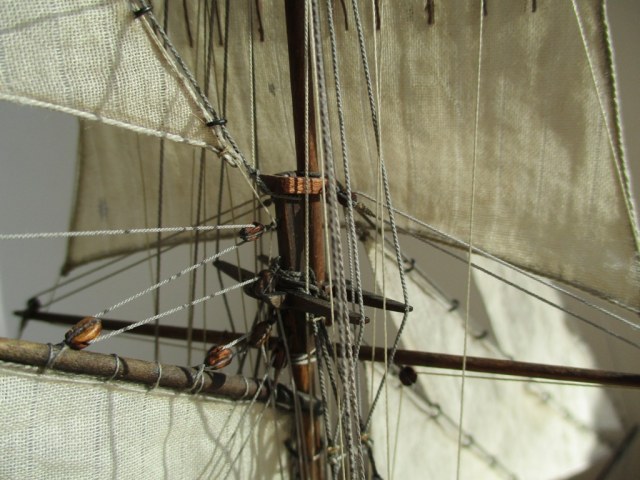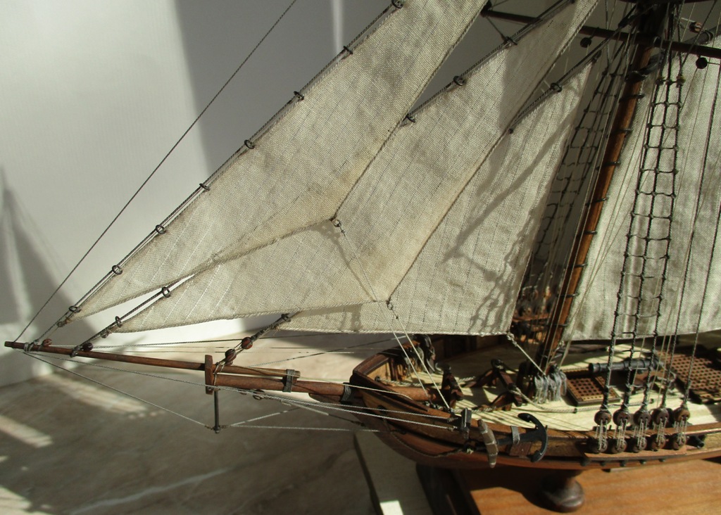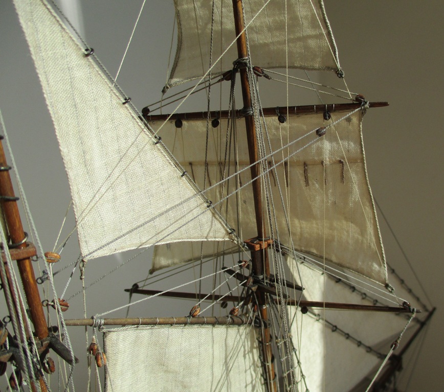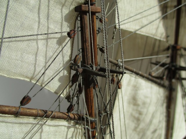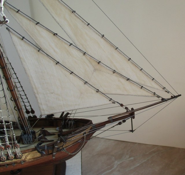 На модели нет грота-штага, на фор-стень вантах нет выбленок, гика-топенанты должны быть двойными (подветренный послаблялся, чтобы не мешать парусу), шкоты кливеров тоже двойные. На марселе показан риф-бант с сезнями, значит на марса-рее должны быть перты, иначе рифы не взять. Шкот грота заканчивался на утке на гике.