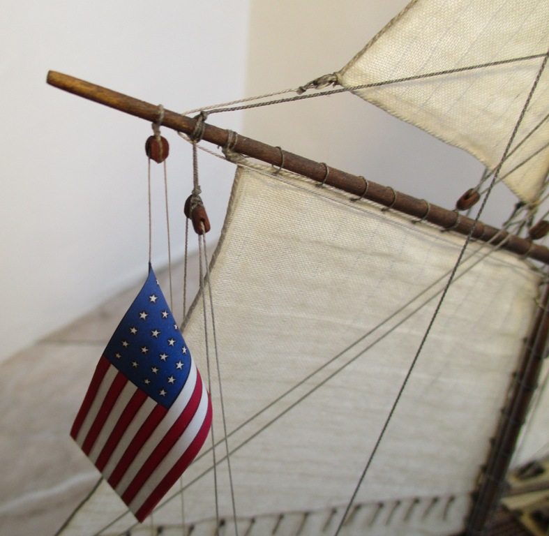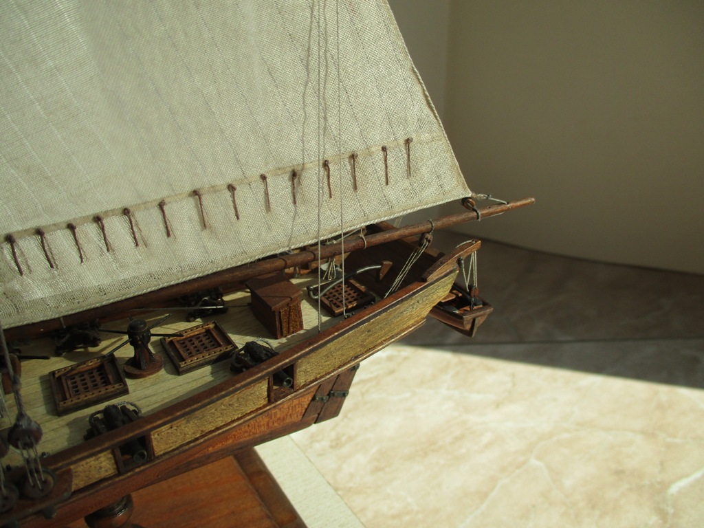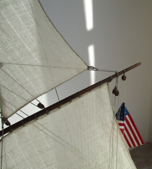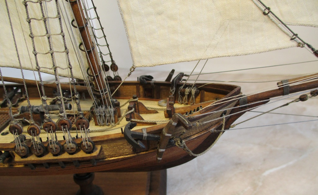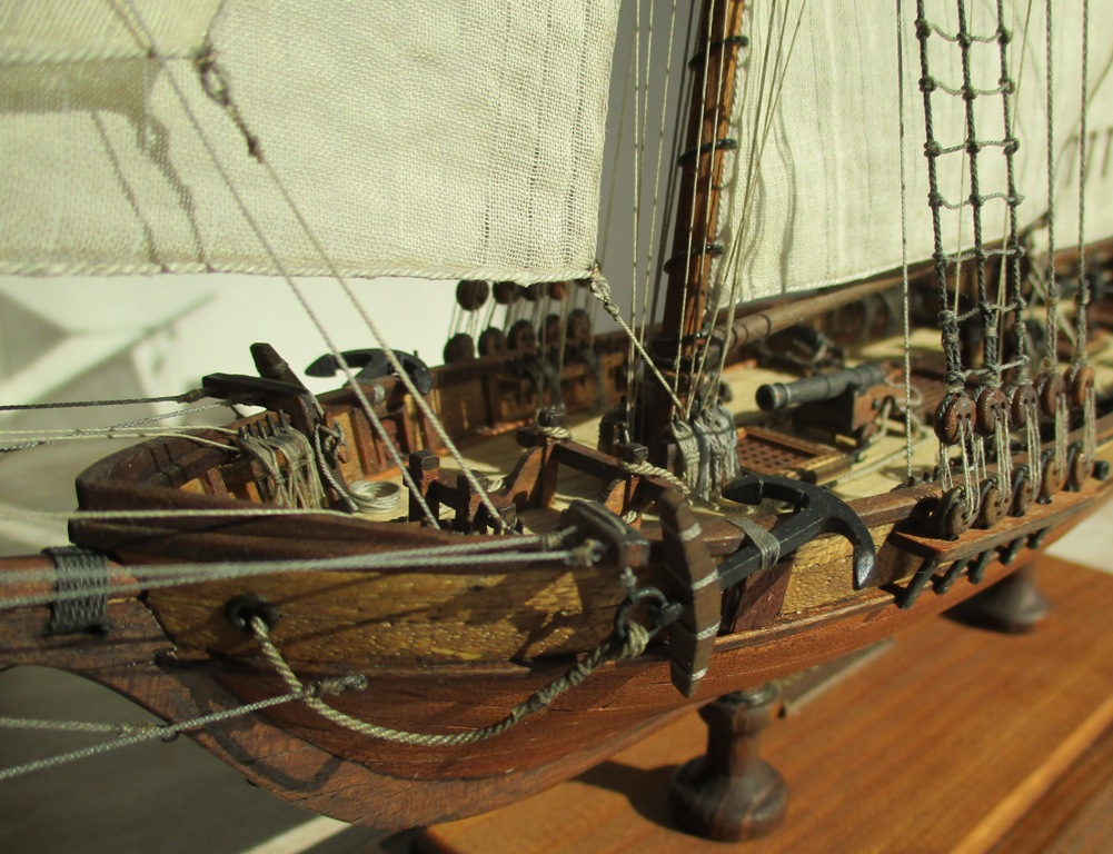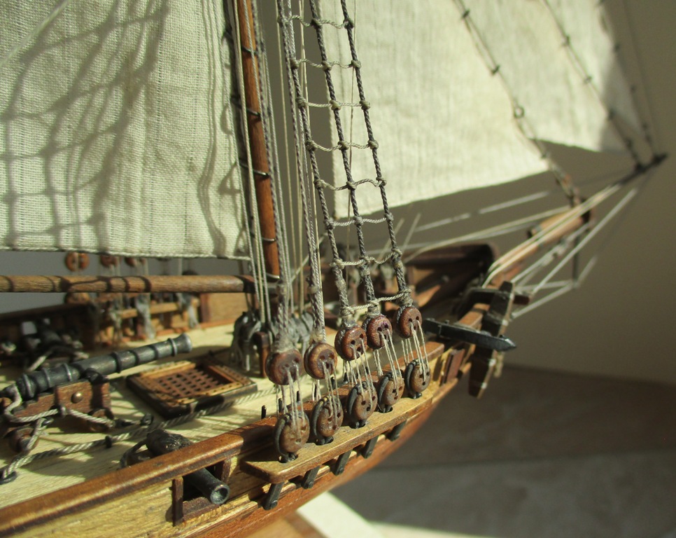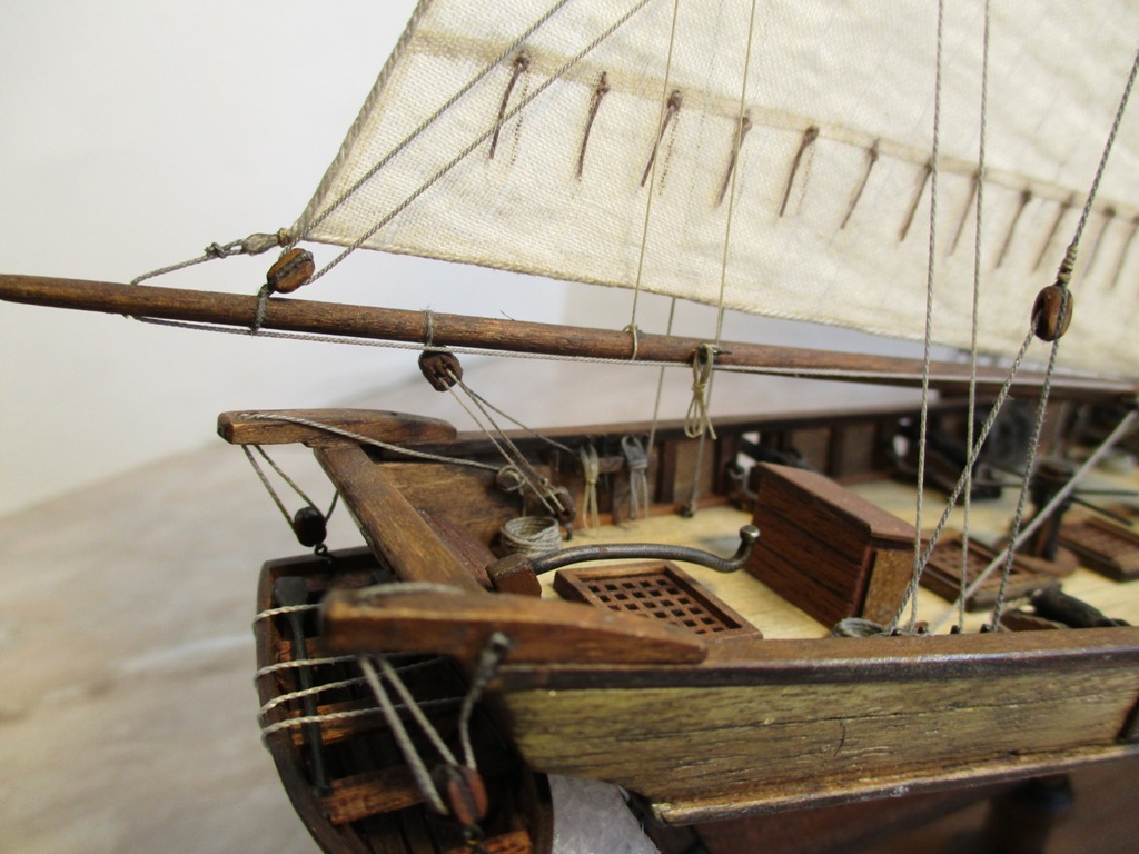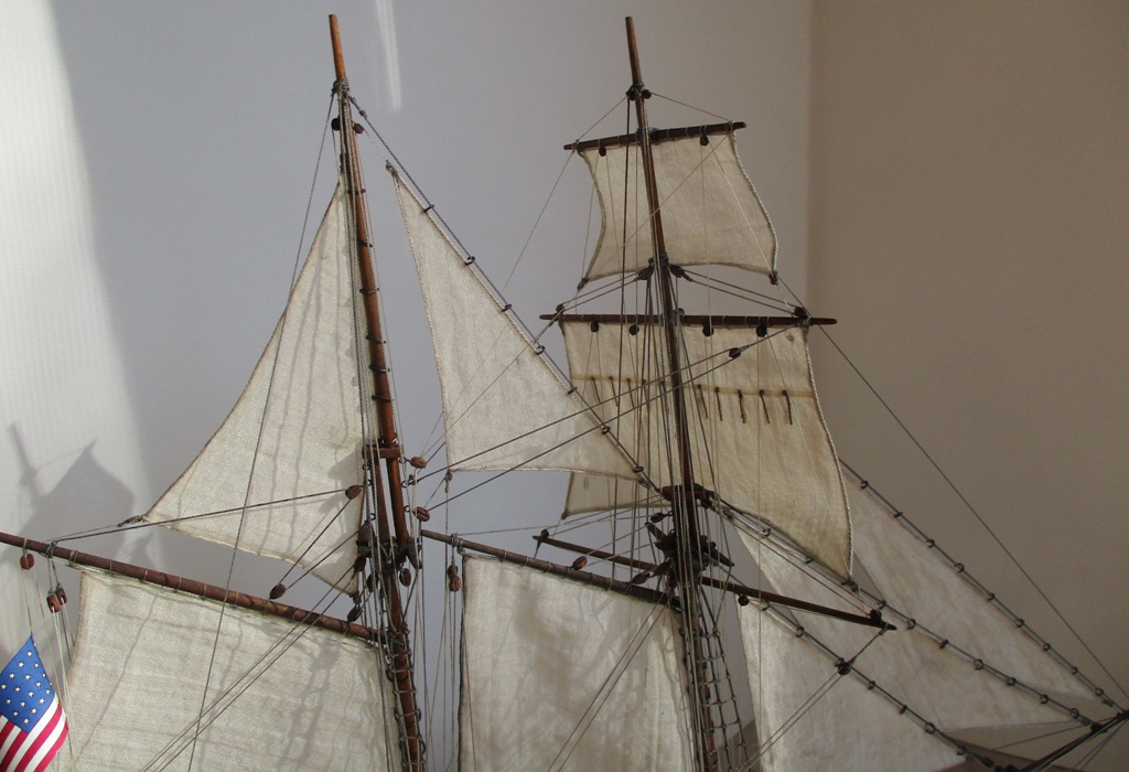 На модели нет грота-штага, на фор-стень вантах нет выбленок, гика-топенанты должны быть двойными (подветренный послаблялся, чтобы не мешать парусу), шкоты кливеров тоже двойные. На марселе показан риф-бант с сезнями, значит на марса-рее должны быть перты, иначе рифы не взять. Шкот грота заканчивался на утке на гике.