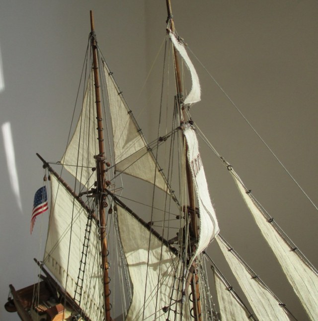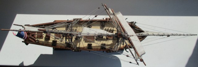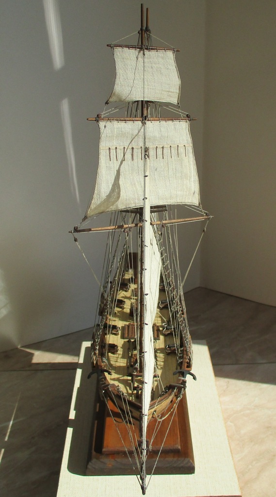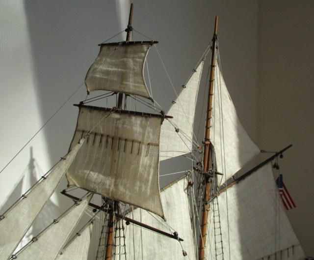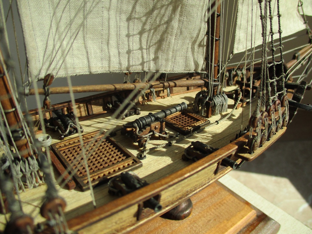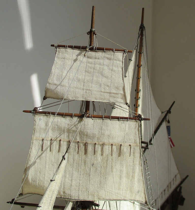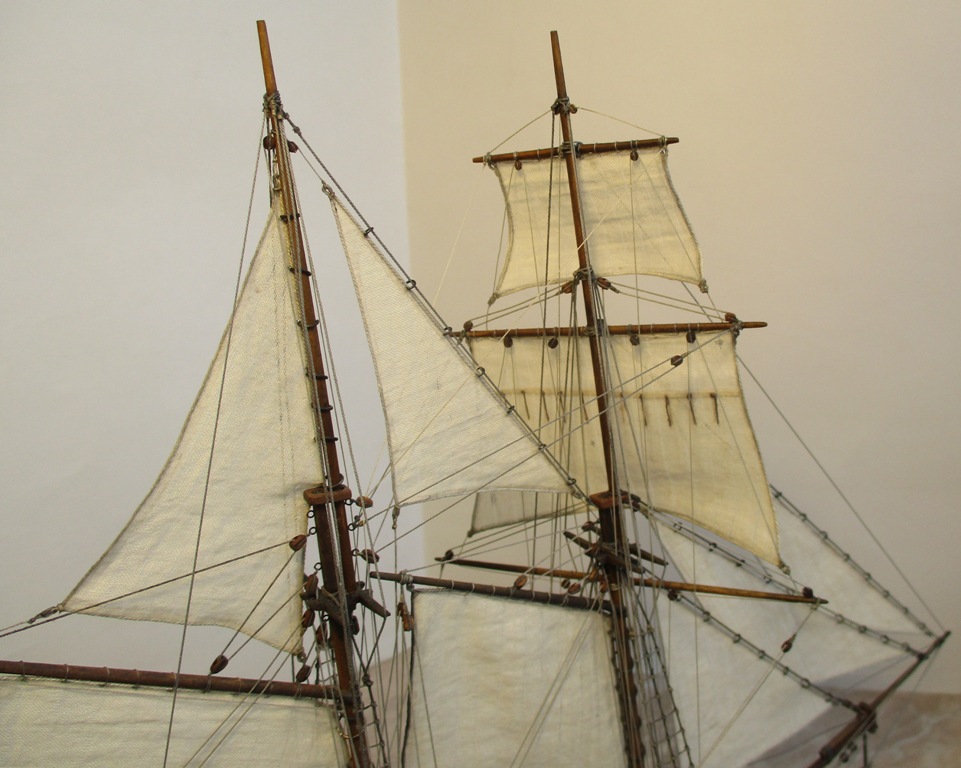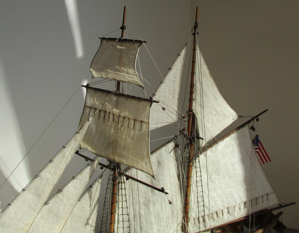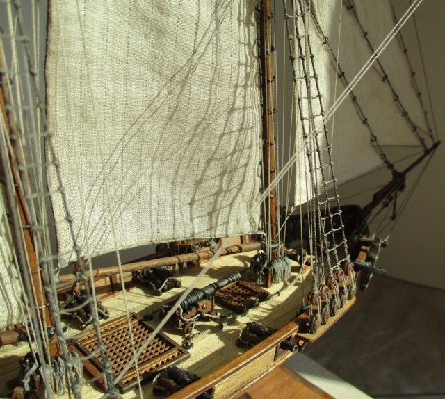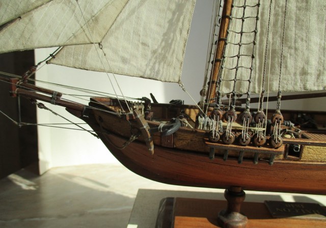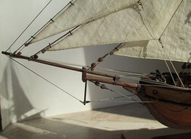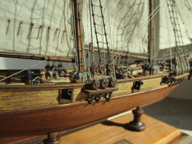 На модели нет грота-штага, на фор-стень вантах нет выбленок, гика-топенанты должны быть двойными (подветренный послаблялся, чтобы не мешать парусу), шкоты кливеров тоже двойные. На марселе показан риф-бант с сезнями, значит на марса-рее должны быть перты, иначе рифы не взять. Шкот грота заканчивался на утке на гике.