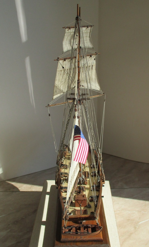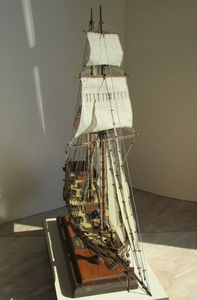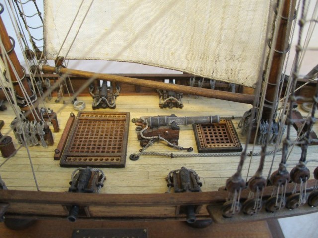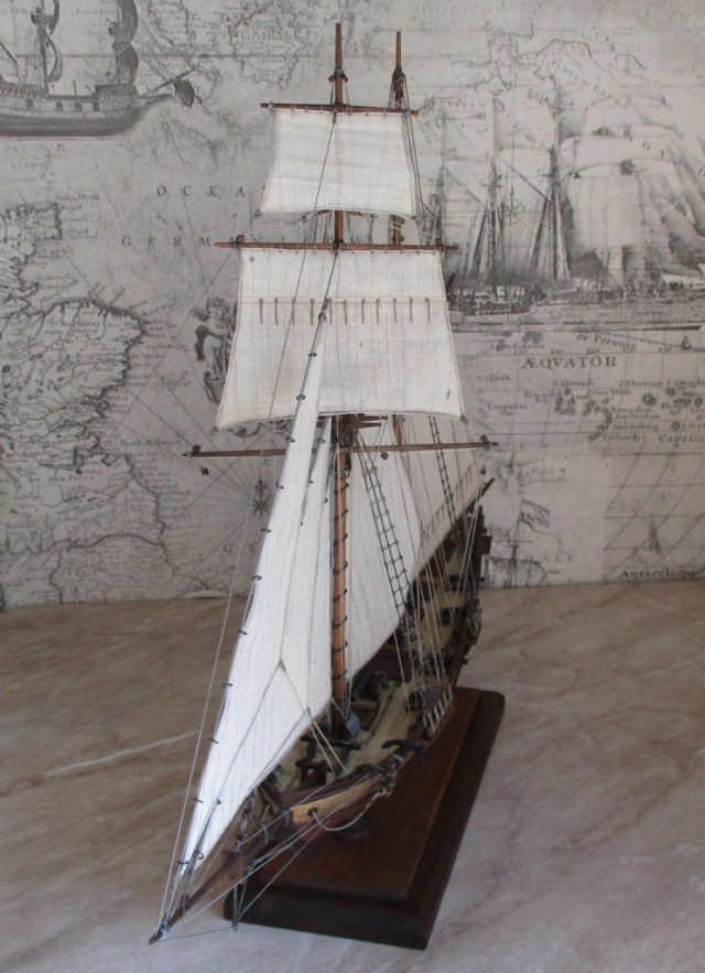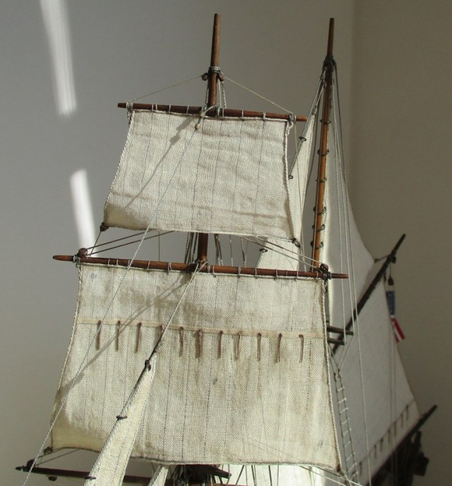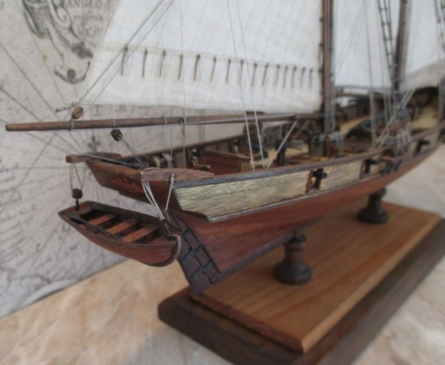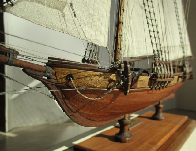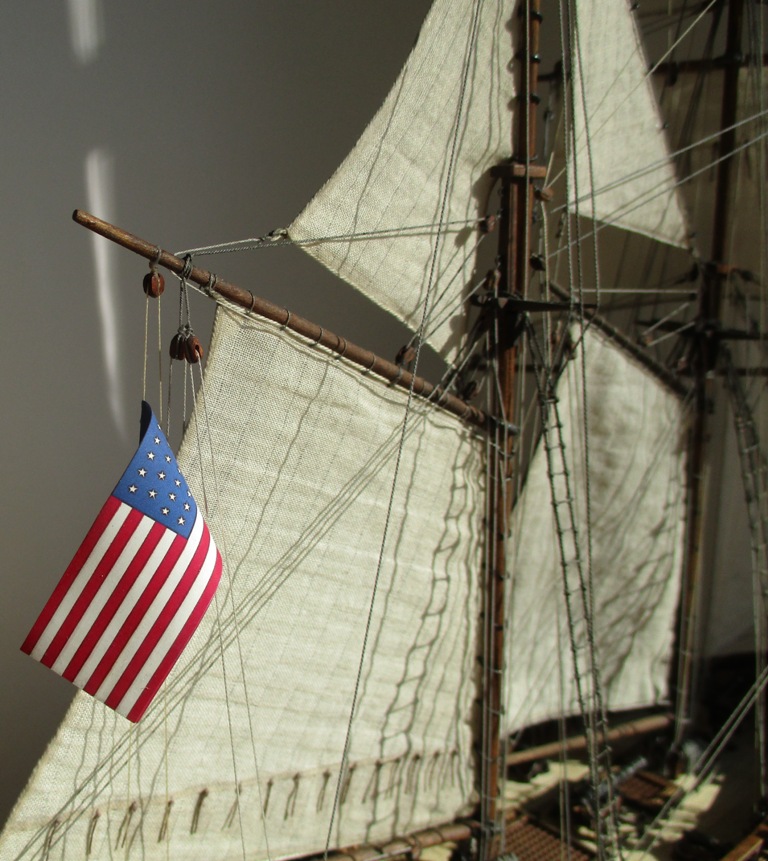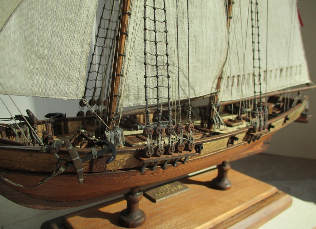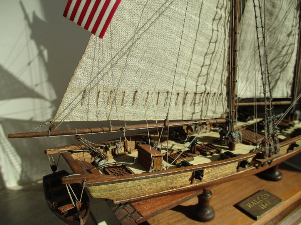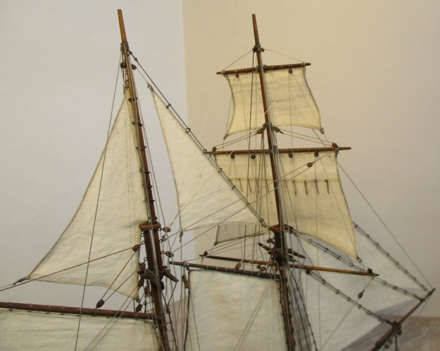 На модели нет грота-штага, на фор-стень вантах нет выбленок, гика-топенанты должны быть двойными (подветренный послаблялся, чтобы не мешать парусу), шкоты кливеров тоже двойные. На марселе показан риф-бант с сезнями, значит на марса-рее должны быть перты, иначе рифы не взять. Шкот грота заканчивался на утке на гике.