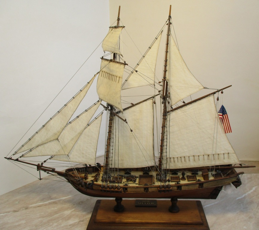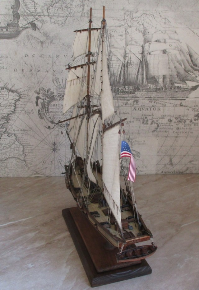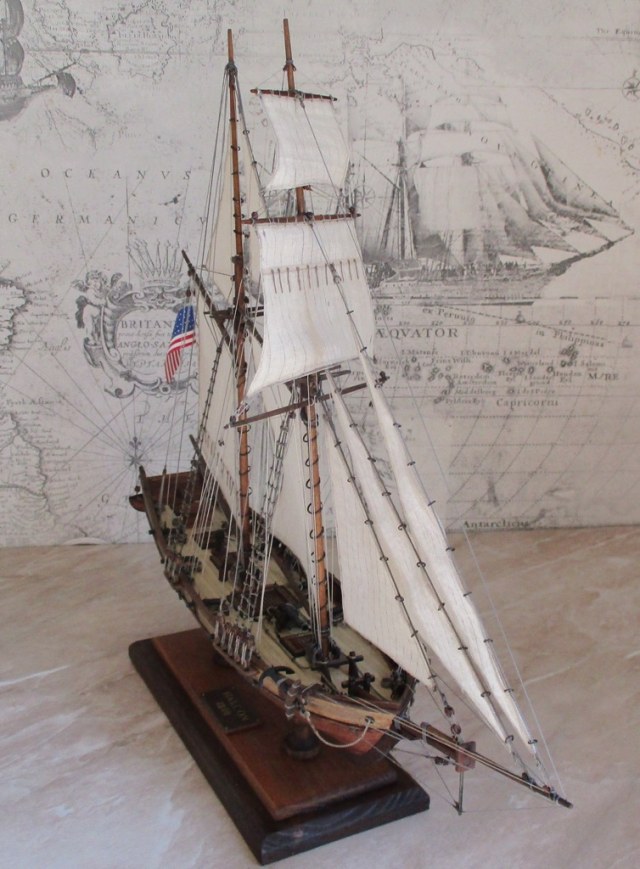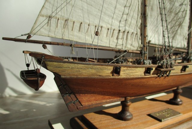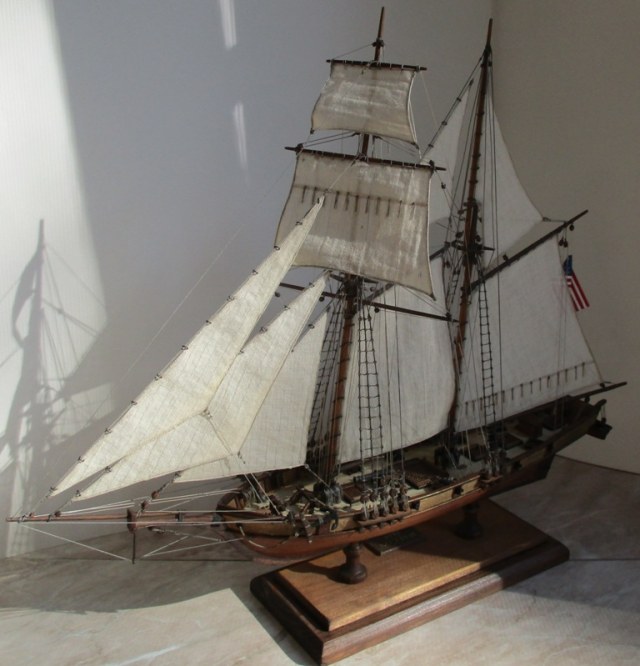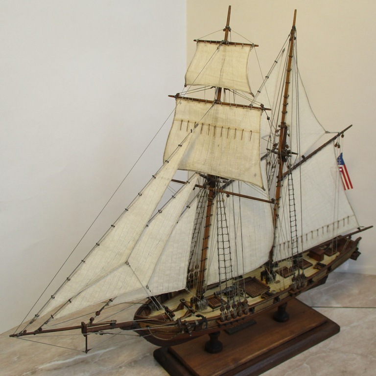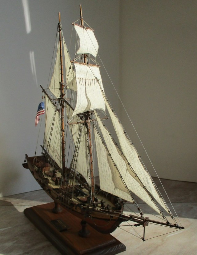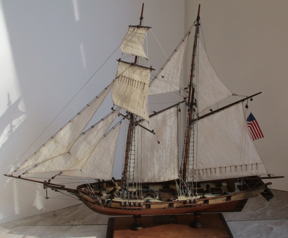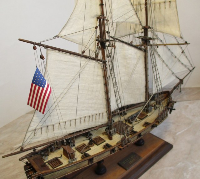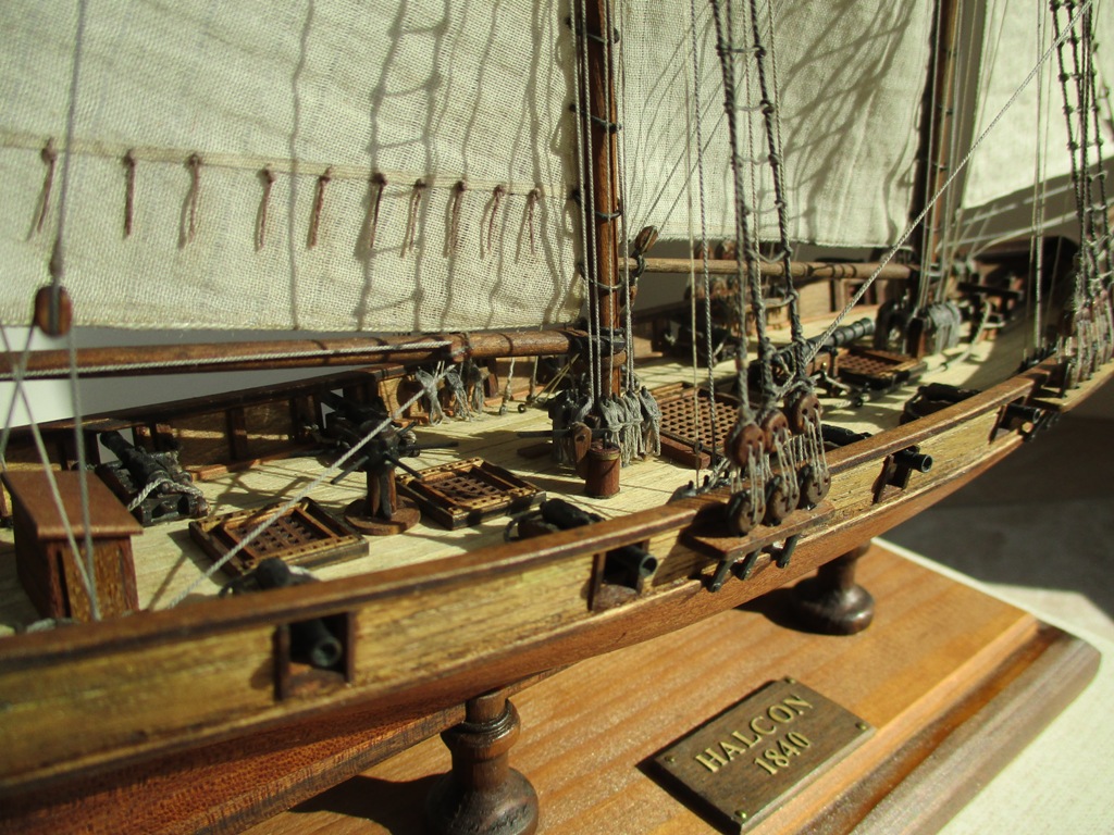 На модели нет грота-штага, на фор-стень вантах нет выбленок, гика-топенанты должны быть двойными (подветренный послаблялся, чтобы не мешать парусу), шкоты кливеров тоже двойные. На марселе показан риф-бант с сезнями, значит на марса-рее должны быть перты, иначе рифы не взять. Шкот грота заканчивался на утке на гике.
