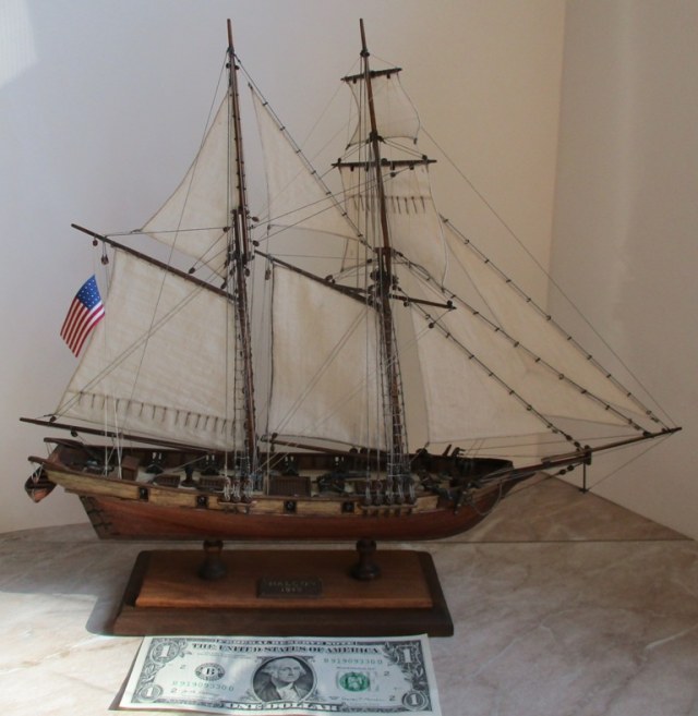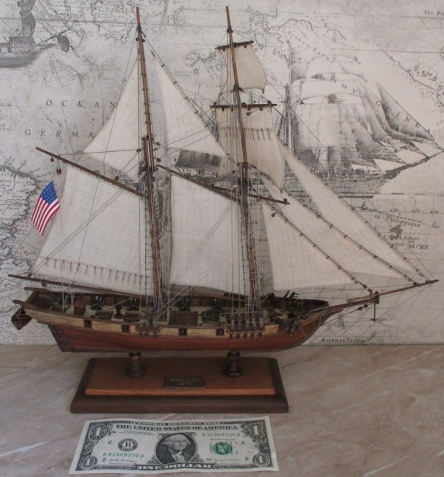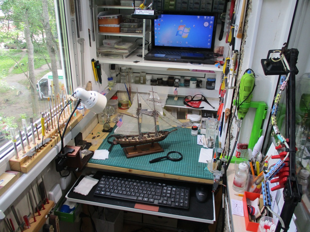 Когда-то я увидел в интернете картину шхуны, и сразу же полюбил эту картину, распечатал ее на натуральном холсте (на принтере), придумал ей рамку, повесил на стену. И загорелся сделать под эту картину шхуну. В общем такая вот композиция, китайский набор шхуны 1:100 (никакой), но и стоит никак :-) потому практически, применял все подряд, картинки, элементарные чертежи. Большую часть из головы.