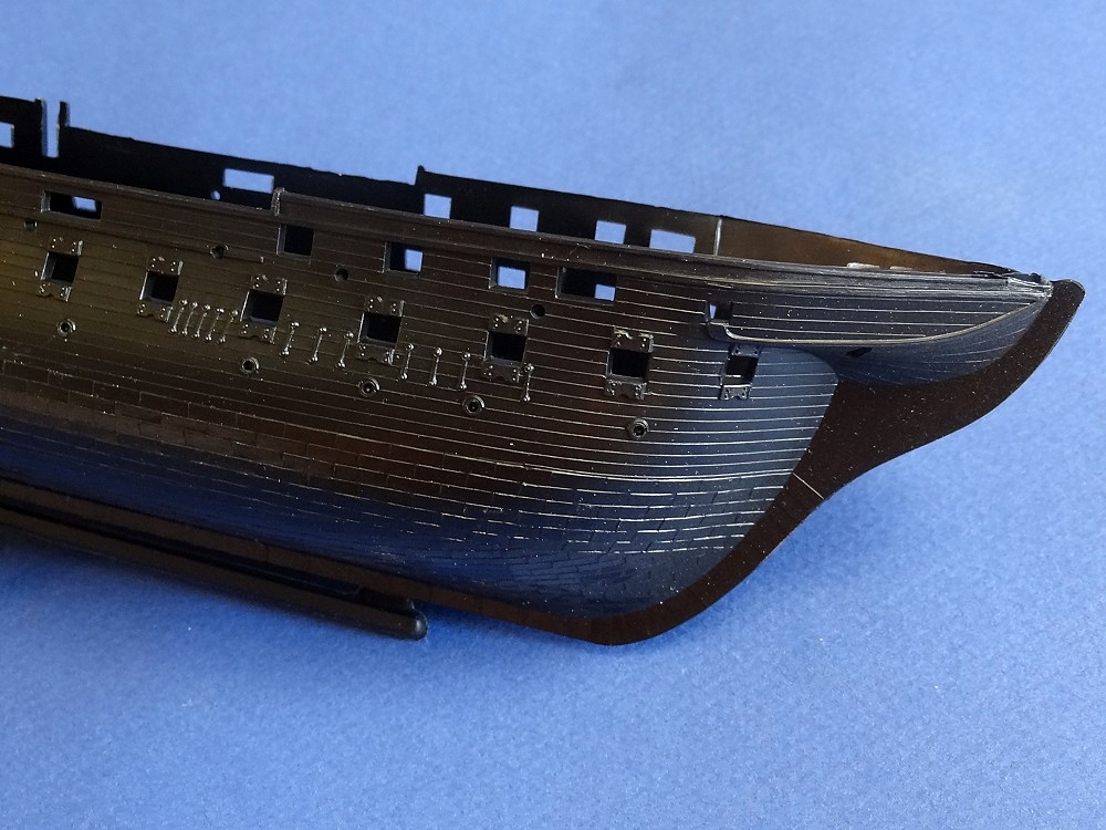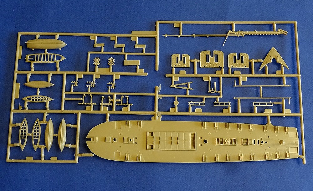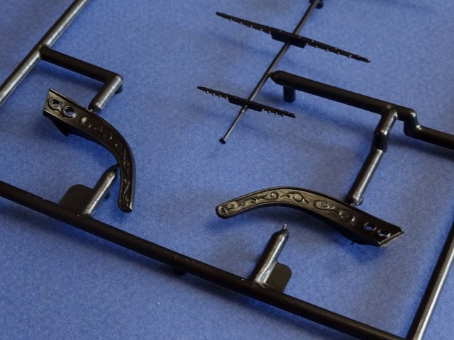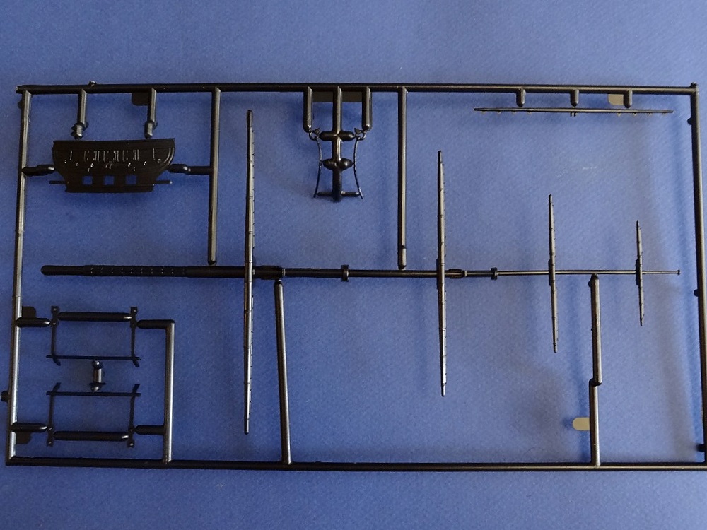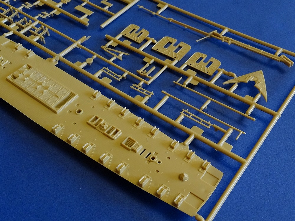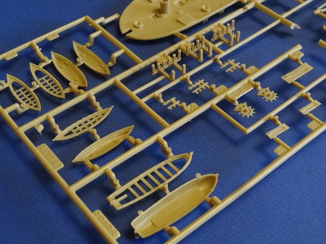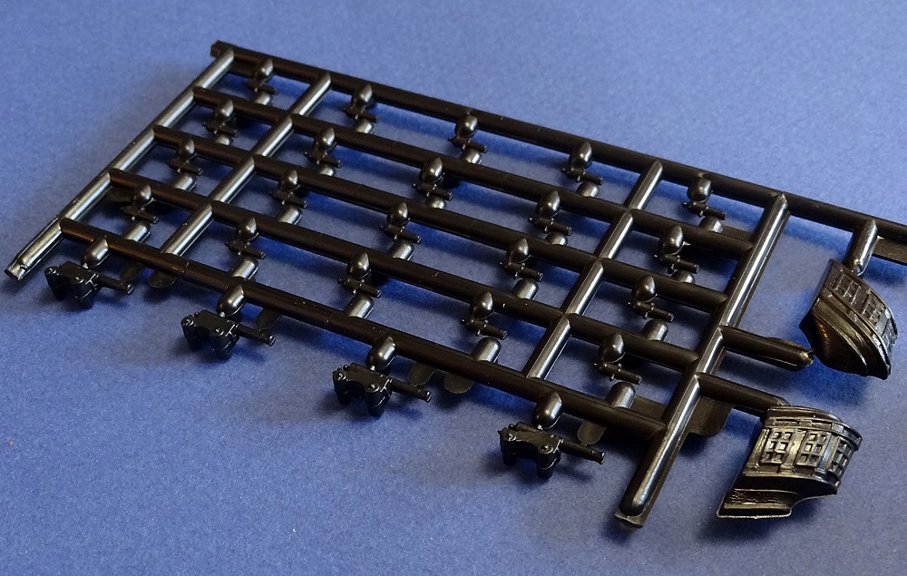 Корпус судна сделан одной единой монолитной деталью. Корпус отлит очень хорошо: толкатели, облой, следы пресс-форм или различные неровности не обнаружены, дефектов нет, но на мой взгляд расшивка на корпусе смотрится несколько не масштабно. Так-же одной деталью отлиты мачты с реями и орудийная палуба с уже орудиями на ней. На палубе сделана имитация древесины. Другие детали судна так же выполнены без каких либо дефектов. Всего в набор входит 105 деталей.