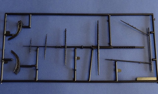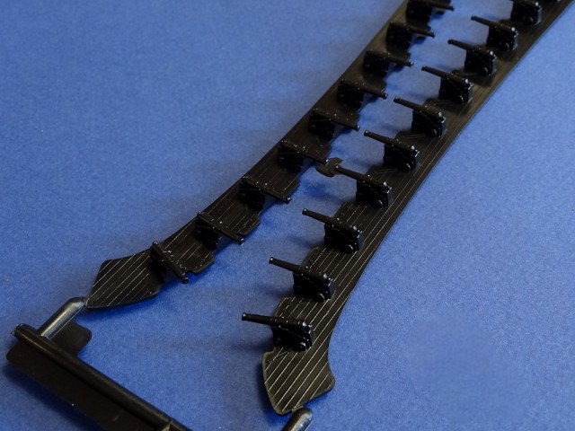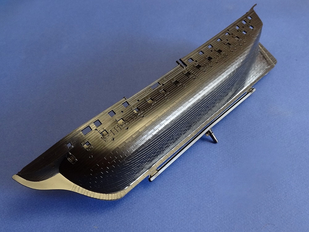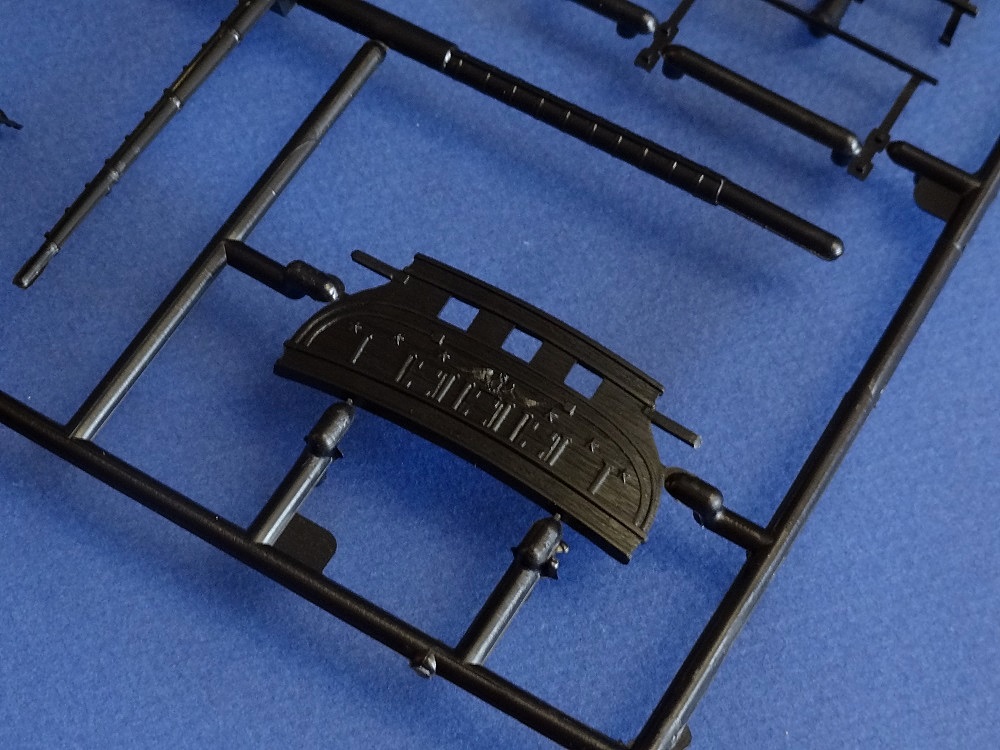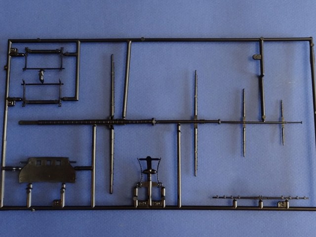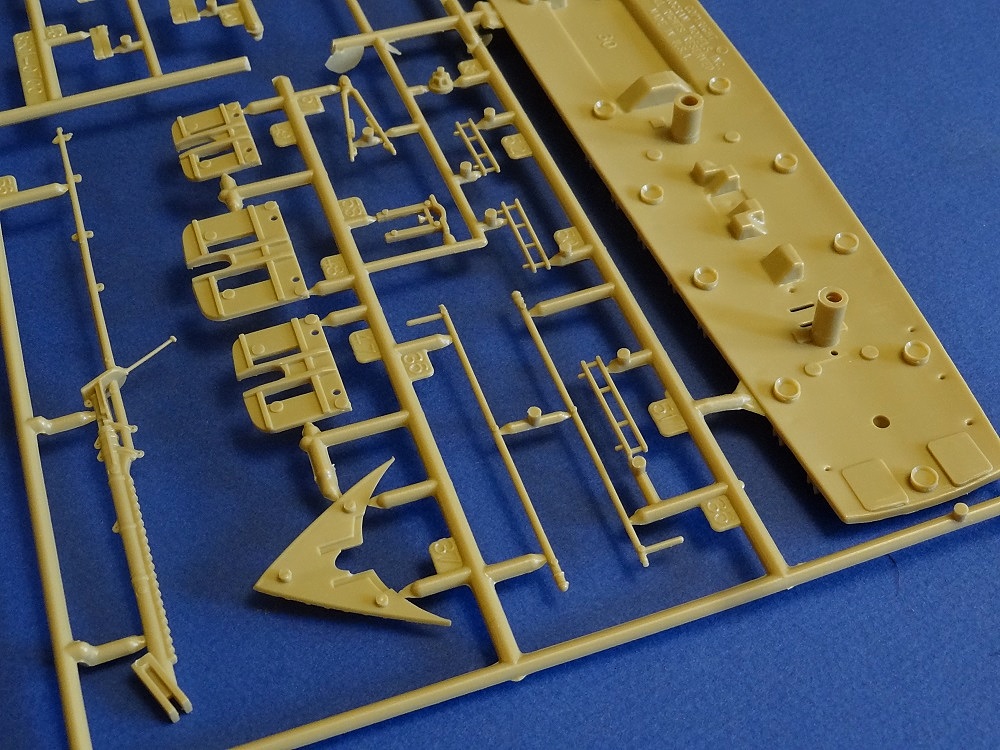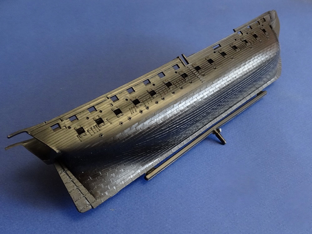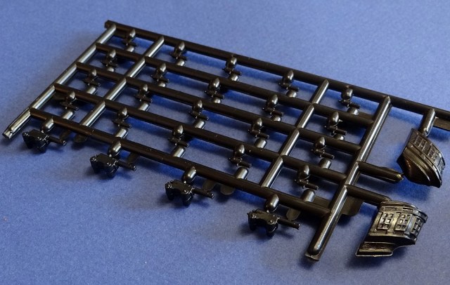 Корпус судна сделан одной единой монолитной деталью. Корпус отлит очень хорошо: толкатели, облой, следы пресс-форм или различные неровности не обнаружены, дефектов нет, но на мой взгляд расшивка на корпусе смотрится несколько не масштабно. Так-же одной деталью отлиты мачты с реями и орудийная палуба с уже орудиями на ней. На палубе сделана имитация древесины. Другие детали судна так же выполнены без каких либо дефектов. Всего в набор входит 105 деталей.