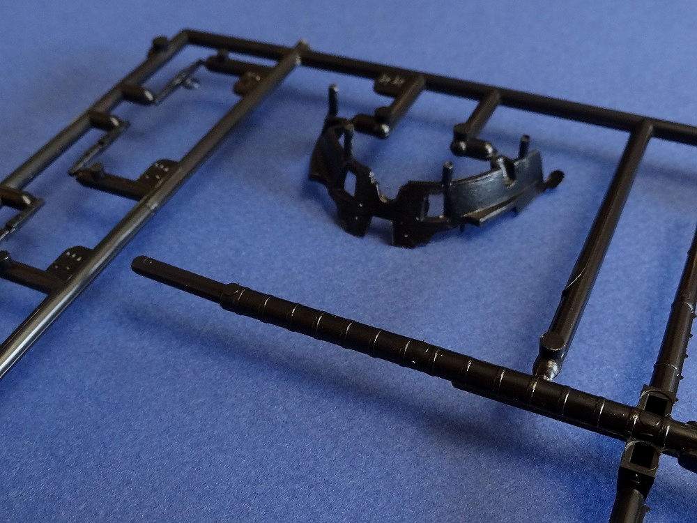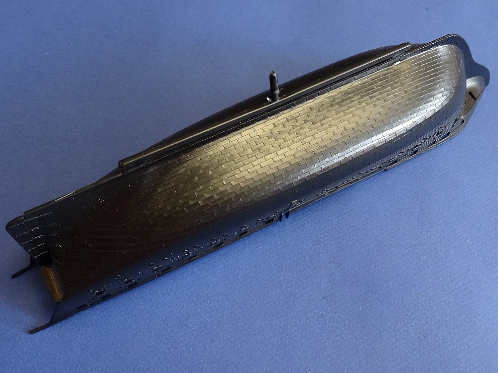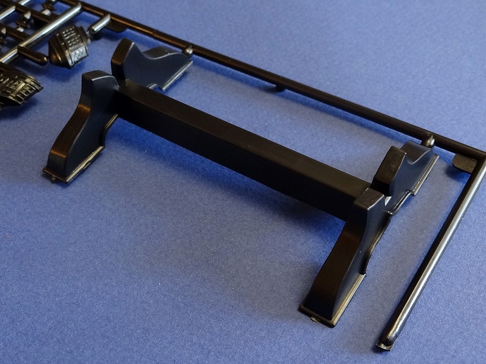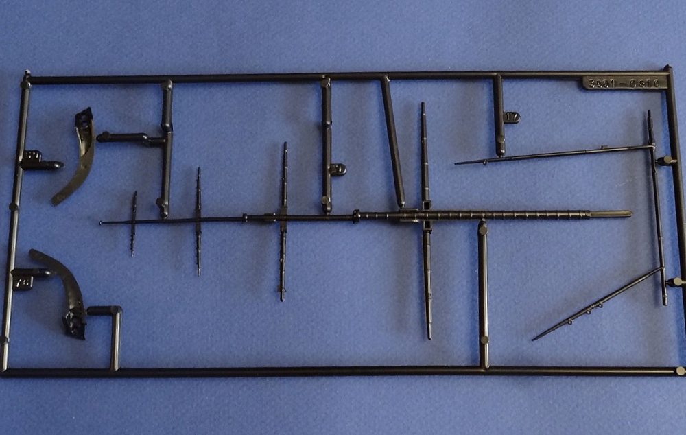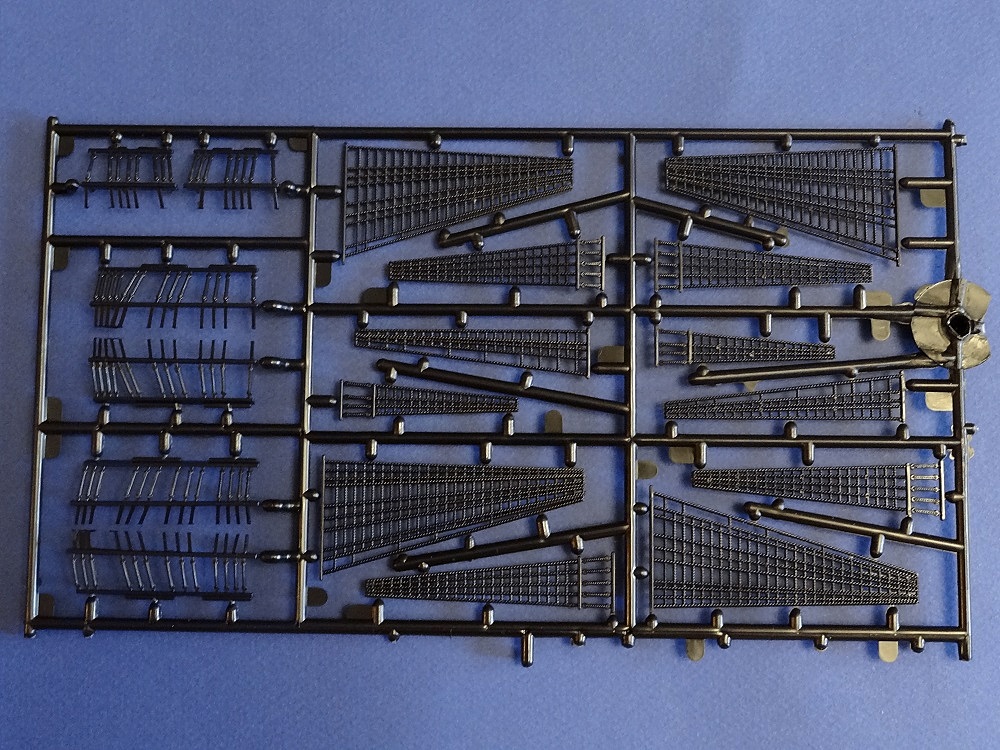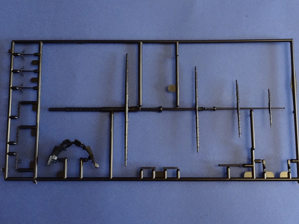 Корпус судна сделан одной единой монолитной деталью. Корпус отлит очень хорошо: толкатели, облой, следы пресс-форм или различные неровности не обнаружены, дефектов нет, но на мой взгляд расшивка на корпусе смотрится несколько не масштабно. Так-же одной деталью отлиты мачты с реями и орудийная палуба с уже орудиями на ней. На палубе сделана имитация древесины. Другие детали судна так же выполнены без каких либо дефектов. Всего в набор входит 105 деталей.