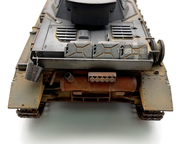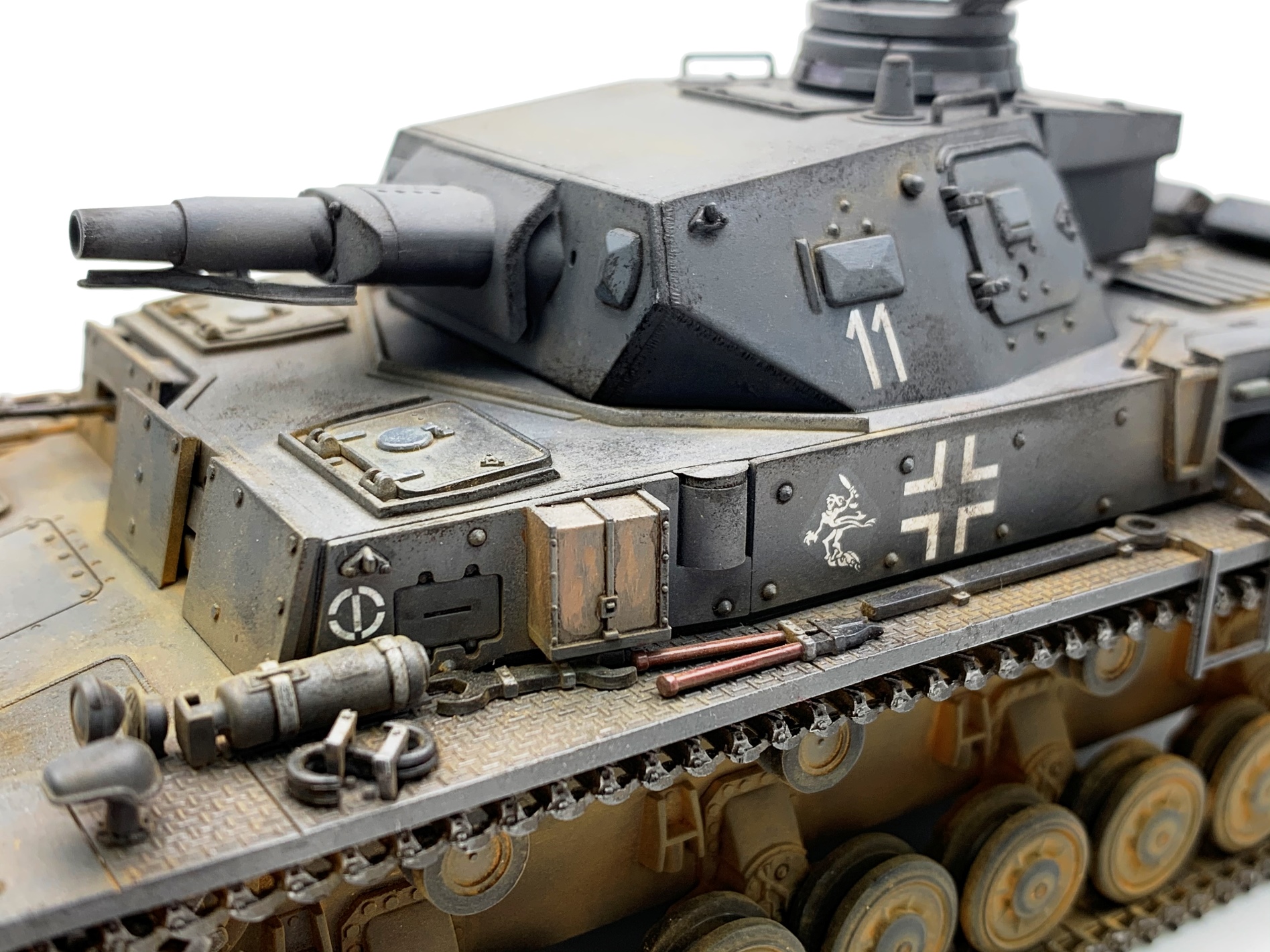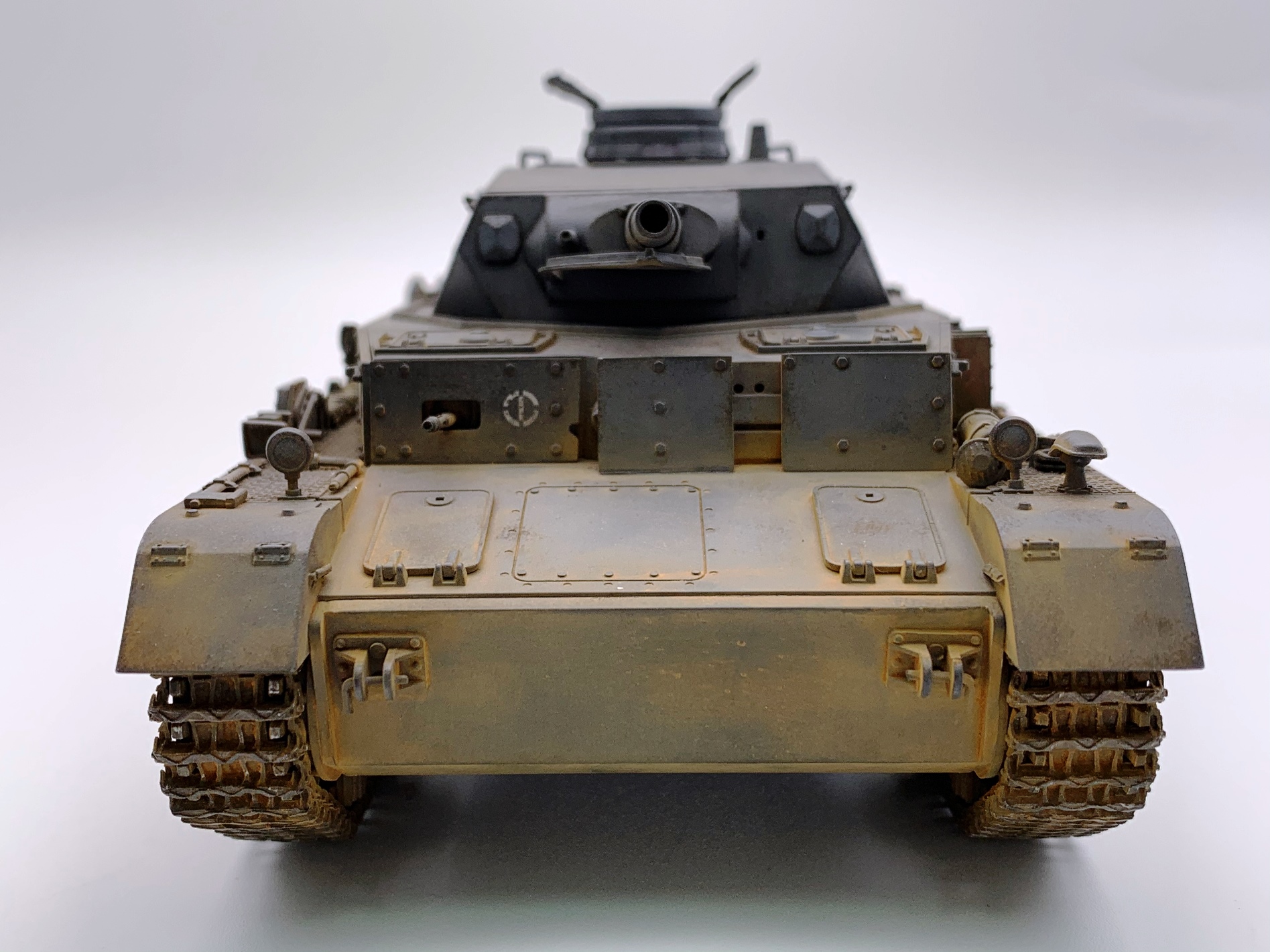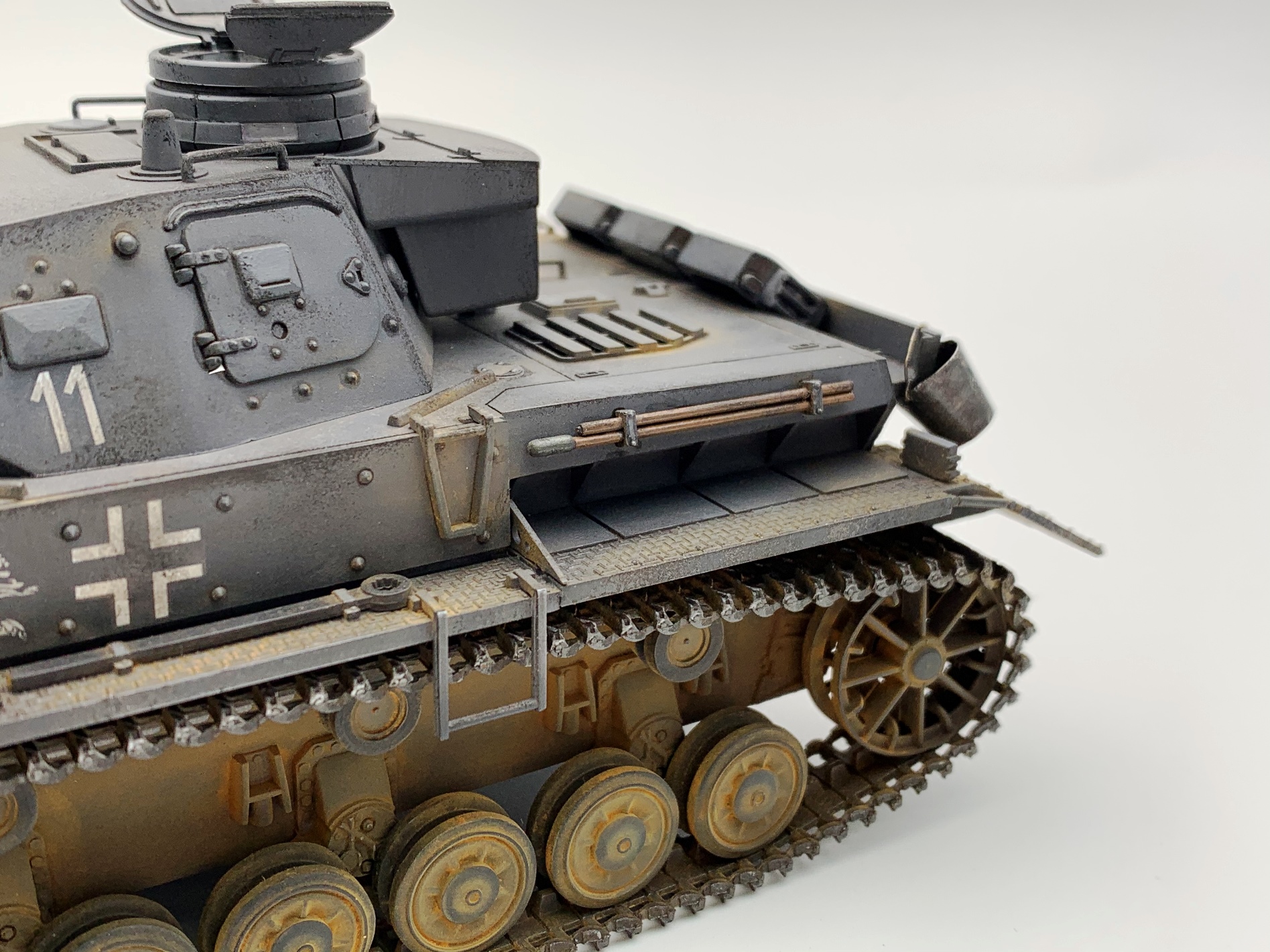 Для третьей модели- супер!!! А вот образ 11 ТД вермахта не вполне соответствует. Такого крепления канистр в этой дивизии не встречалось на "четверках" модификаций Е, D, F1. Этим модификациям в 11 ТД присущи большие самодельные ящики на корме танка над блоком системы дымопуска. Запасные катки в этой ТД на вышеуказанных модификациях Pz. Kpfw. IV крепились по краям верхней кормовой бронеплиты (иногда один каток крепили в слева в кормовой части надмоторной плиты), но никак не на надгусеничных полках. Эмблемы и номера дивизии изображены и расположены верно, но не хватает номера на забашенном ящике в центральной верхней его части. Это никак не модификация Е (полностью согласен с Сергеем), это D- шка. И, наконец, надо было использовать люки без вентиляционных решеток на надмоторной плите, коли Вы решили изобразить танк 11 ТД. Люки с решетками на D-шки ставили для отправки в Africa Korps, на все остальные D-шки, отправляемые на европейские ТВД ставили люки сплошные- в наборе они есть.