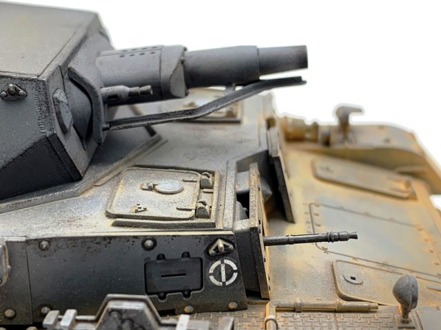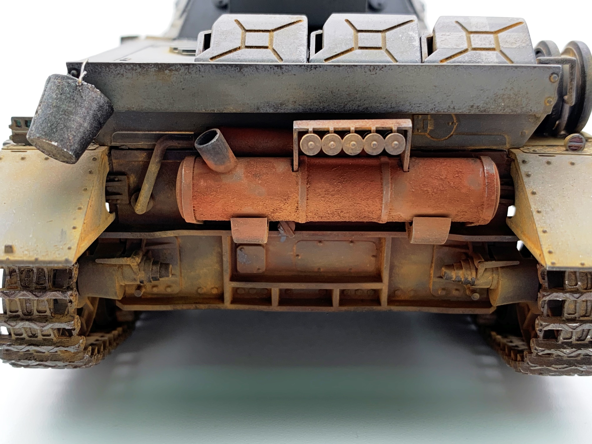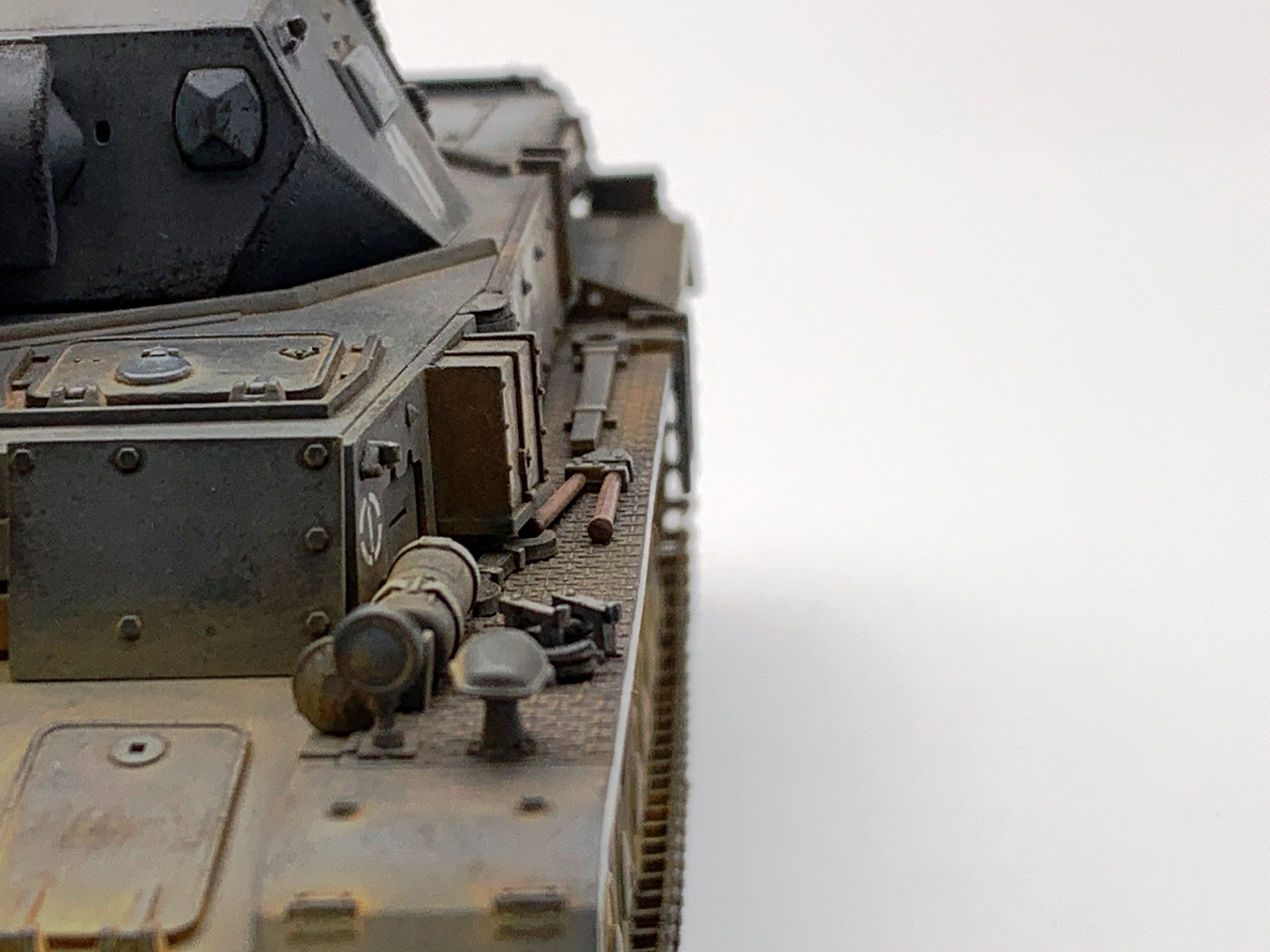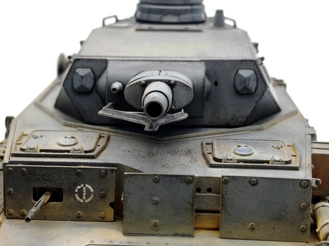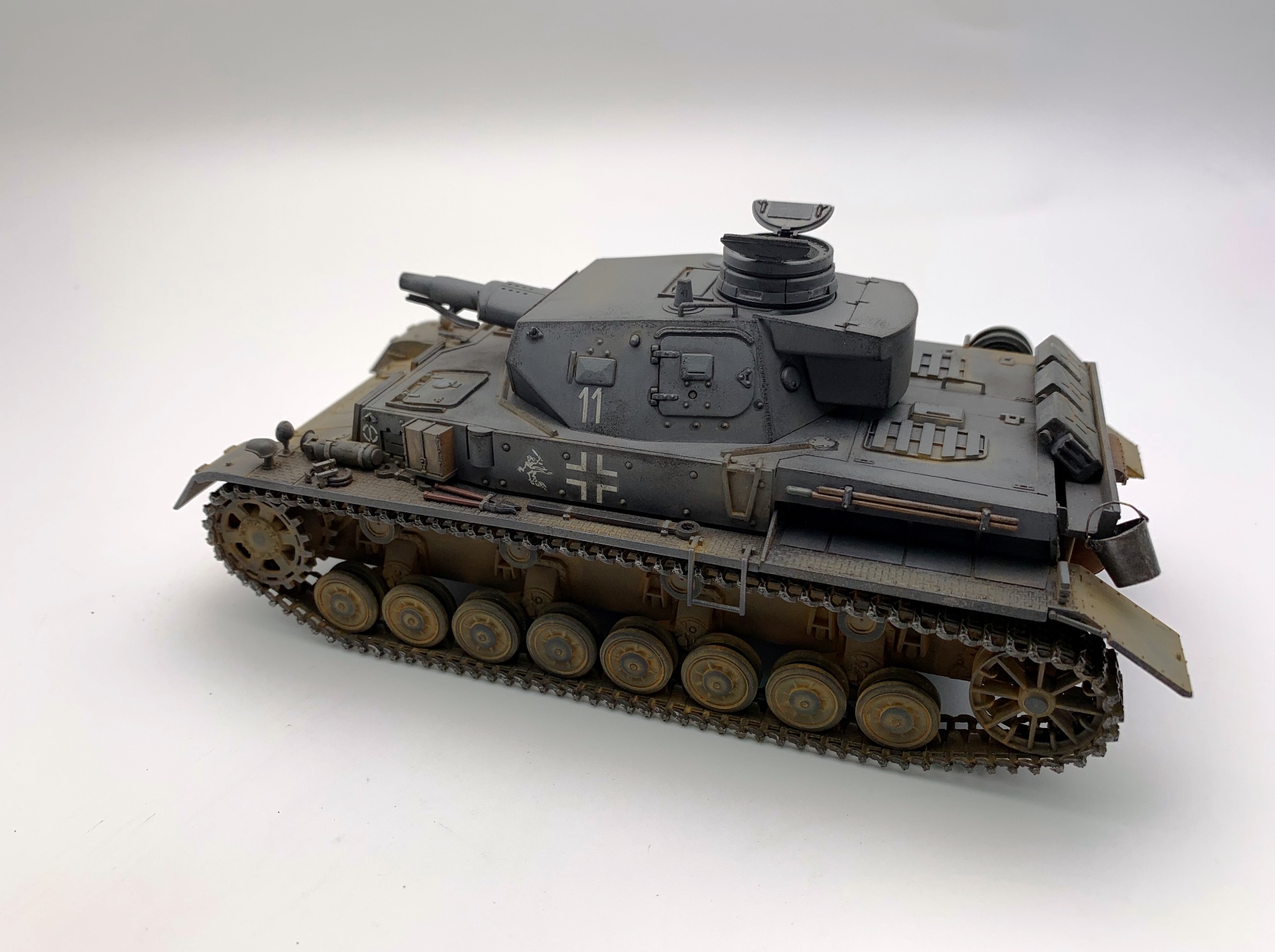 Для третьей модели- супер!!! А вот образ 11 ТД вермахта не вполне соответствует. Такого крепления канистр в этой дивизии не встречалось на "четверках" модификаций Е, D, F1. Этим модификациям в 11 ТД присущи большие самодельные ящики на корме танка над блоком системы дымопуска. Запасные катки в этой ТД на вышеуказанных модификациях Pz. Kpfw. IV крепились по краям верхней кормовой бронеплиты (иногда один каток крепили в слева в кормовой части надмоторной плиты), но никак не на надгусеничных полках. Эмблемы и номера дивизии изображены и расположены верно, но не хватает номера на забашенном ящике в центральной верхней его части. Это никак не модификация Е (полностью согласен с Сергеем), это D- шка. И, наконец, надо было использовать люки без вентиляционных решеток на надмоторной плите, коли Вы решили изобразить танк 11 ТД. Люки с решетками на D-шки ставили для отправки в Africa Korps, на все остальные D-шки, отправляемые на европейские ТВД ставили люки сплошные- в наборе они есть.