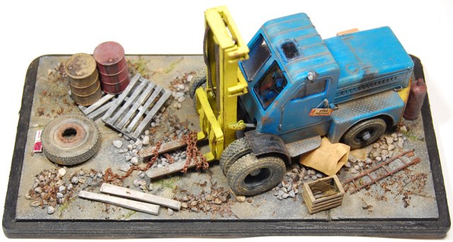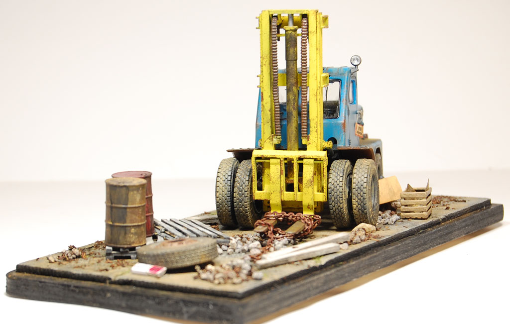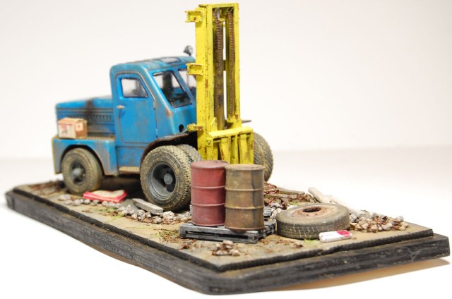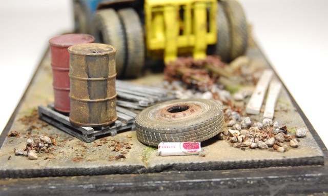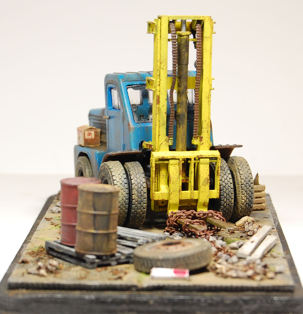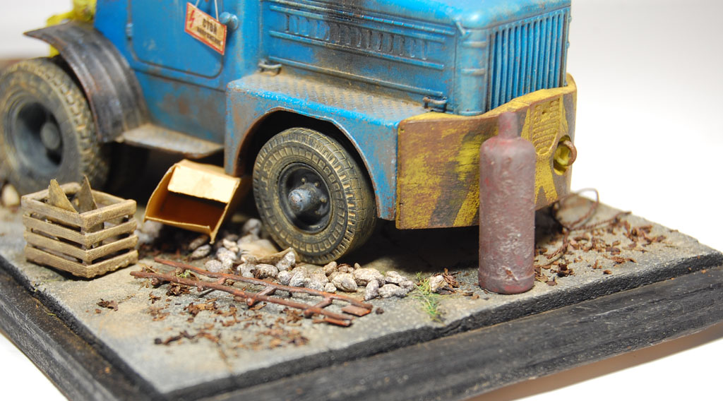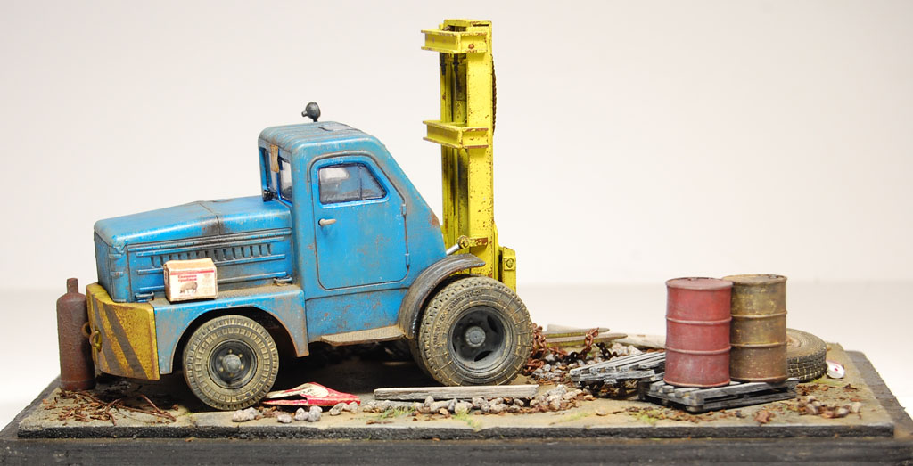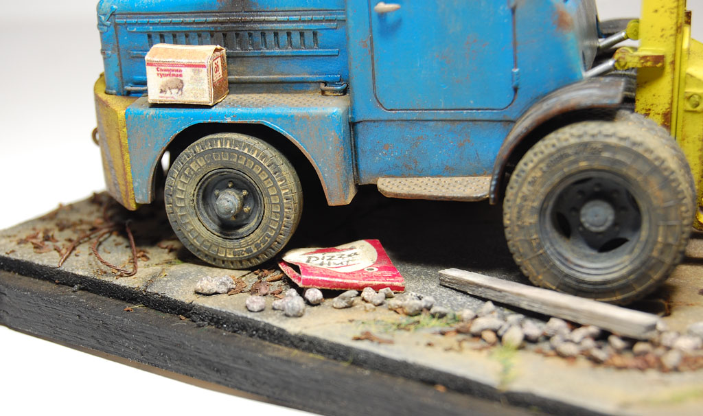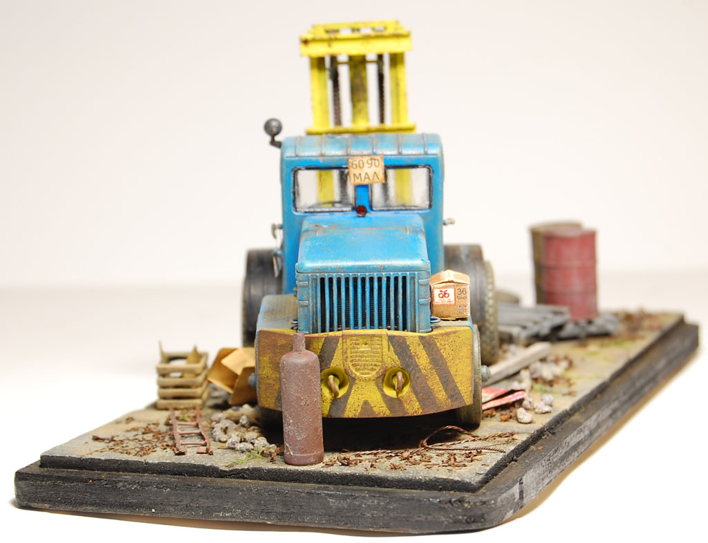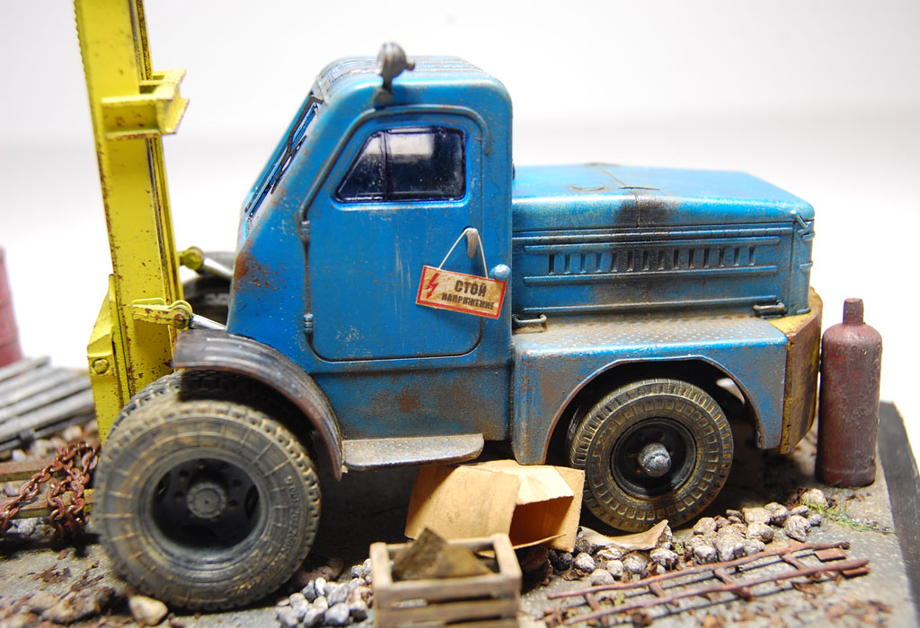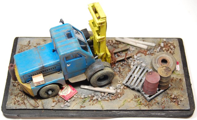 Здравия всем!Сделал виньетку в стиле заброшки!Большое Спасибо Алексею Груздеву за помощь в создании поделки!!!ЛЗА-4045,АВД,1/43,доработки:бочки-АВД,паллеты-самодел,коробки из под тушенки и пиццы,блок сигарет-ДенисМоделс,цепь-просто цепь),подставка-подложка под ламинат и фанера.