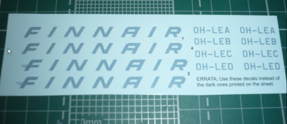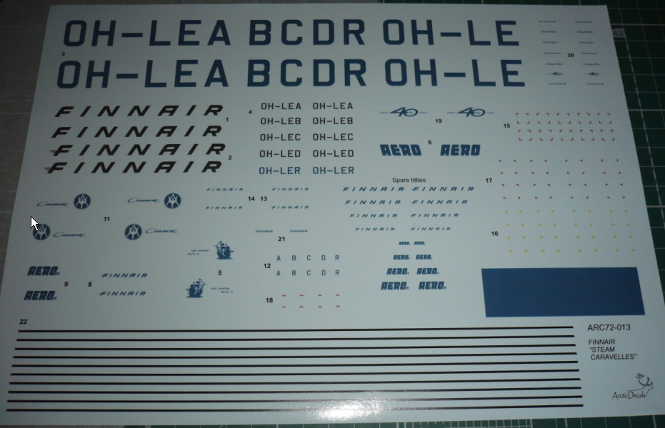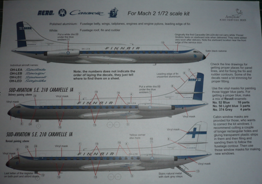 декаль #1 Логотип FINNAIR может быть как черного, так и в бледно-серый цвета. Не совсем ясно, когда Каравеллы носили черный логотип FINNAIR. декаль # 8 дублирующий логотип FINNAIR - в хвосте; декаль # 2 Логотип FINNAIR может быть как черного, так и в бледно-серый цвета, но на букве F имеются три горизонтальные линии. декаль# 11 – логотип производителя самолета на мотогондолах; для подлинной цветопередачи этих круглых логотипов на фоне мотогондол алюминиевого цвета в наборе имеются круглые белые диски для подложки под внешнюю декаль; декаль в виде белых тонких полос по правому и левому борту для отграничения синего читлайна и полированного алюминия низа фюзеляжа; дублирующие логотипы Aero o/y,FINNAIR наносятся в носовой части, на трап в хвосте;