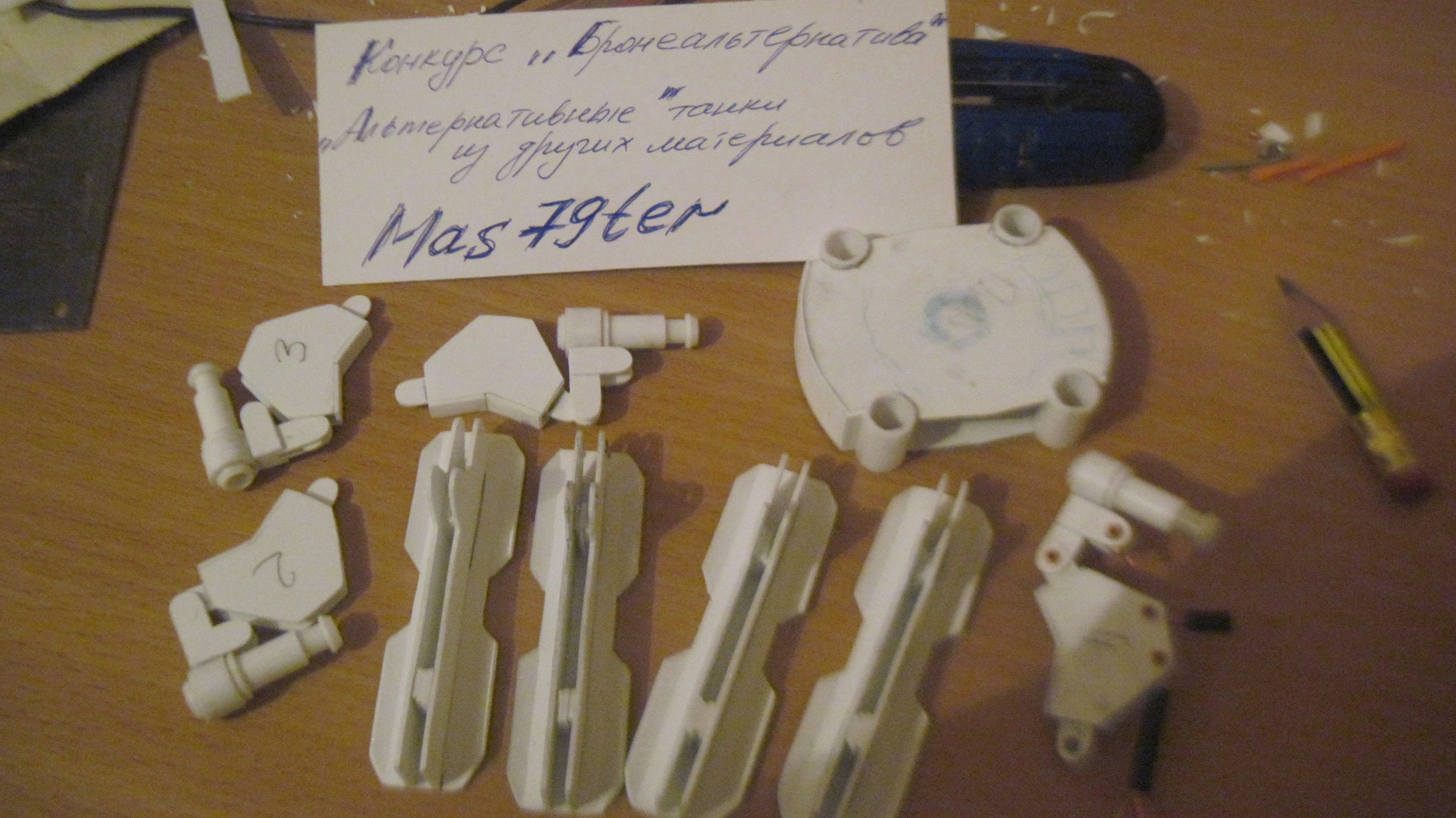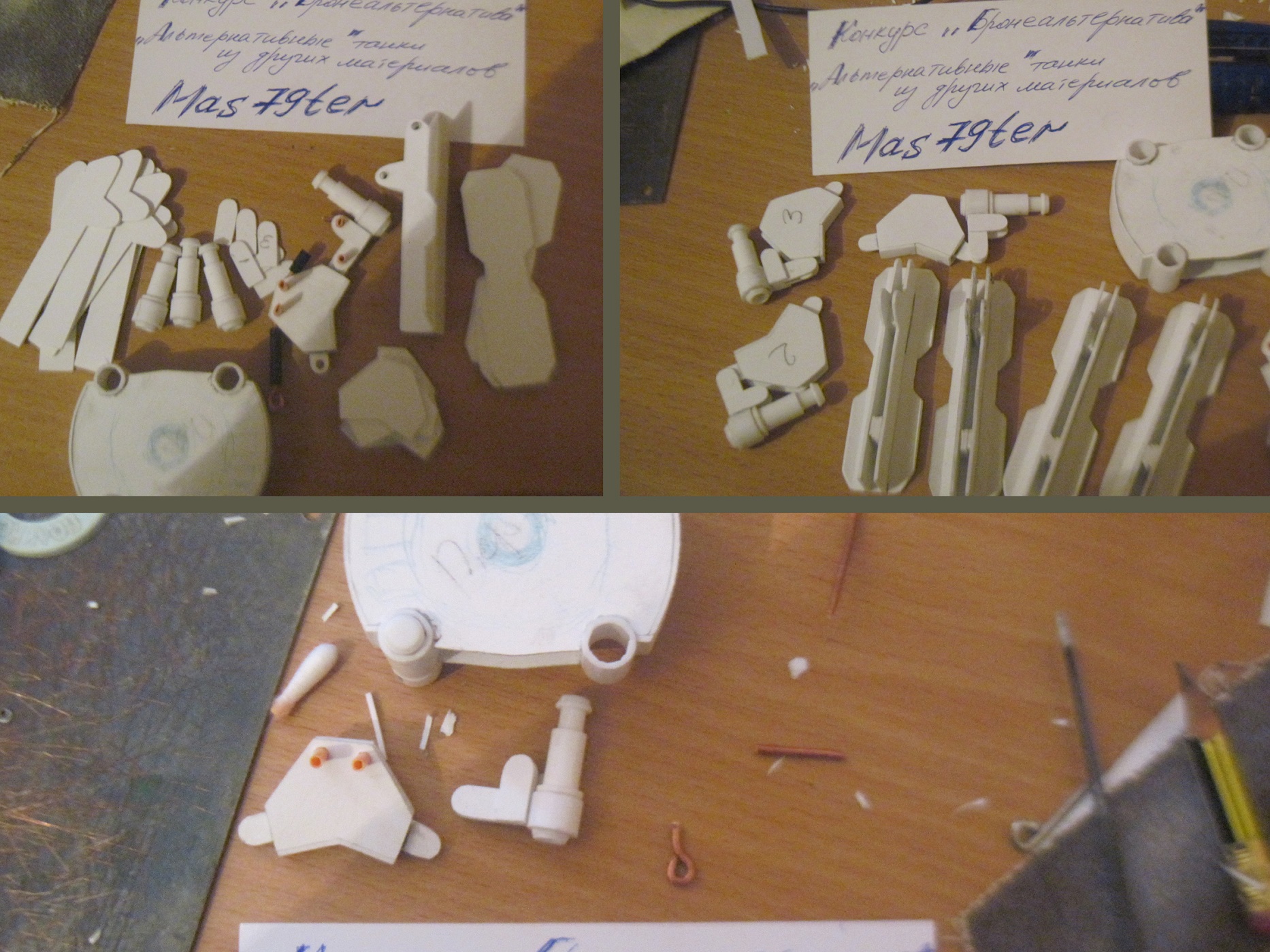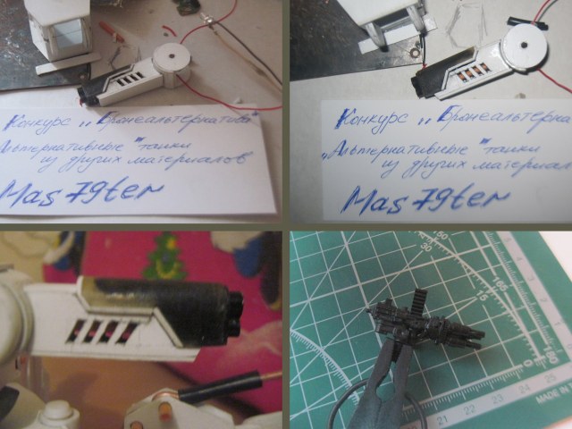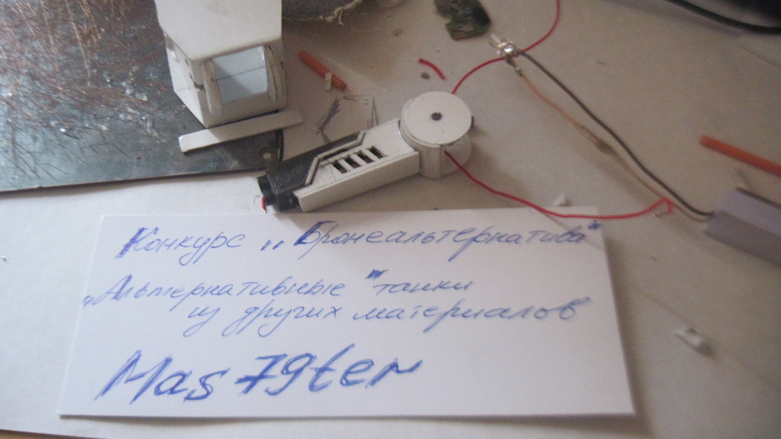 Модель выполнена полностью из ПВХ 1 мм,вход пошли шариковые ручки,магниты,подшипники для поворота башни,проволока,запчасти от зажигалок,опять же все то, что лежало под рукой.