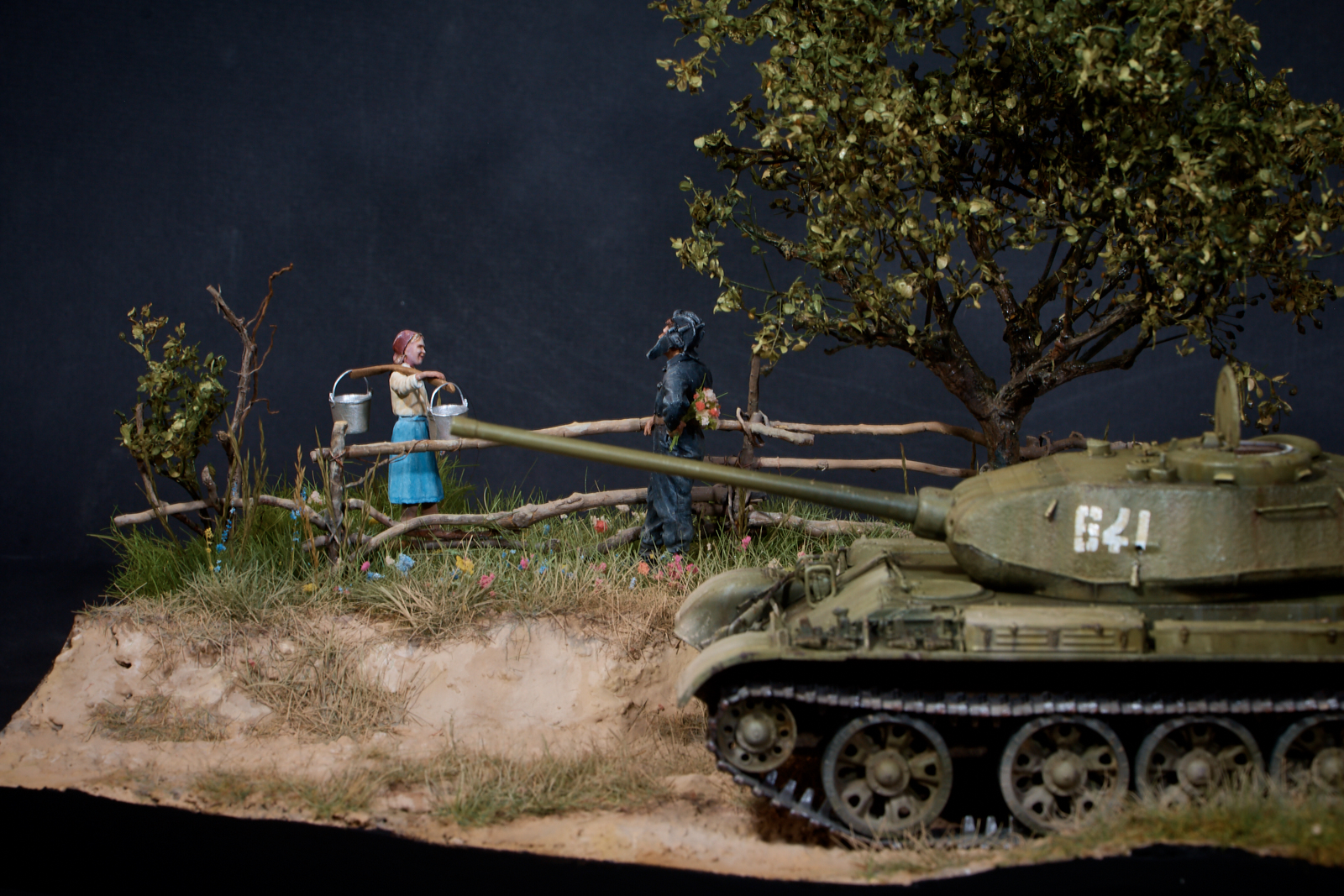 Танк от MiniArt'a фигуры вроде от МВ, основа пеноплекс + гипсовая штукатурка, трава - флок + природная трава, Дерево полностью из природных материалов, окраска, акрил, масло, темпера.