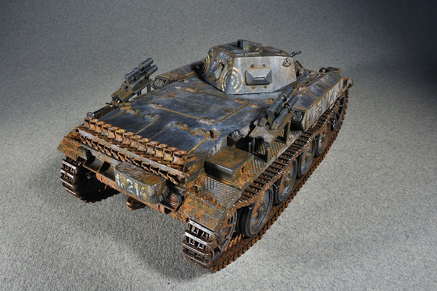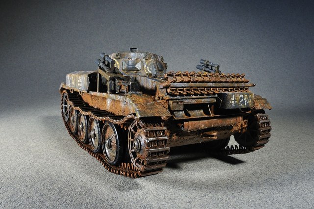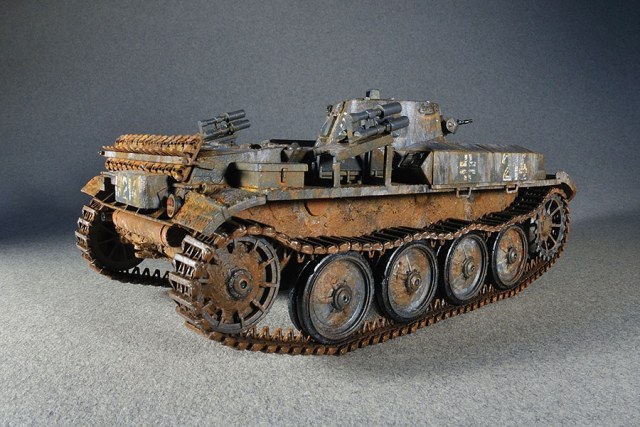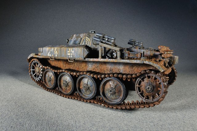 Вдохновила меня на эту работу модель БТ-2 (1933г.), выполненная Galax. Впечатлила грязь вперемешку со ржавчиной на бортах. Но, когда начал грязнить, уже не смог остановиться. В общем, можно сказать, получился один из возможных вариантов танка после длительного и даже агрессивного неухаживания. Правда, есть шанс, что боеспособность и даже подвижность он сохранил - оружие в нормальном состоянии, на грунтозацепах гусениц и зубцах ведущей звездочки стертый металл.