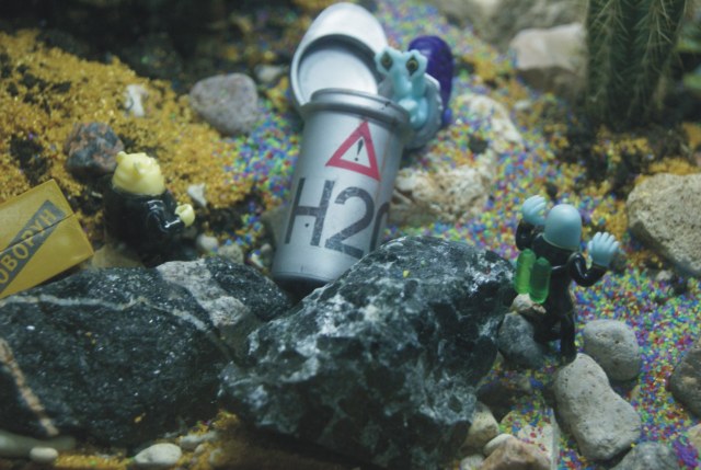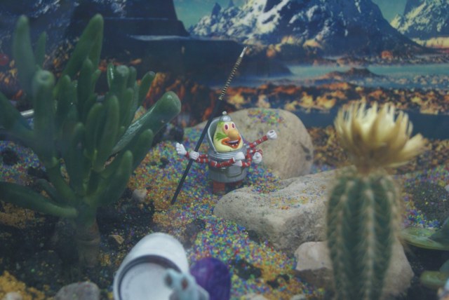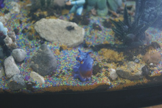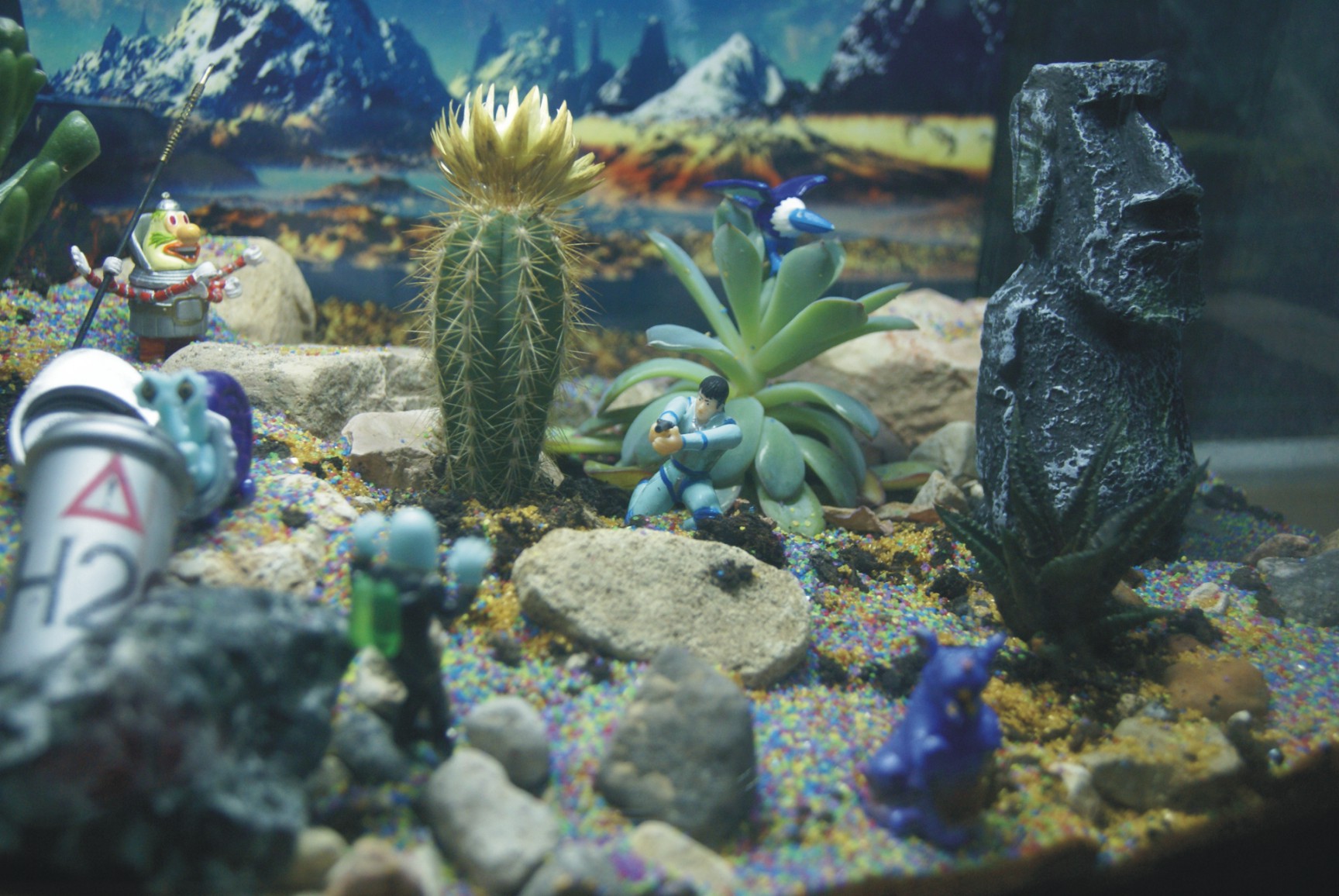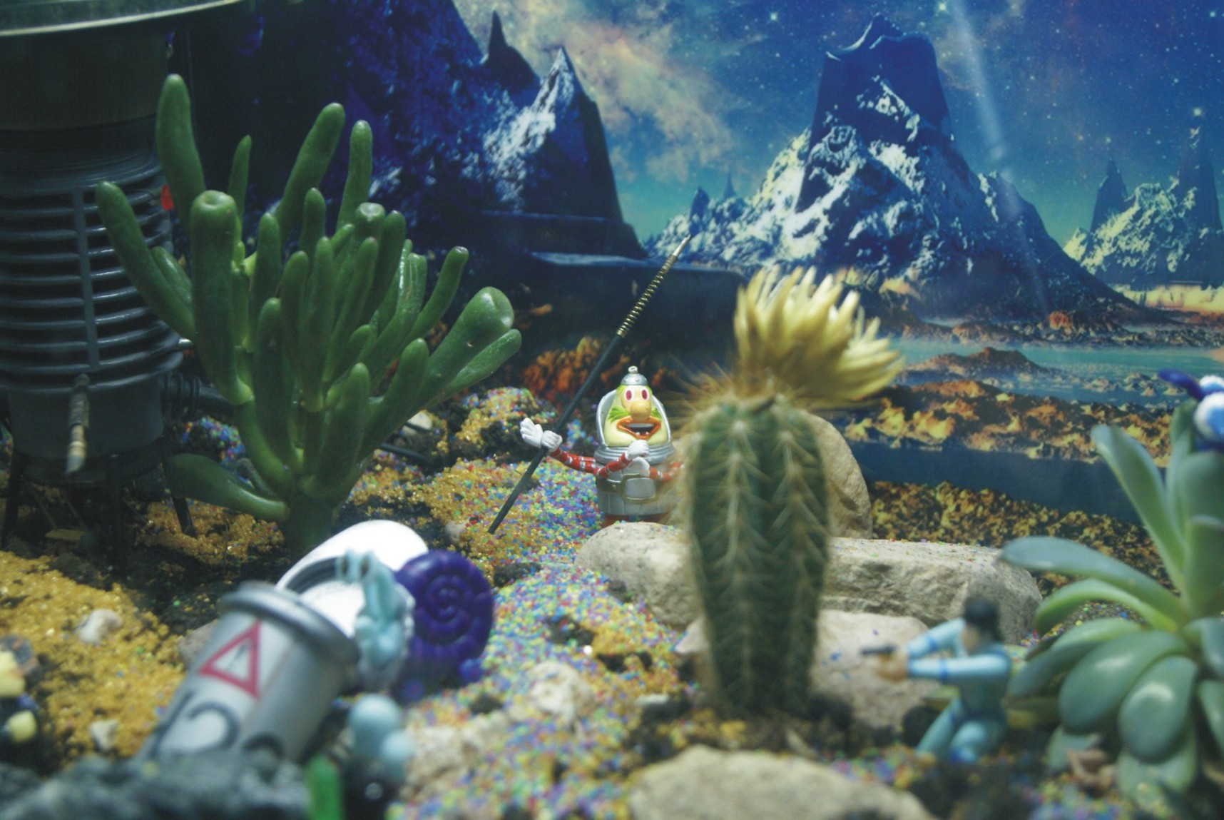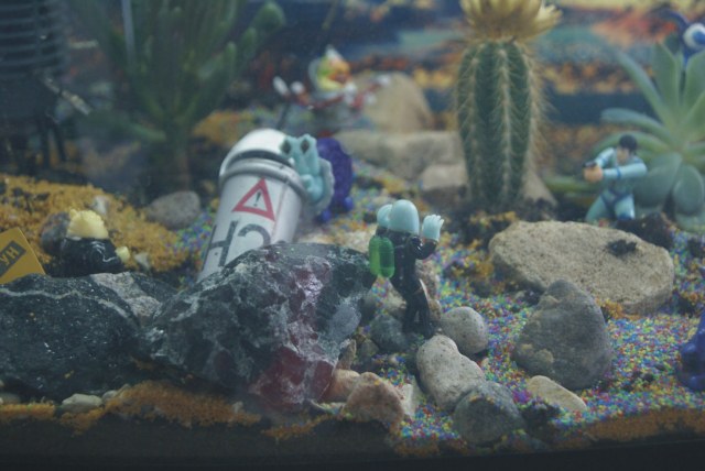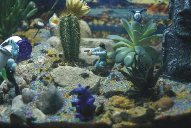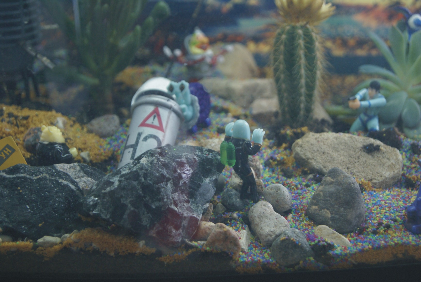 Дело началось с того, что у меня валялся аквариум с трещиной на задней стенке, чинить не стал, а решил посадить в нем суккуленты, опыта в выращивании у меня не было, но задача банальная - уехал в отпуск - полив не нужен. Получилось скучновато, вот и решил я сделать повеселее что-ли .. Купил фигурки Ландгрин, статую идола, из каких-то там банок соорудил мини-космический корабль, песок покупал специальный - благо нашел "космической расцветки", чему рад, тем более стоит он за 100гр - да вообще ничего не стоит, меньше стоимости буханки хлеба. На космическом корабле кстати, использовал Шаэры с реального самолета, с Ту-16. Так и стоит кадр из мультика на подоконнике передо мной, а за бортом идет снег.