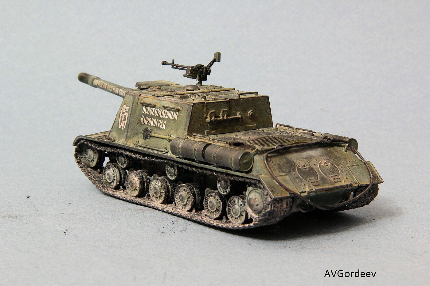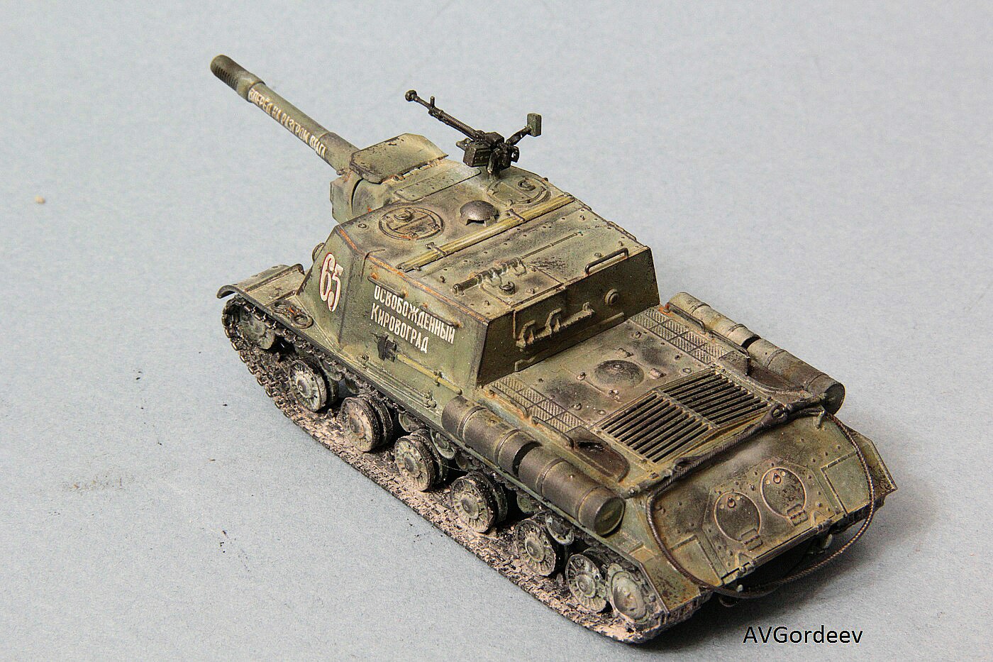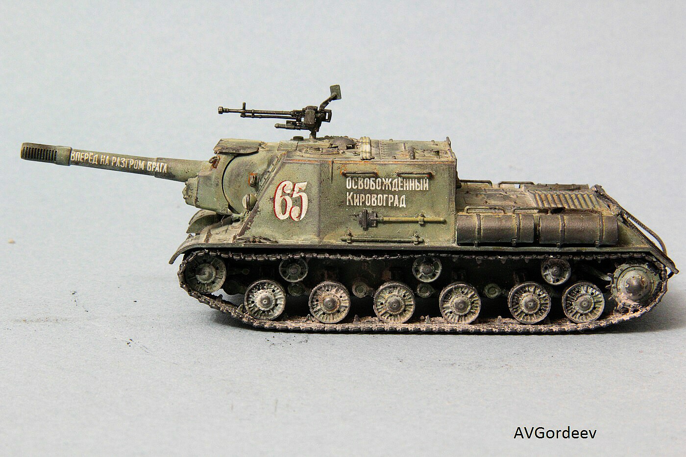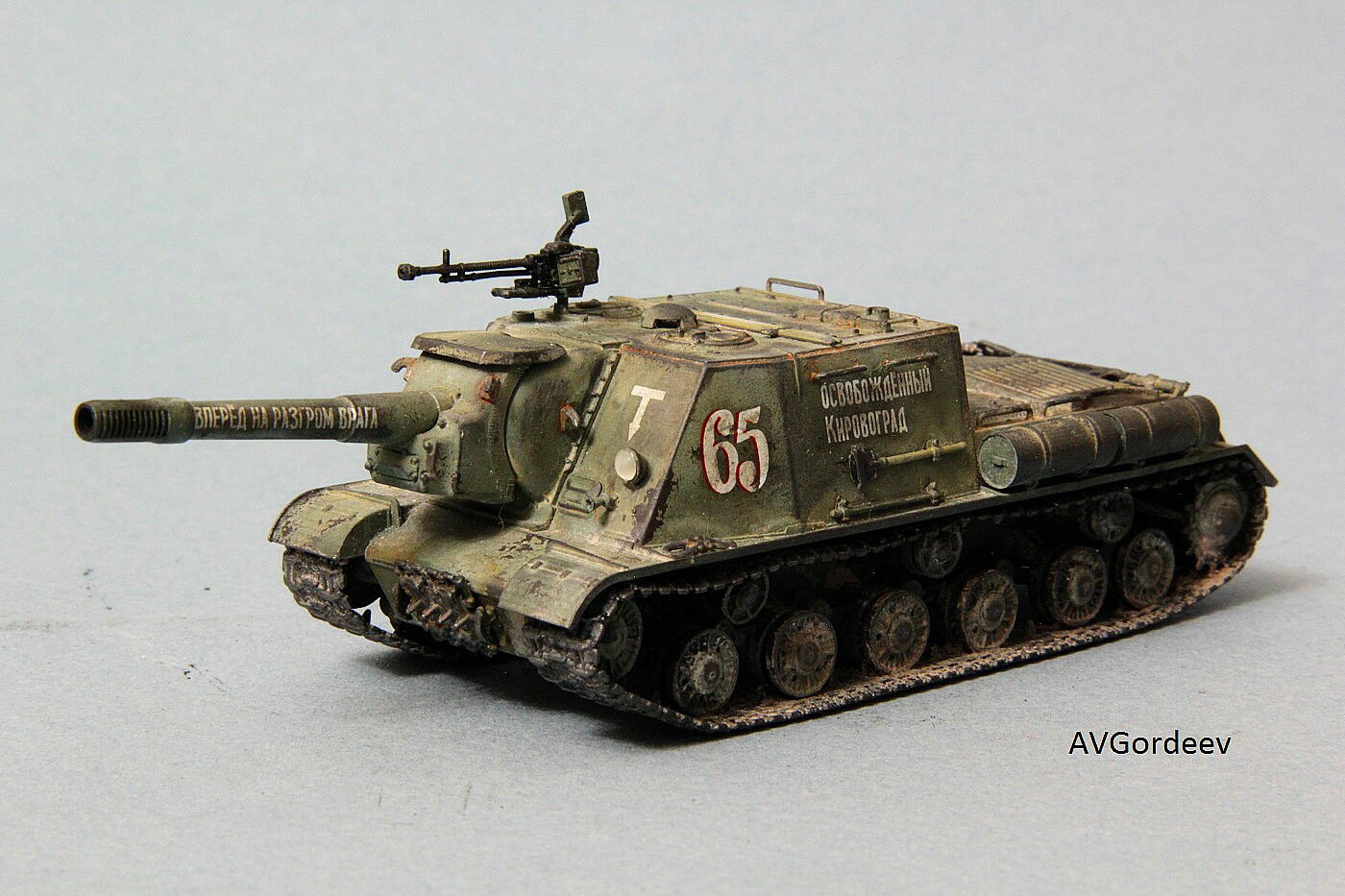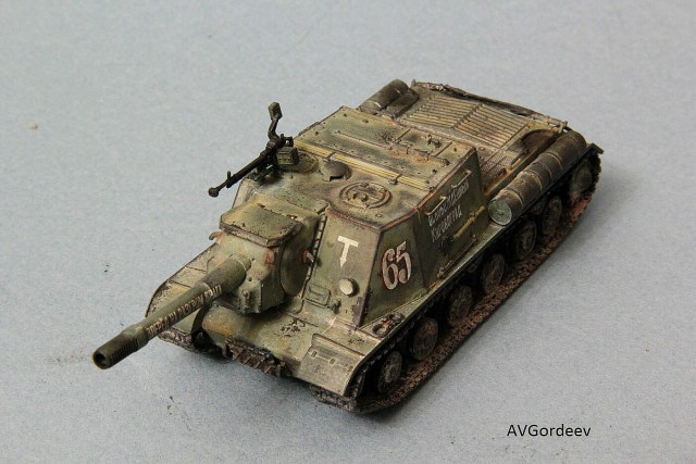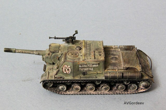 Историческая справка: ИСУ-152 заслужила у солдат Великой Отечественной прозвище «Зверобой». Её 152-мм пушка-гаубица МЛ-20 С обр. 1937/43 гг. посылала в цель 44 килограммовые снаряды с 6 кг тротила в каждом. Одного попадания такого снаряда в немецкий танк «Тигр» или «Пантера» было достаточно для его гарантированного уничтожения, а в городских боях снаряд ИСУ-152 превращал в руины городской дом средних размеров или бетонный ДОТ.