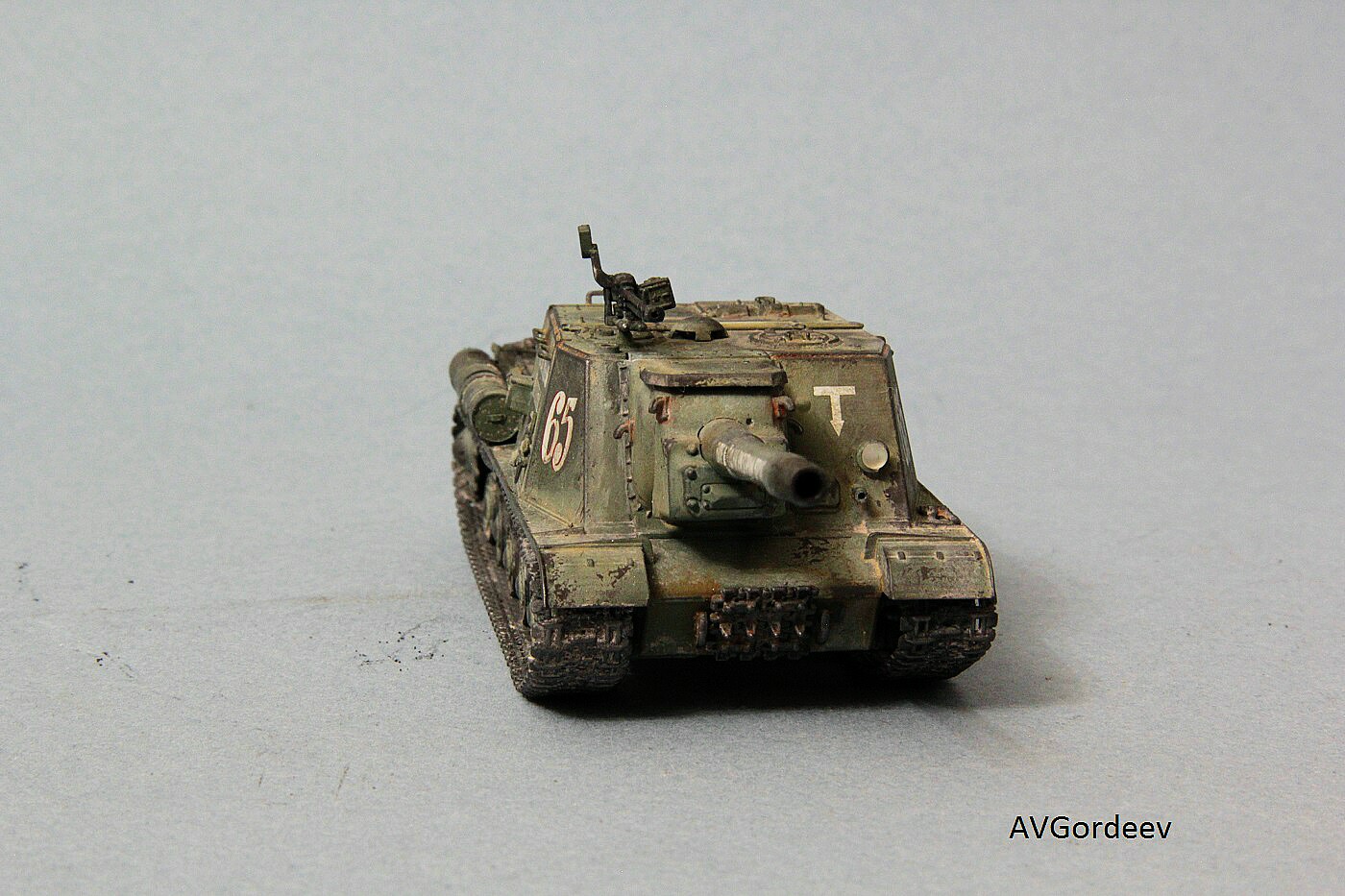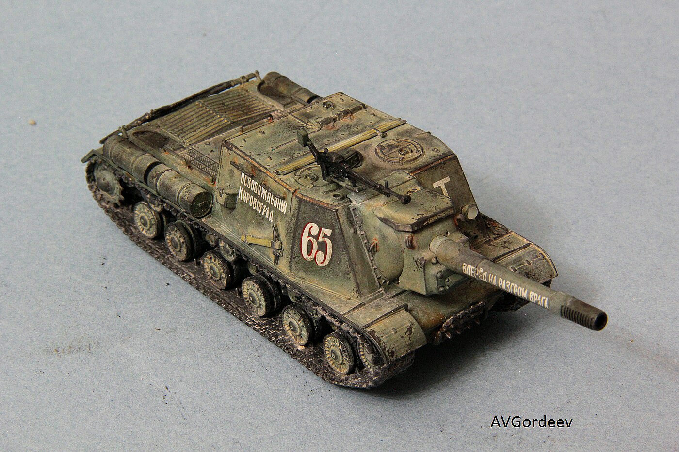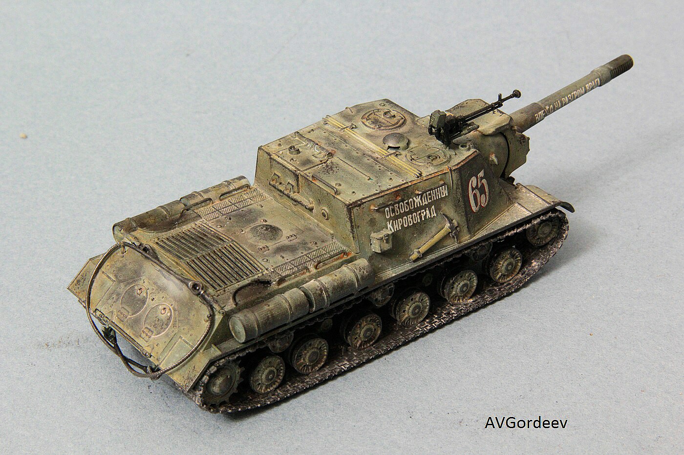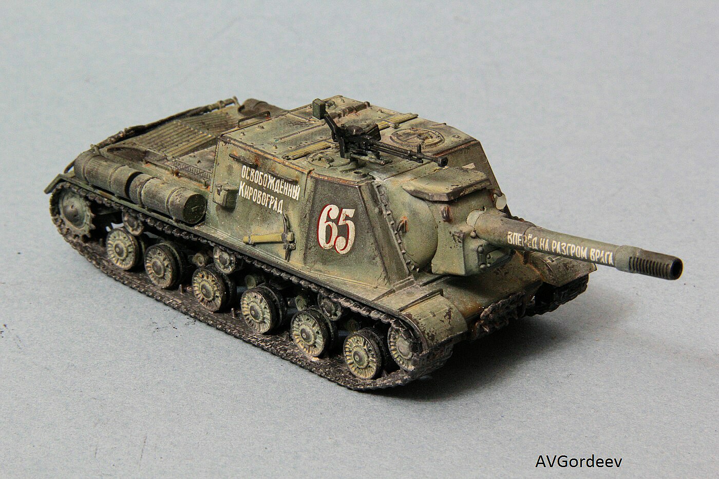 Историческая справка: ИСУ-152 заслужила у солдат Великой Отечественной прозвище «Зверобой». Её 152-мм пушка-гаубица МЛ-20 С обр. 1937/43 гг. посылала в цель 44 килограммовые снаряды с 6 кг тротила в каждом. Одного попадания такого снаряда в немецкий танк «Тигр» или «Пантера» было достаточно для его гарантированного уничтожения, а в городских боях снаряд ИСУ-152 превращал в руины городской дом средних размеров или бетонный ДОТ.