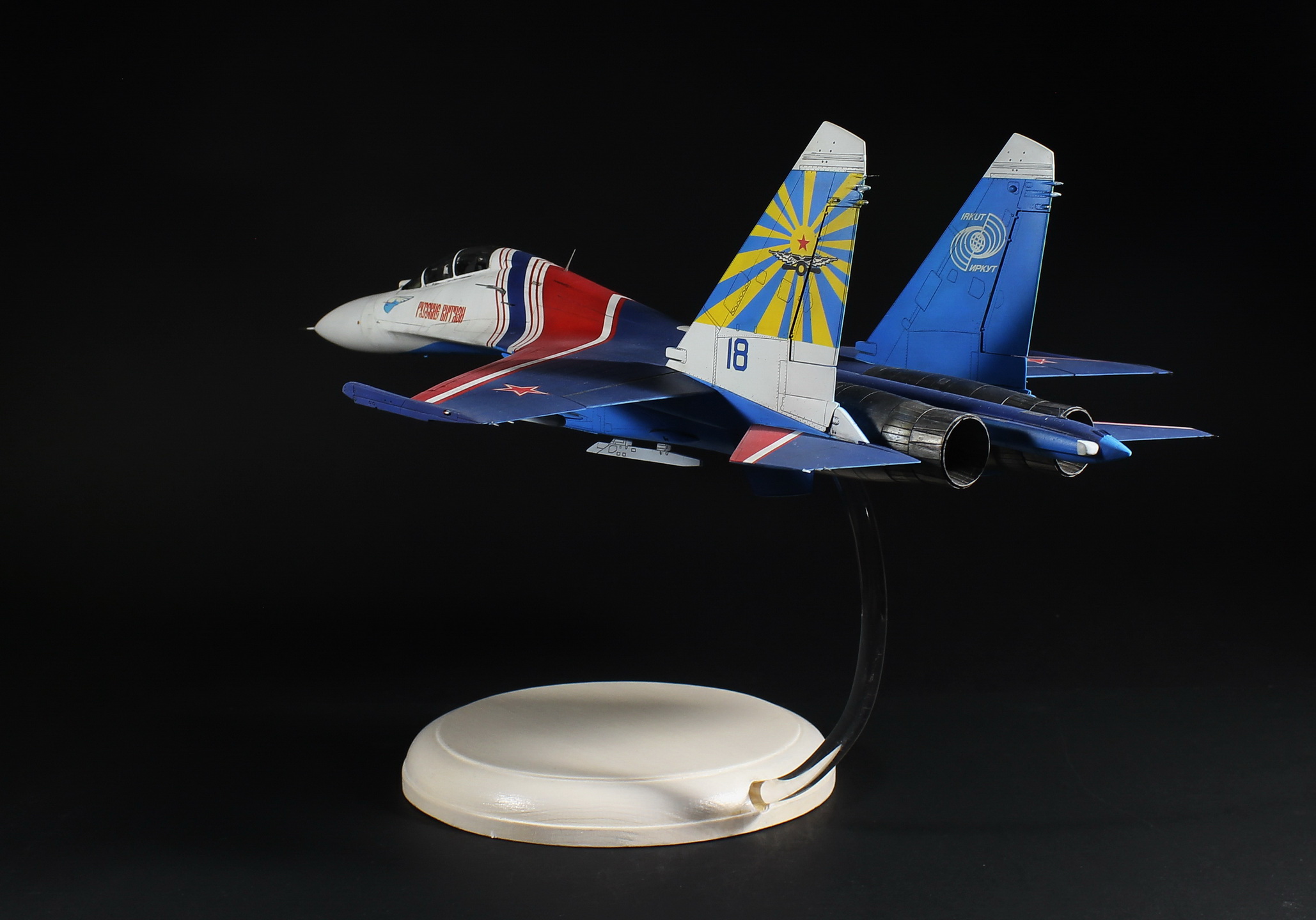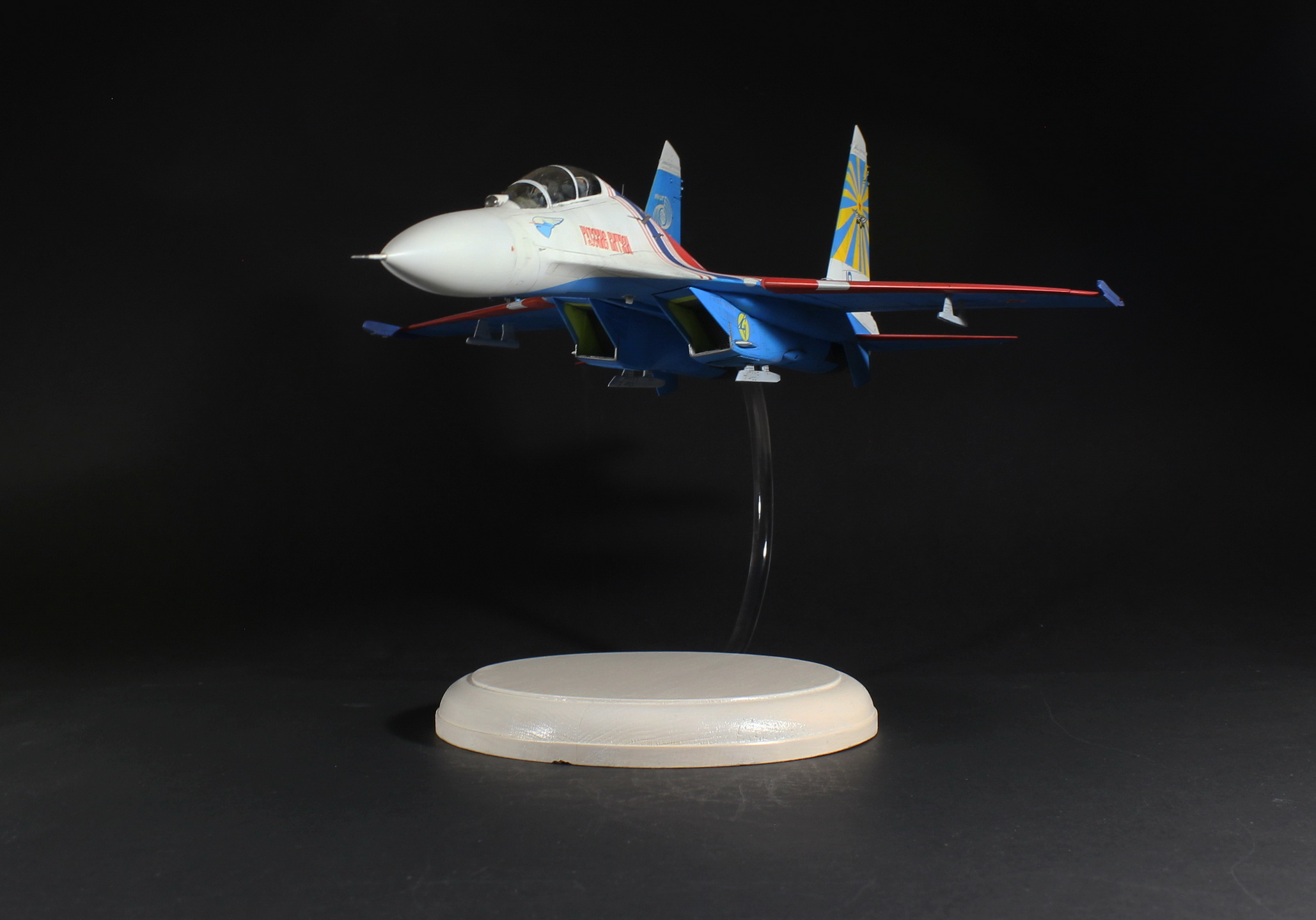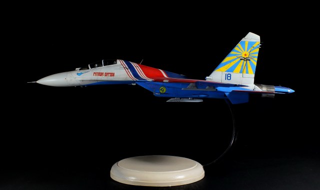 Теперь о модели: сначала о выбранном прототипе, этот борт печально известен тем, что 16.08.2009 в ходе репетиции к авиасалону «МАКС» в небе получил повреждение от столкновения с 14 бортом. Погиб заслуженный военный летчик России, полковник Игорь Ткаченко.