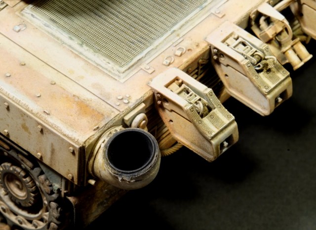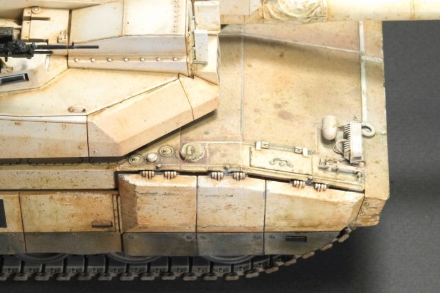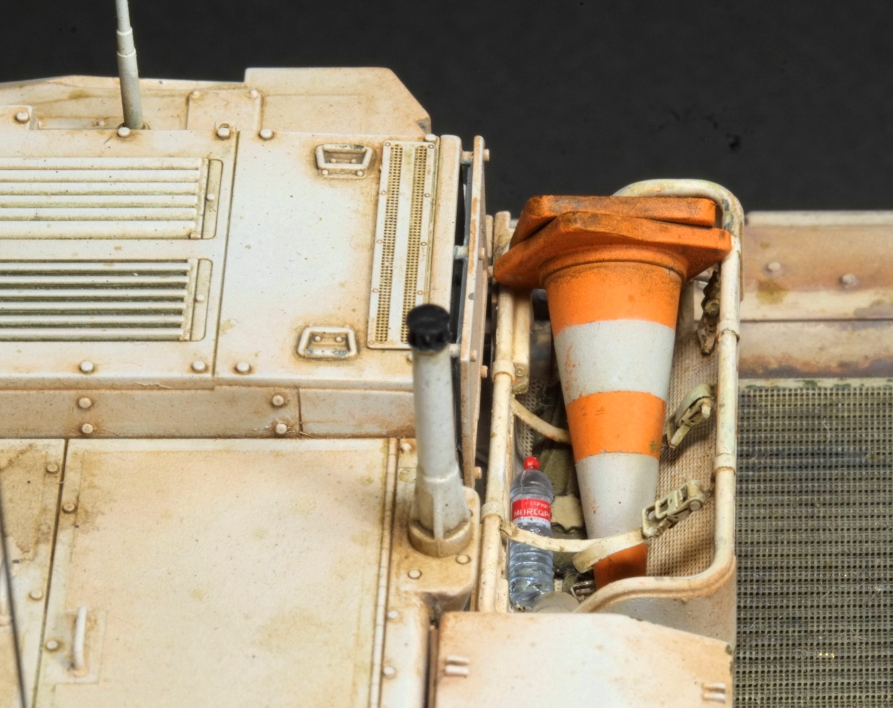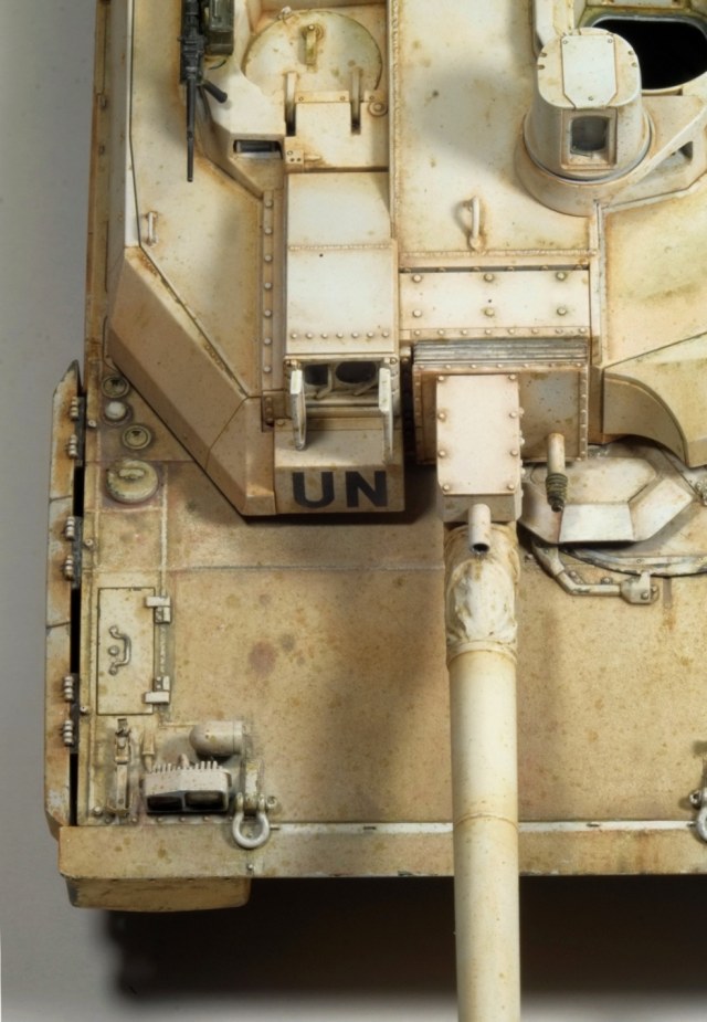 Окраска и weathering: белый акрил от Mr Hobby, далее - практически все, что было в доме - всевозможные масляные краски, смывки от АК, пигменты, пастельные карандашики. Я впервые решил сделать столь загаженный пылью и грязью танк, а грязь в Ливане специфическая, красноватая, я изготовил ее из масляных красок разных оттенков, добавил кое-где пигмента "Вьетнамская земля" от АК.