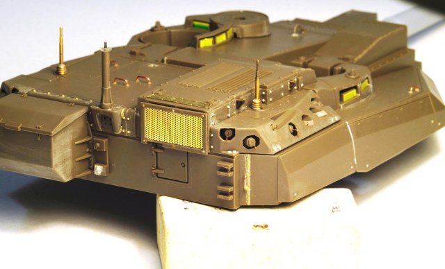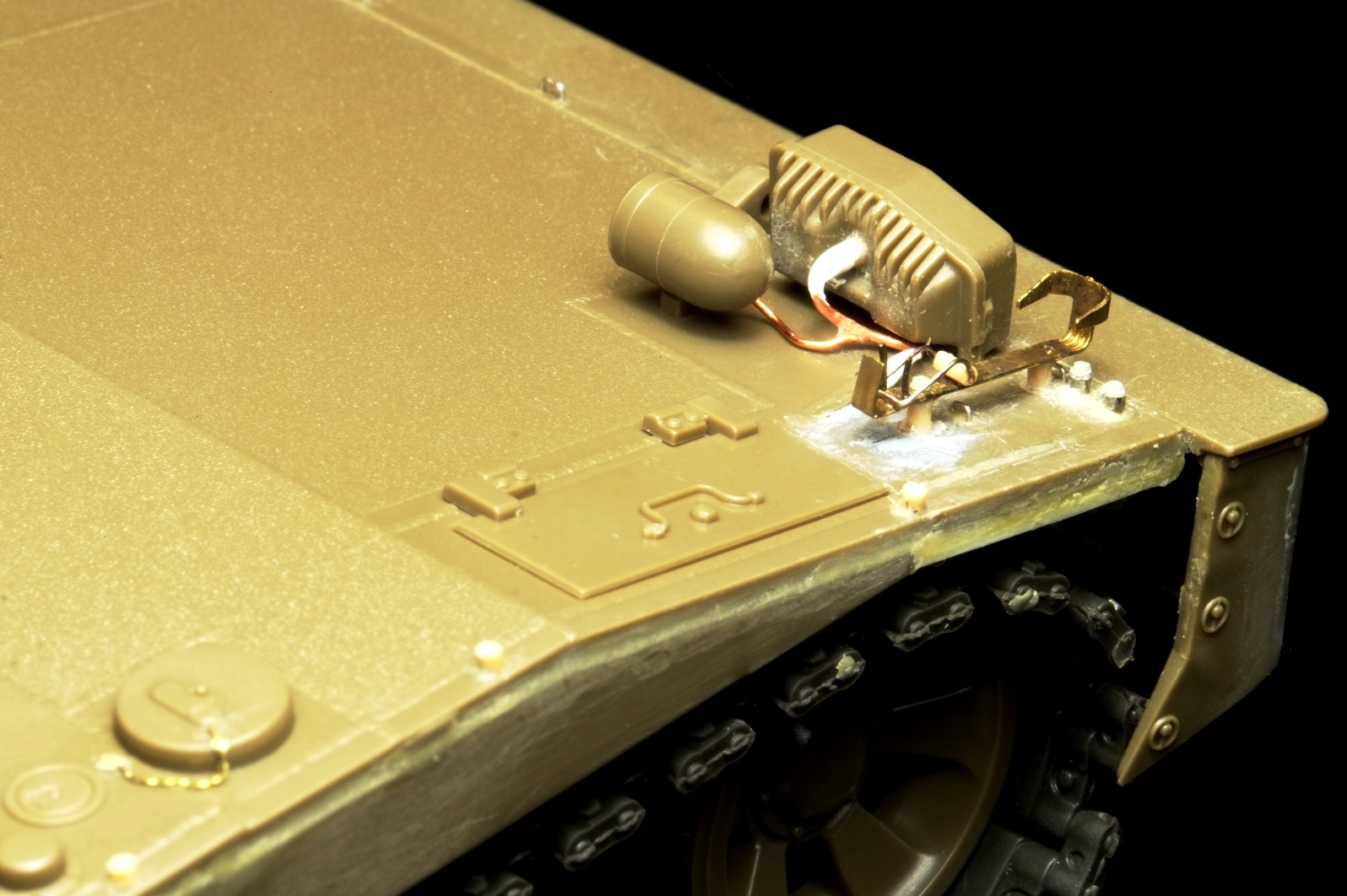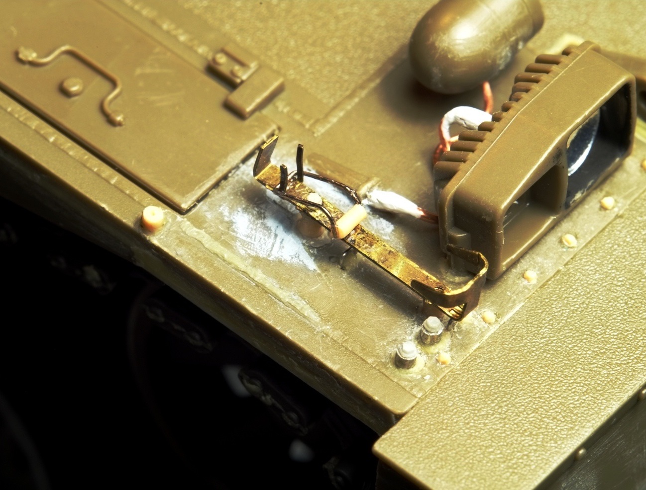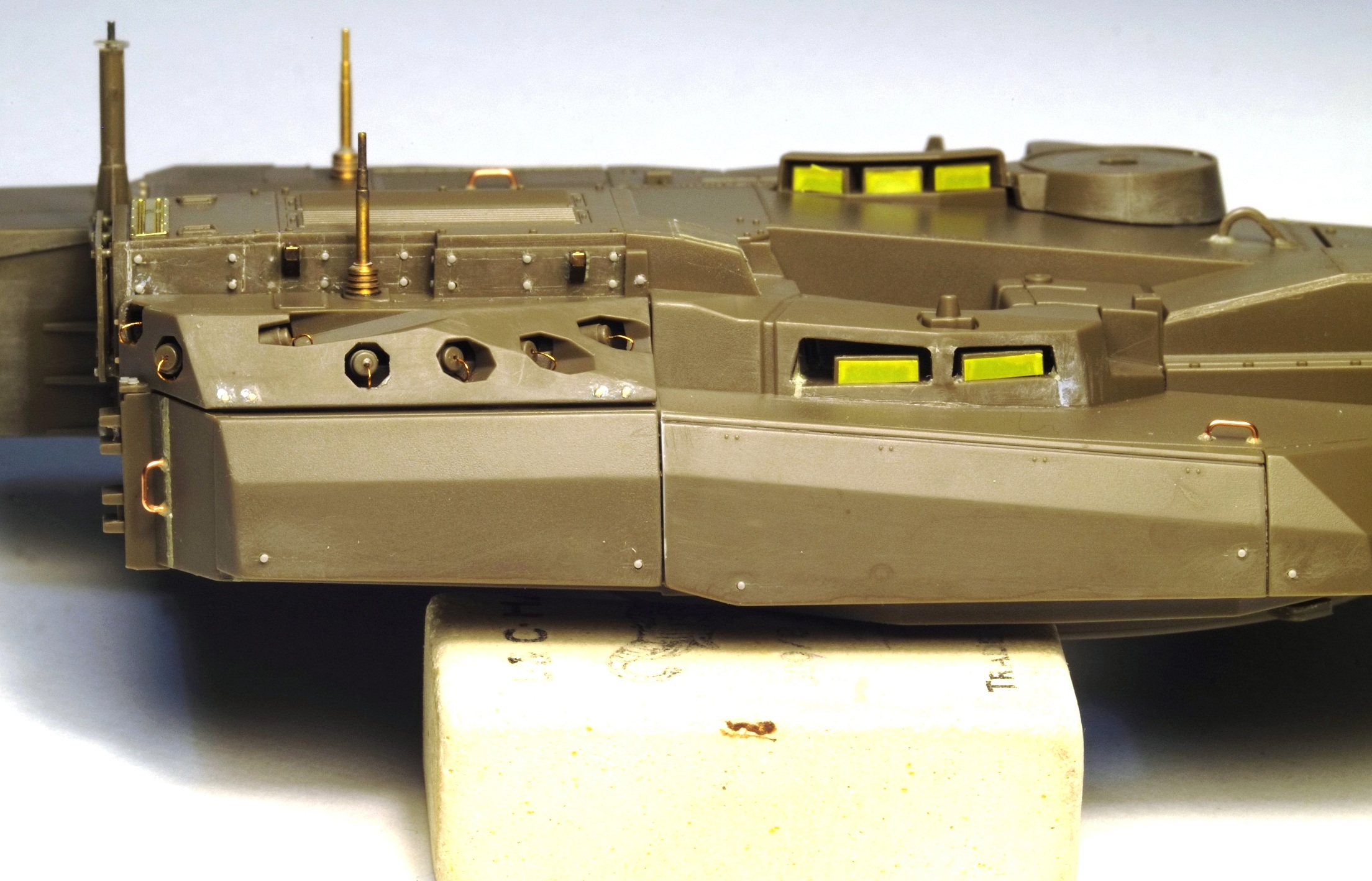 вот, к примеру - кожухи триплексов на Леклерке изготовлены из тонколистового металла, подобны деталям автомобильного кузова и крепятся к броне с помощью болтиков; чтобы воспроизвести эти мелочи, было необходимо "прооперировать" и сами кожухи, причем и с обратной стороны тоже, а еще сошлифовать переразмеренный Тамией антислип, и я решил отложить этот геморрой на следующий раз.