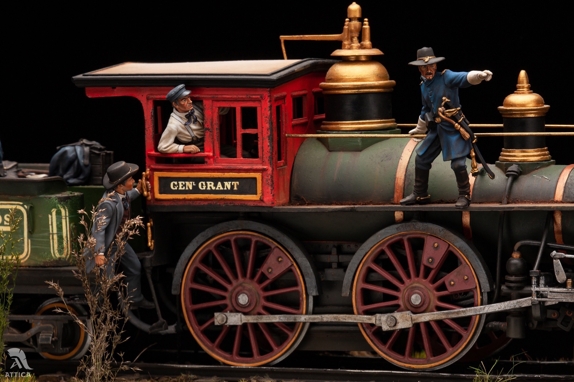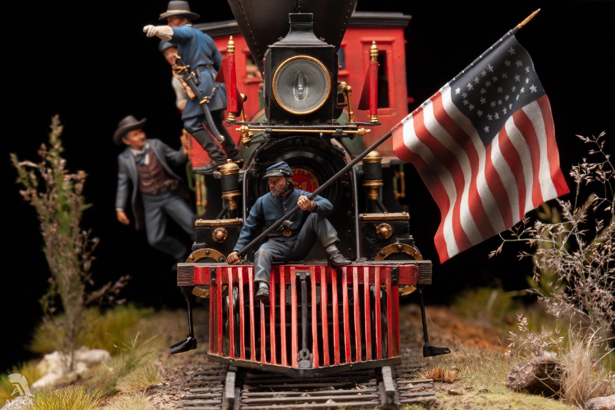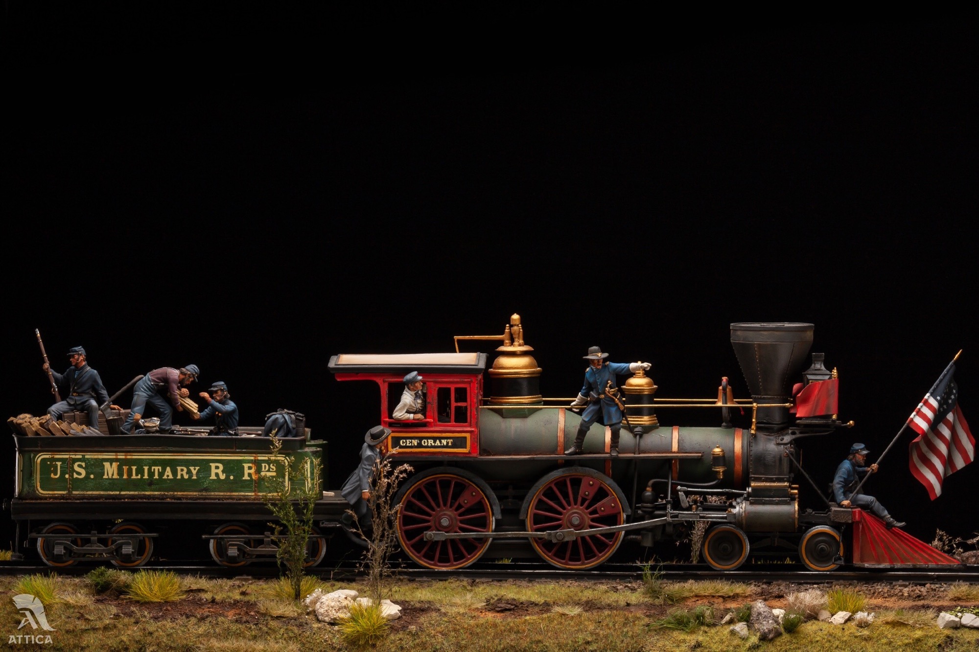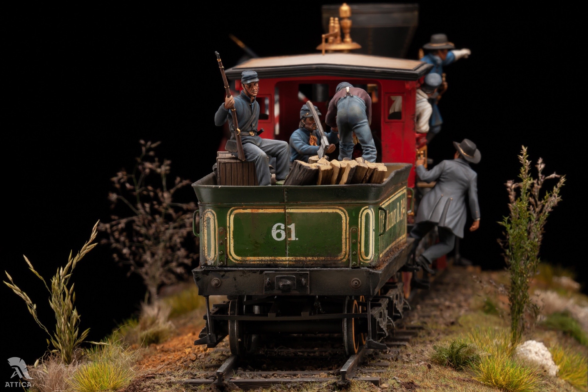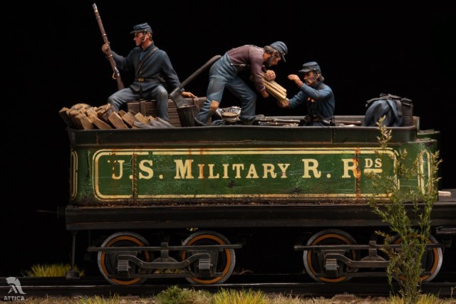 Хочу представить мою самую масштабную( на данный момент) работу. Поезд северян на Гражданскую войну в 32-ом масштабе от Andrea miniatures, выполненный для студии «Аттика». Когда я впервые увидел, сколько всего предстоит красить, немного оторопел, но потихоньку процесс пошёл. В итоге, окраска растянулась на несколько месяцев. Размер модели заслуживает отдельного внимания. Мне пришлось соорудить дополнительный стол, чтобы комфортно все разместить. Основание под поезд получилось 70 см длиной и весом около 6 кг. Боюсь представить, сколько весит все вместе. Пара слов о модели. Это довольно убогий сплав из белого металла, смолы и фототравления. Деталировка очень скудная. Фигуры слегка замылены и простоваты, но в целом довольно сносны. Типичные оловянные миниатюры. Основание из понополистирола, камешков и всего, что попалось род руку. При окраске использовались краски Vallejo и scale75. Приятного просмотра.