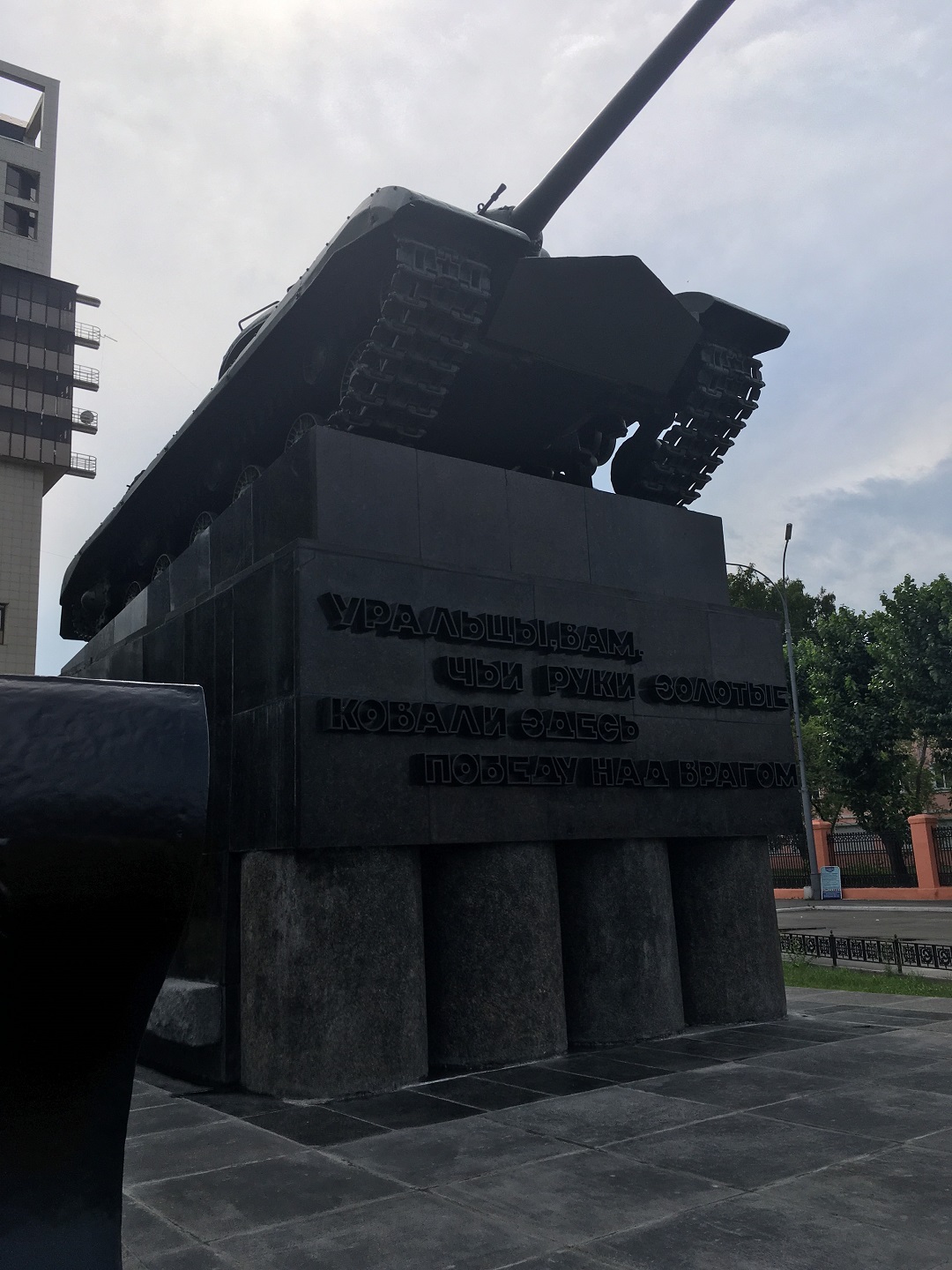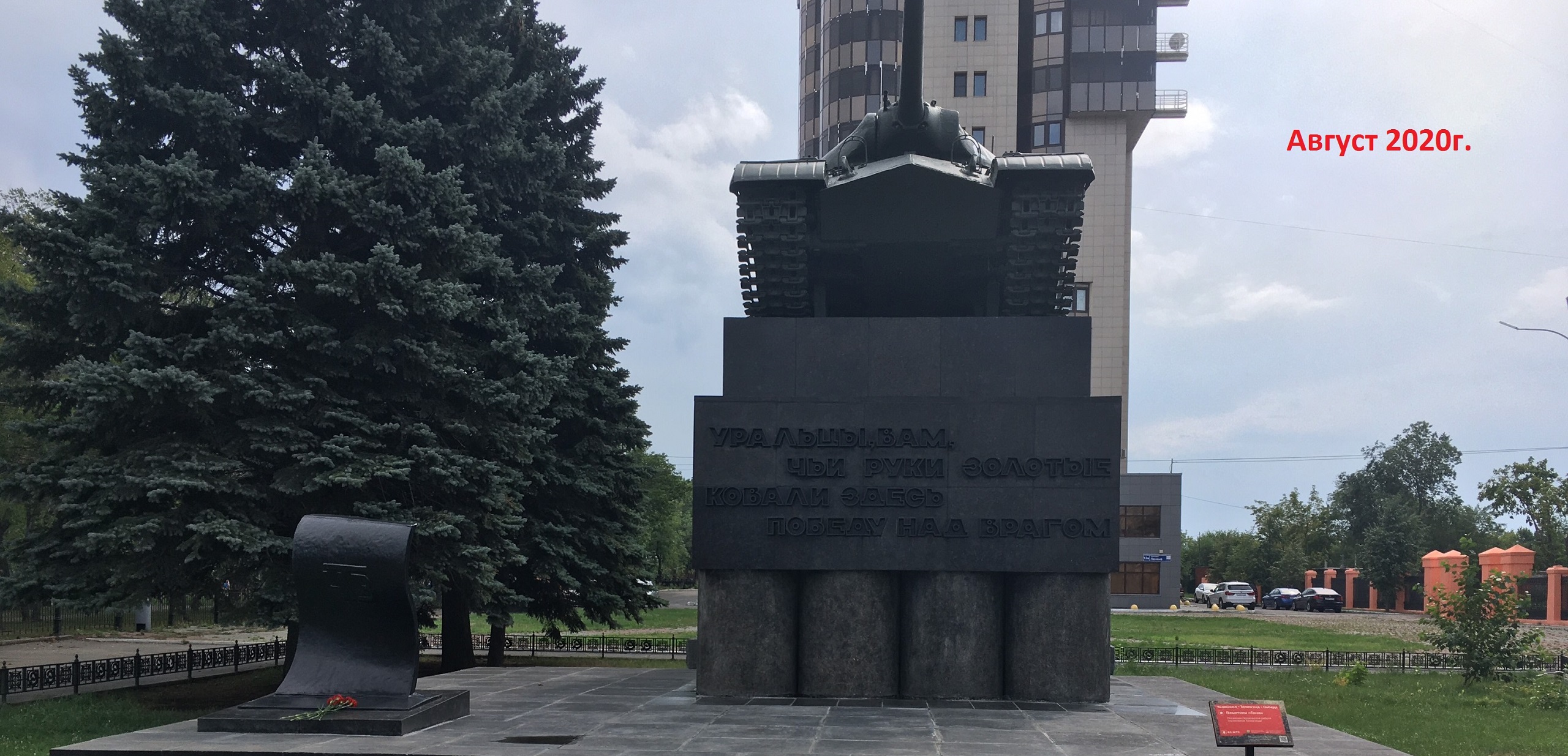 Памятник «Танк» (танк ИС-3М) посвящён героическим труженикам Танкограда (неофициальное название Челябинска в годы Великой Отечественной войны 1941-1945 гг.). Открыт 8 мая 1965 года к 20-летию Победы в Великой Отечественной войне. Монумент сооружён по проекту архитектора Евгения Викторовича Александрова. На лицевой стороне пьедестала отлитые из чугуна слова: «Уральцы, вам, чьи руки золотые ковали здесь Победу над врагом», автор текста В. Брагин. На боковом фасаде цифры – «1941- 1945». На стилобате кованый из латуни броневой лист, на котором изображена марка «ЧТЗ». Постамент и стилобат облицованы плитами из лабрадорита и тесаными блоками из серого гранита. Монумент является символом таланта и трудолюбия его создателей – рабочих знаменитого Танкограда.
