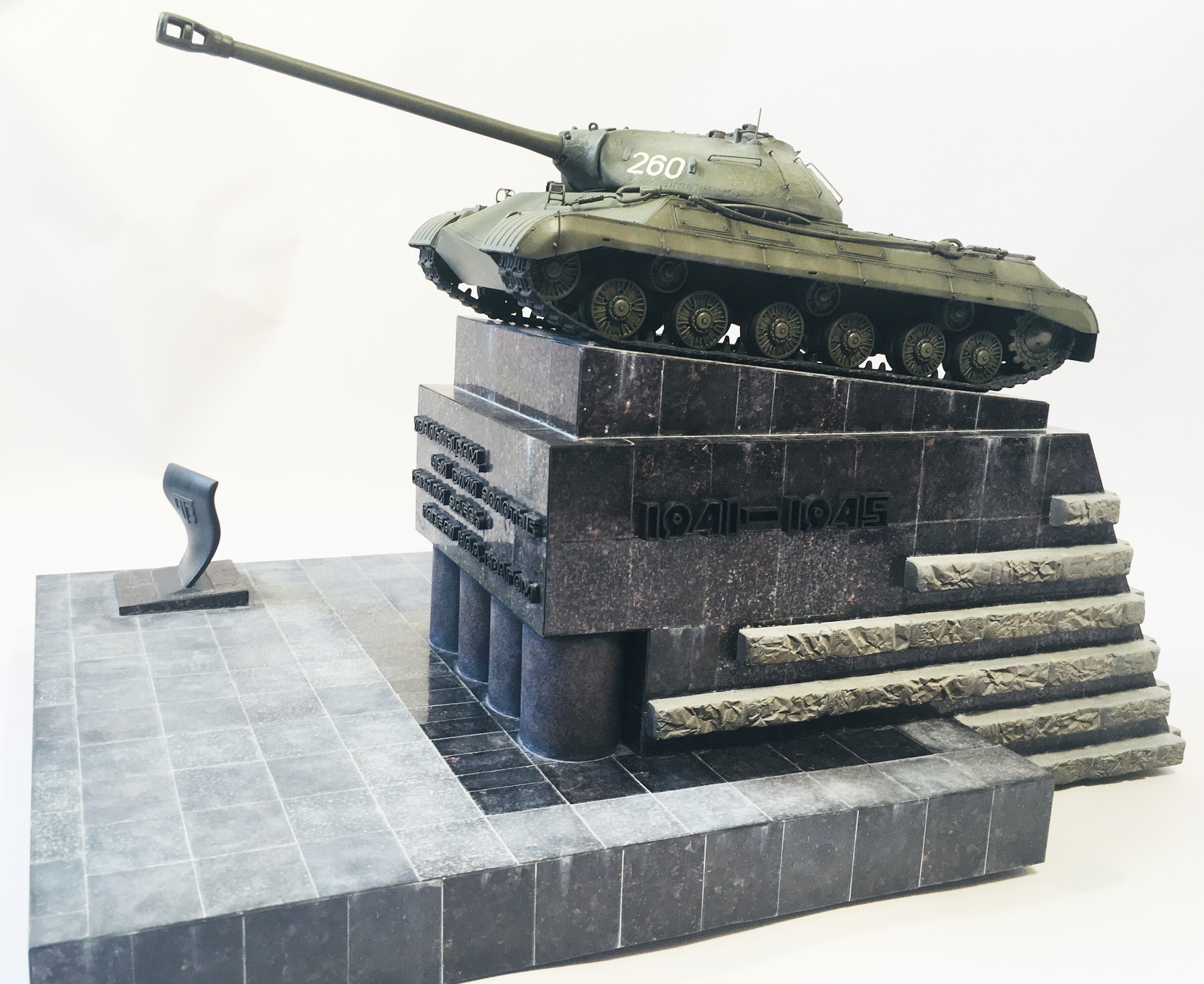 Танк ИС-3М – «Моделист-Trumpeter» 303540 1/35, произведен ряд доработок корпуса и башни в соответствии с фото памятника. С реальных постамента и основания памятника предварительно были сняты фактические размеры для последующего масштабирования и разработки комплекта рабочих чертежей с деталировкой, хотя незначительные различия макета и оригинала все-таки получились, но на мой взгляд общую картину они не портят, поэтому описывать не буду.