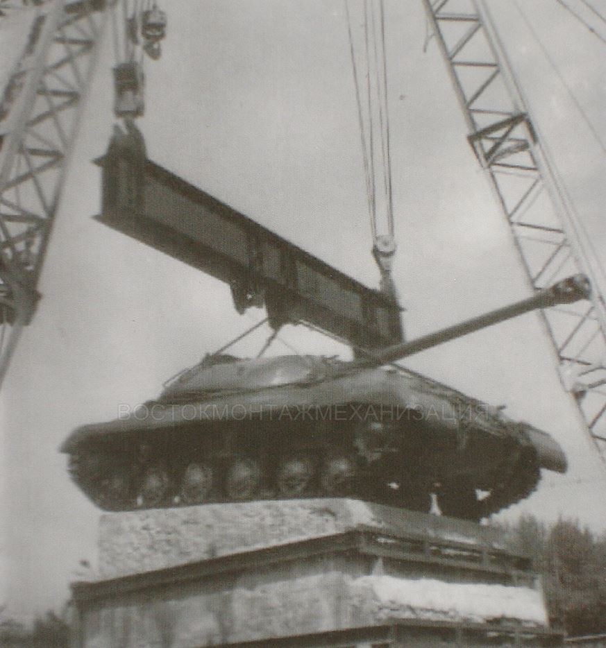 Восстановленный макет танка погружен на трал и доставлен на Комсомольскую площадь, где двумя гусеничными кранами ДЭК-321, при помощи траверсы установлен на постамент и зафиксирован сваркой к забетонированным в постаменте анкерам.