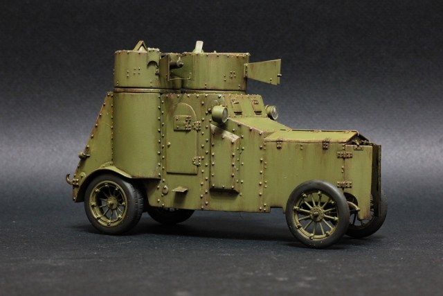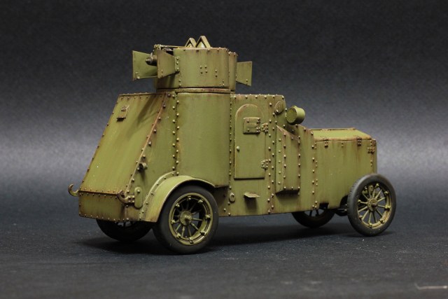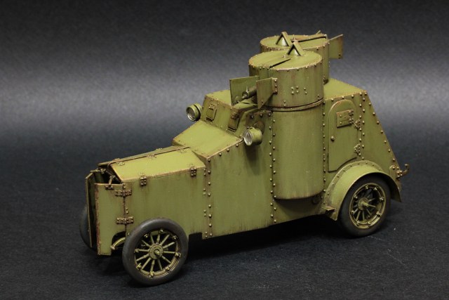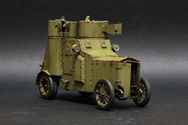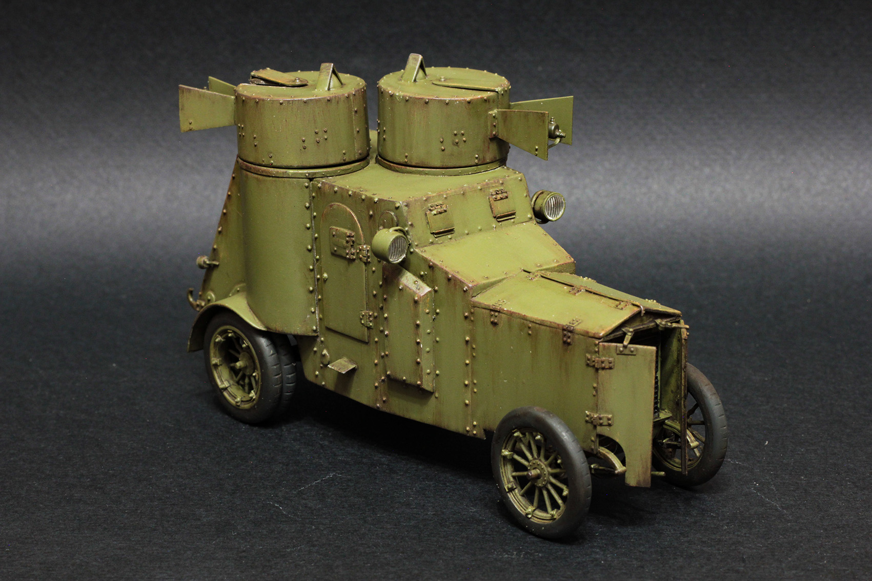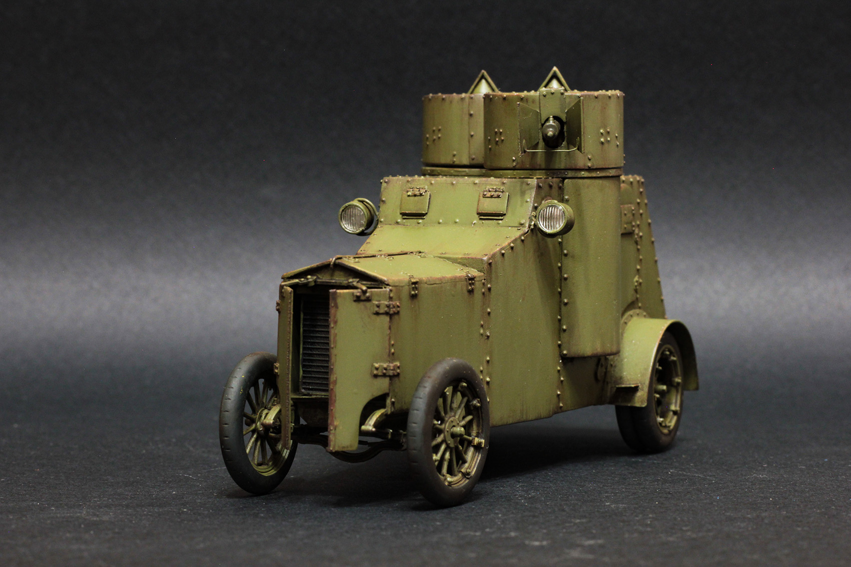 При проектировании бронекорпуса ижорского «Фиата» русские конструкторы учли накопленный к тому времени опыт эксплуатации бронеавтомобилей. Прежде всего была увеличена высота диагонально расположенных башен, снабженных специальными вентиляционными приспособлениями. Пулеметы, установленные на специальных зенитных станках с углом возвышения 80 градусов, прикрывались снаружи броневыми «щеками». Для управления машиной в бою у водителей переднего и заднего рулевых постов имелись специально сконструированные смотровые щели и круглые «глазки» в бортах. . Толщина брони составляла 7 мм для вертикальных и 4–4,5 мм для горизонтальных поверхностей, масса машины в боевом положении 4,5 т. Всего же по состоянию на апрель 1918 года Ижорским заводом было изготовлено 47 броневиков этого типа. Впоследствии бронировка была продолжена, и готовые машины поступали на вооружение автоброневых отрядов Красной Армии. Модель полностью самодельная, доработанное шасси от донора + новые колеса.