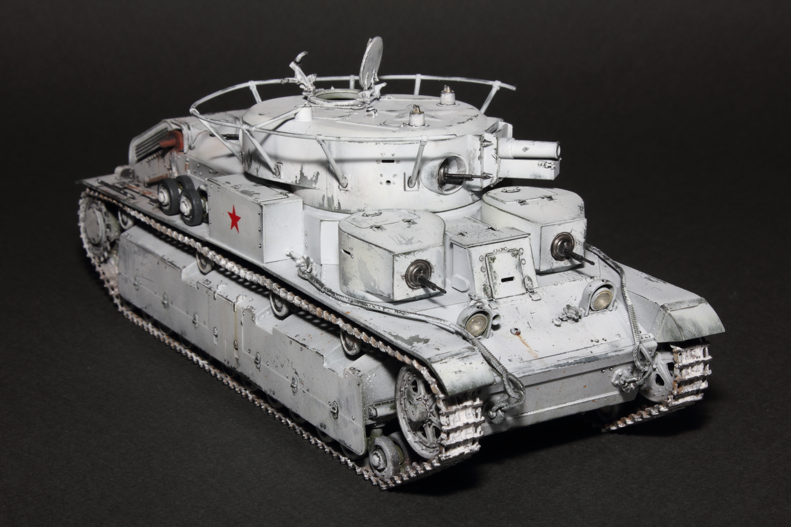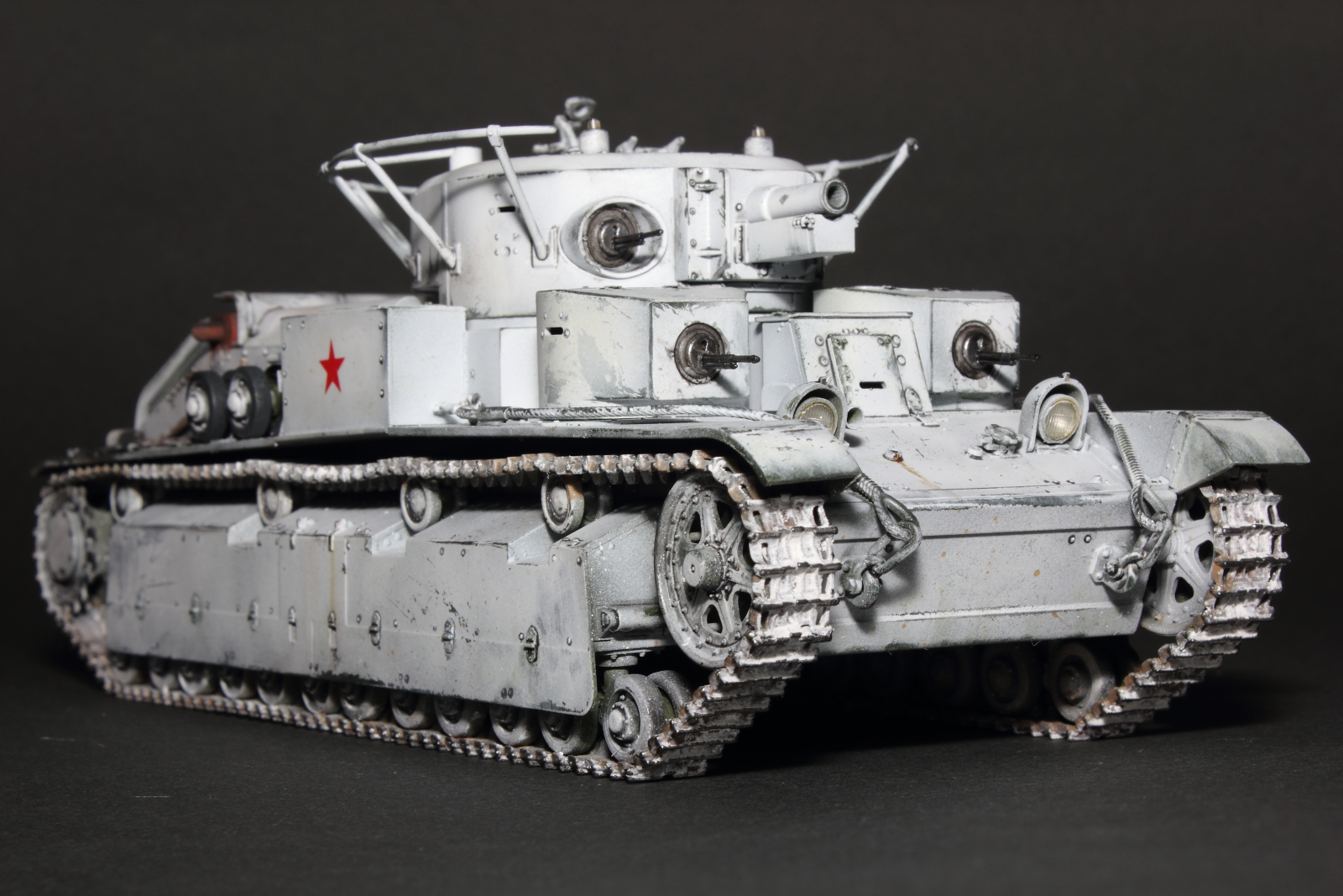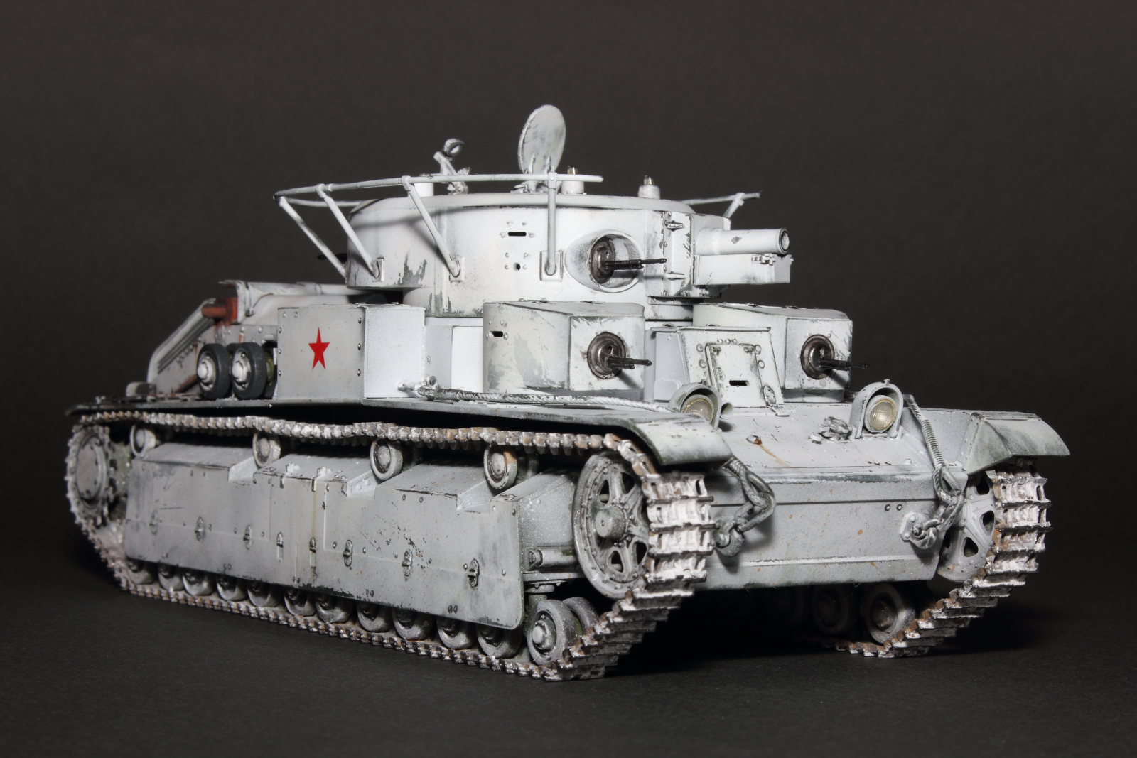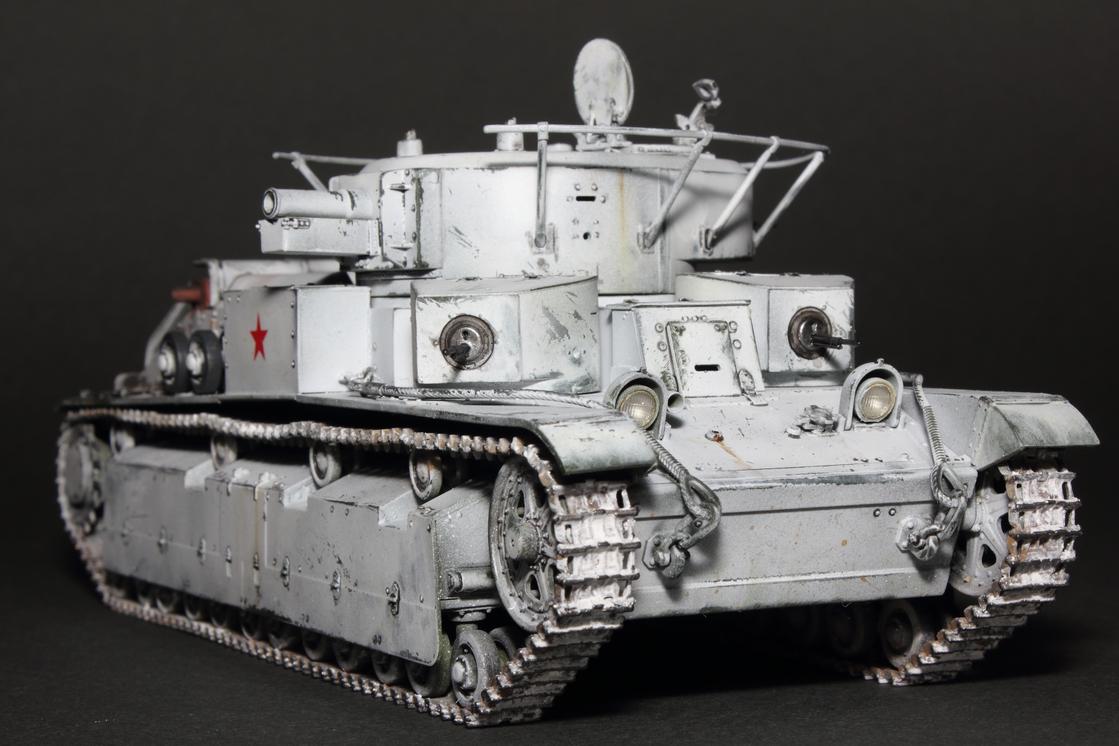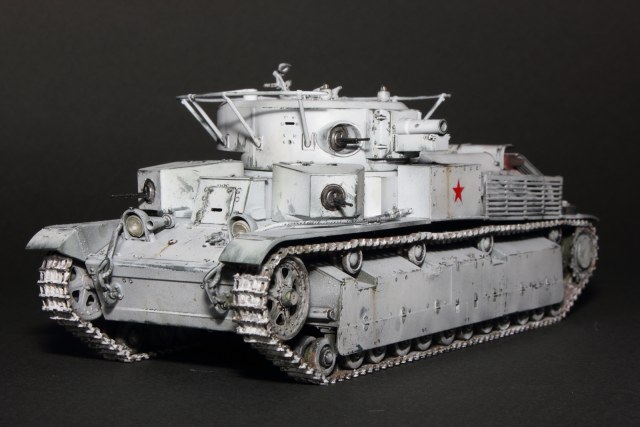 Приветствую, коллеги! Спешу представить свою очередную работу: модель советского среднего трёхбашенного танка Т-28 от нашего родного производителя компании "Звезда". Набор весьма интересный, весьма насыщенный деталями (как я и люблю). Немного сложной оказалась сборка ходовой, которую совершенно не видно. Можно было и не собирать, но так приятней. Насмотревшись кинохроники и фотографий Зимней войны, решил делать машину именно в зимней окрасе, "Звезда" как раз и предлагает такой вариант, а именно танк 20-й танковой бригады на январь 1940-го года. Привязки к конкретной машине нет, скорее собирательный образ танков с кинохроники и фото.