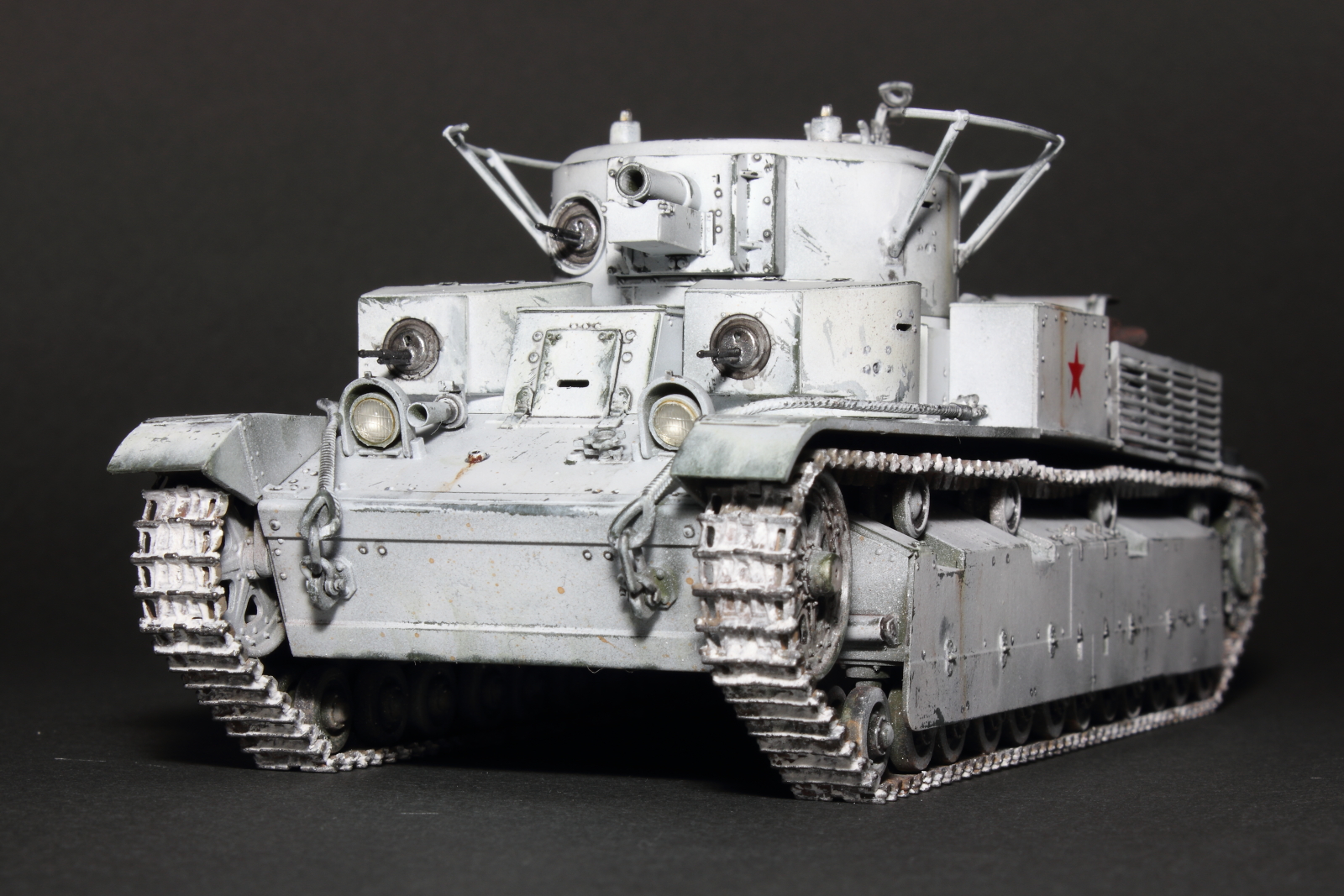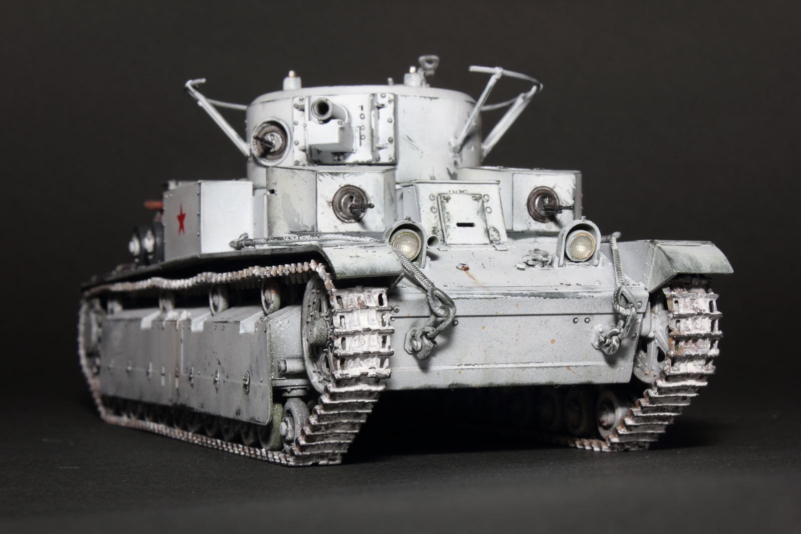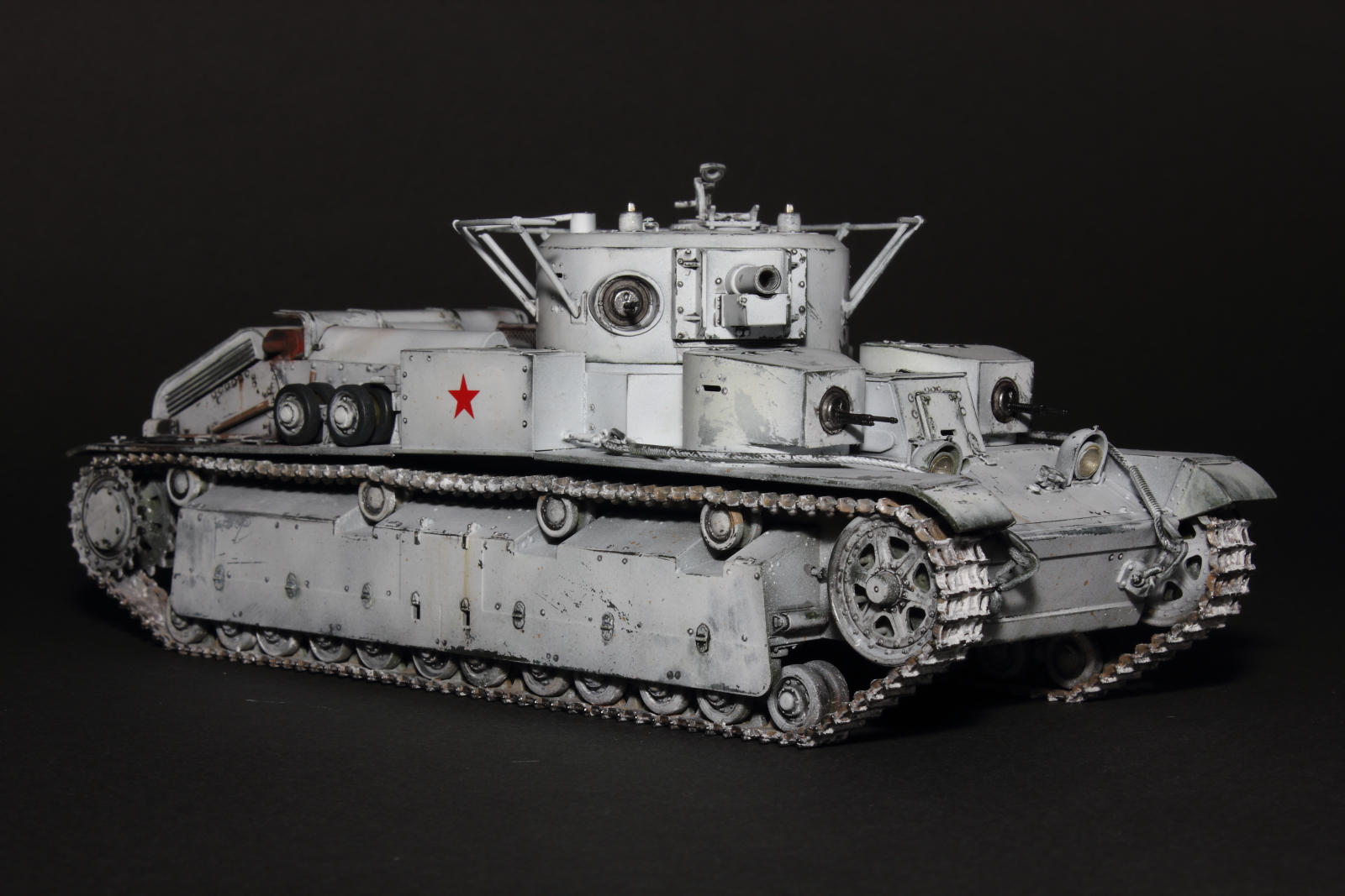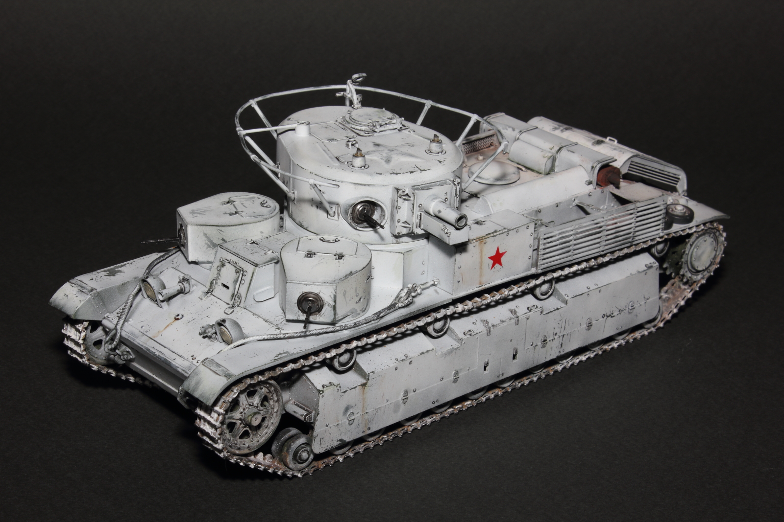 Приветствую, коллеги! Спешу представить свою очередную работу: модель советского среднего трёхбашенного танка Т-28 от нашего родного производителя компании "Звезда". Набор весьма интересный, весьма насыщенный деталями (как я и люблю). Немного сложной оказалась сборка ходовой, которую совершенно не видно. Можно было и не собирать, но так приятней. Насмотревшись кинохроники и фотографий Зимней войны, решил делать машину именно в зимней окрасе, "Звезда" как раз и предлагает такой вариант, а именно танк 20-й танковой бригады на январь 1940-го года. Привязки к конкретной машине нет, скорее собирательный образ танков с кинохроники и фото.
