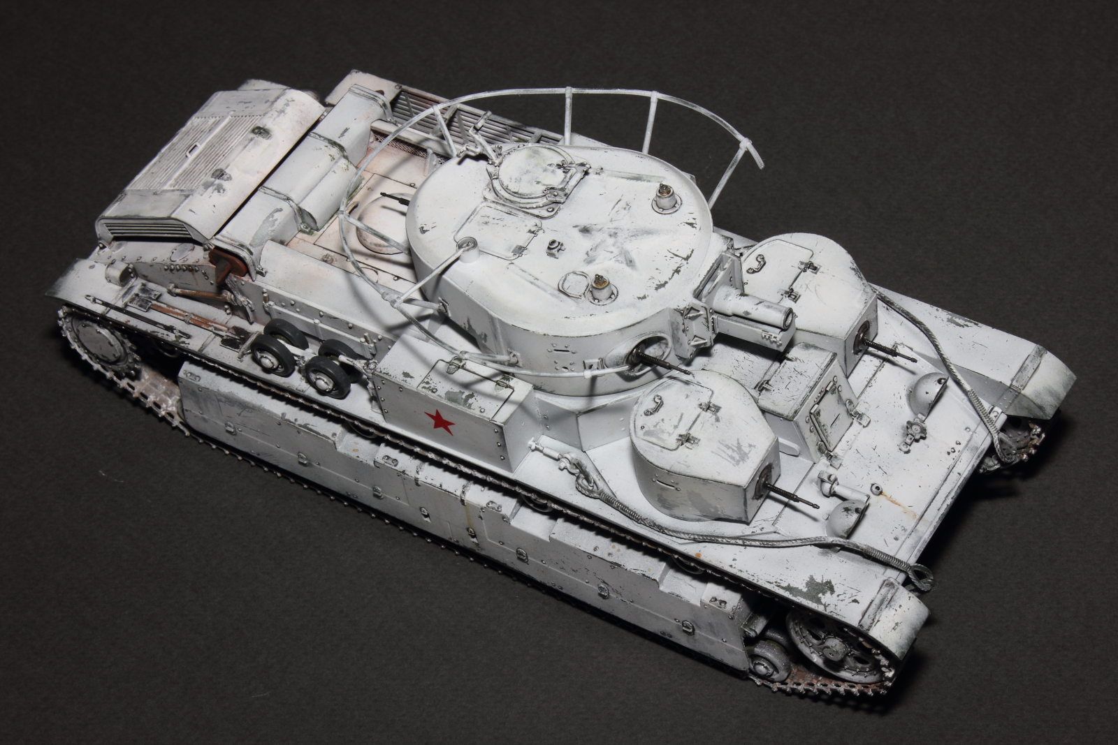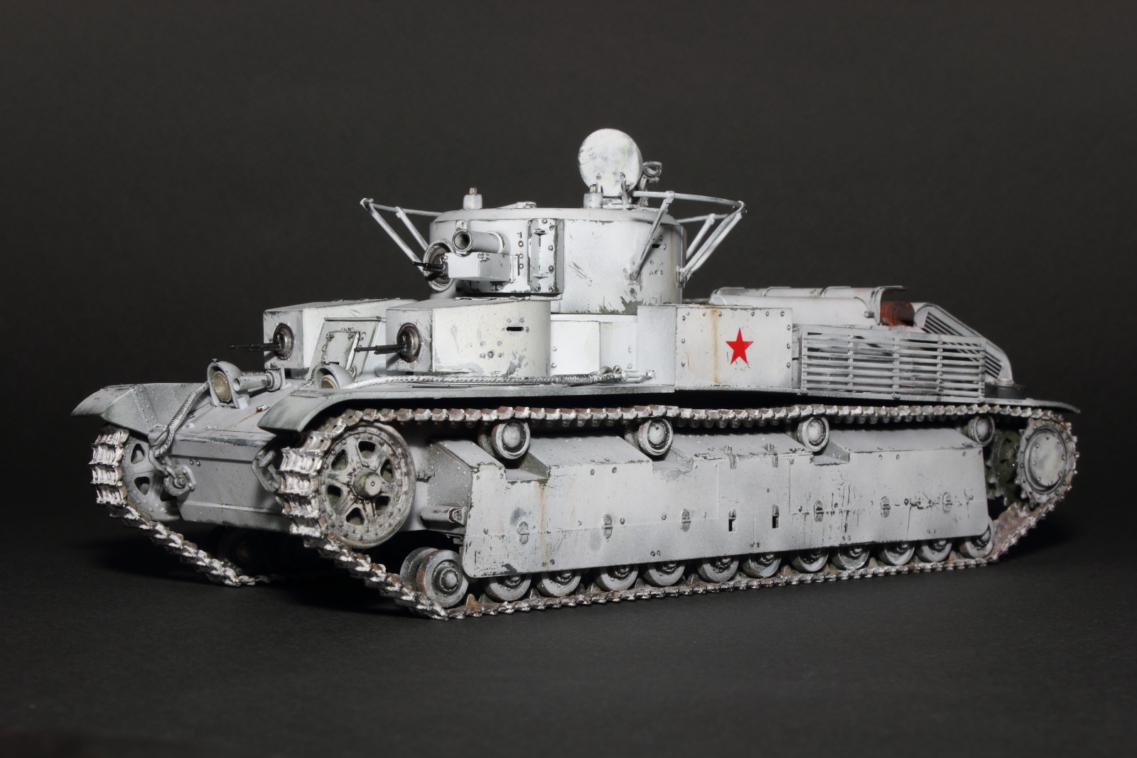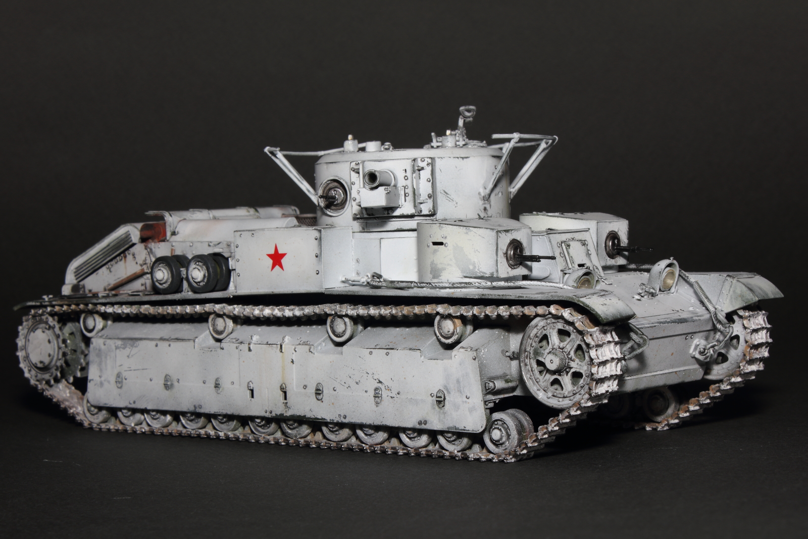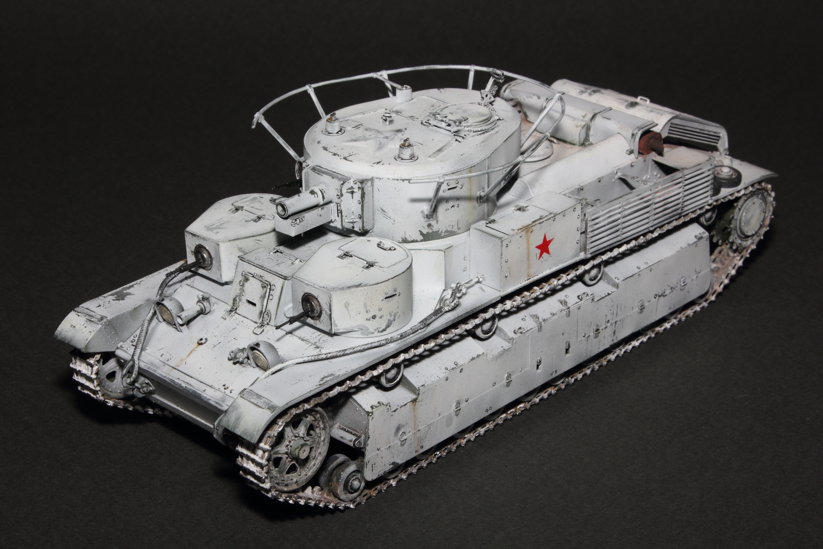 Приветствую, коллеги! Спешу представить свою очередную работу: модель советского среднего трёхбашенного танка Т-28 от нашего родного производителя компании "Звезда". Набор весьма интересный, весьма насыщенный деталями (как я и люблю). Немного сложной оказалась сборка ходовой, которую совершенно не видно. Можно было и не собирать, но так приятней. Насмотревшись кинохроники и фотографий Зимней войны, решил делать машину именно в зимней окрасе, "Звезда" как раз и предлагает такой вариант, а именно танк 20-й танковой бригады на январь 1940-го года. Привязки к конкретной машине нет, скорее собирательный образ танков с кинохроники и фото.