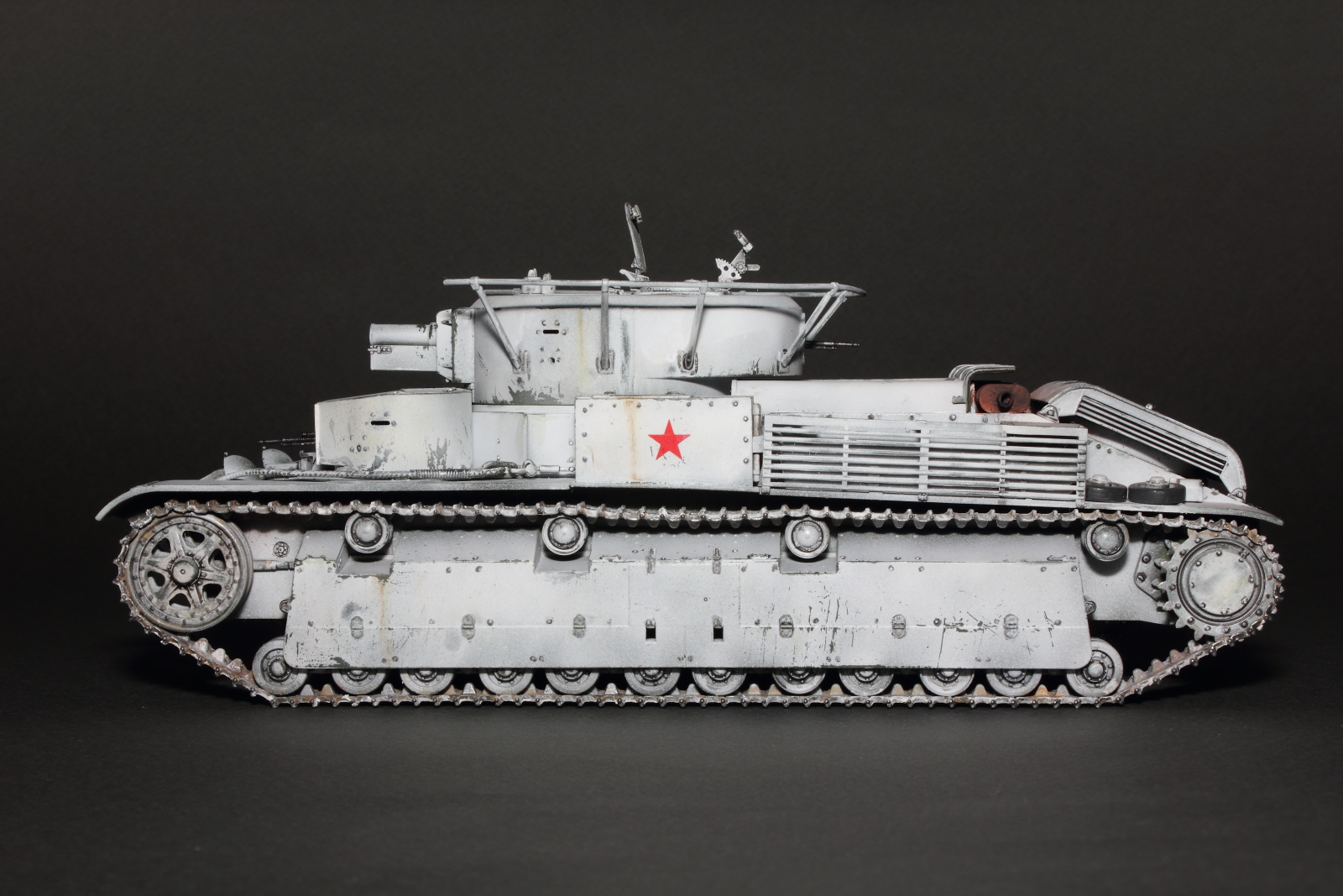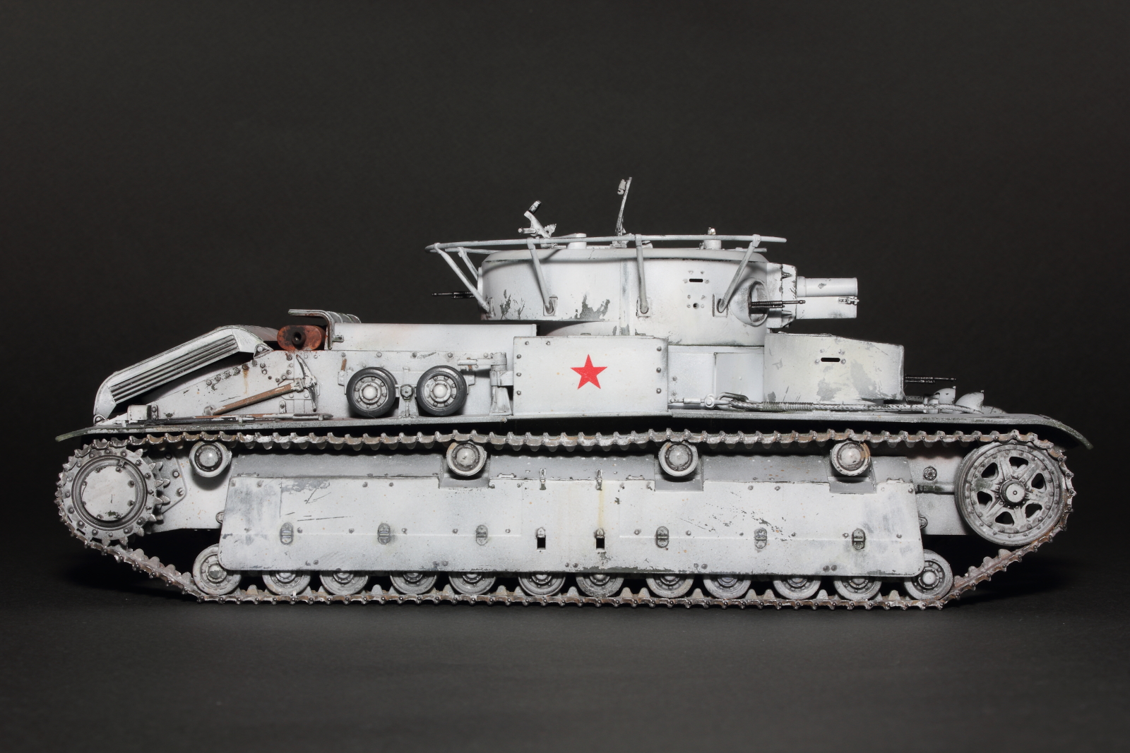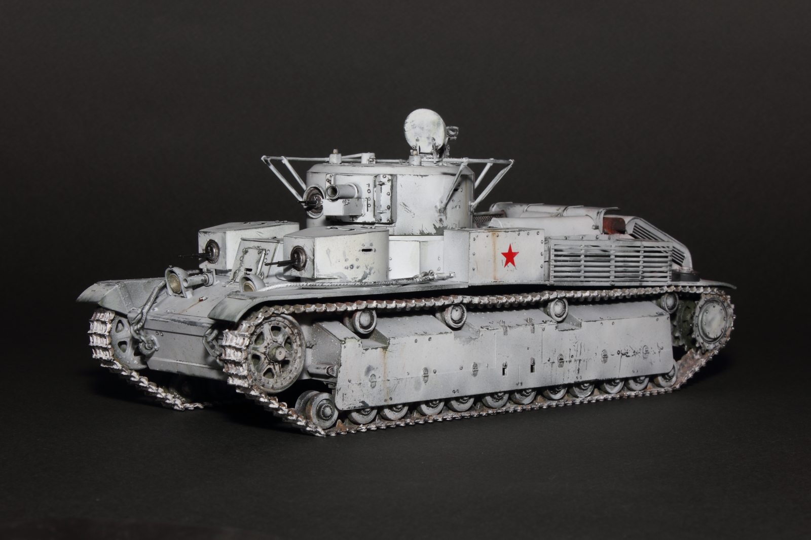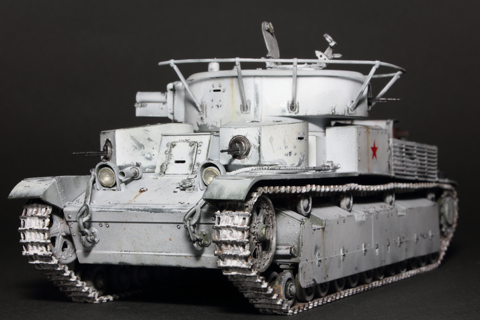 Приветствую, коллеги! Спешу представить свою очередную работу: модель советского среднего трёхбашенного танка Т-28 от нашего родного производителя компании "Звезда". Набор весьма интересный, весьма насыщенный деталями (как я и люблю). Немного сложной оказалась сборка ходовой, которую совершенно не видно. Можно было и не собирать, но так приятней. Насмотревшись кинохроники и фотографий Зимней войны, решил делать машину именно в зимней окрасе, "Звезда" как раз и предлагает такой вариант, а именно танк 20-й танковой бригады на январь 1940-го года. Привязки к конкретной машине нет, скорее собирательный образ танков с кинохроники и фото.