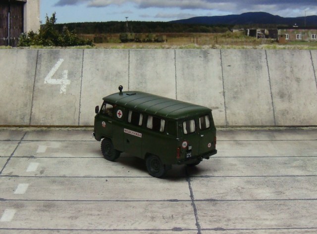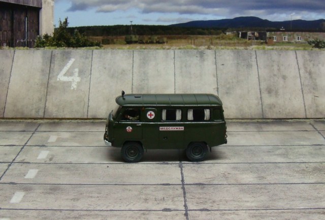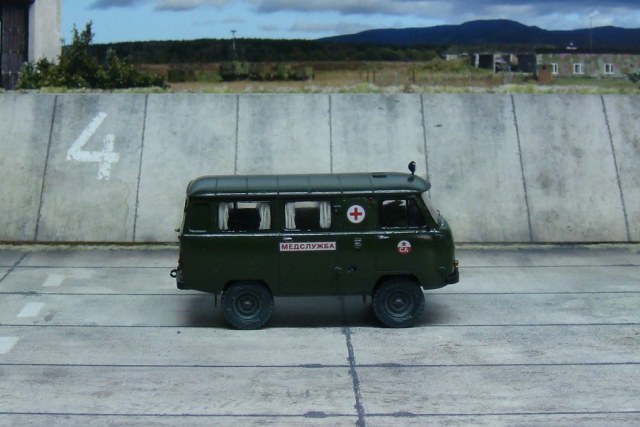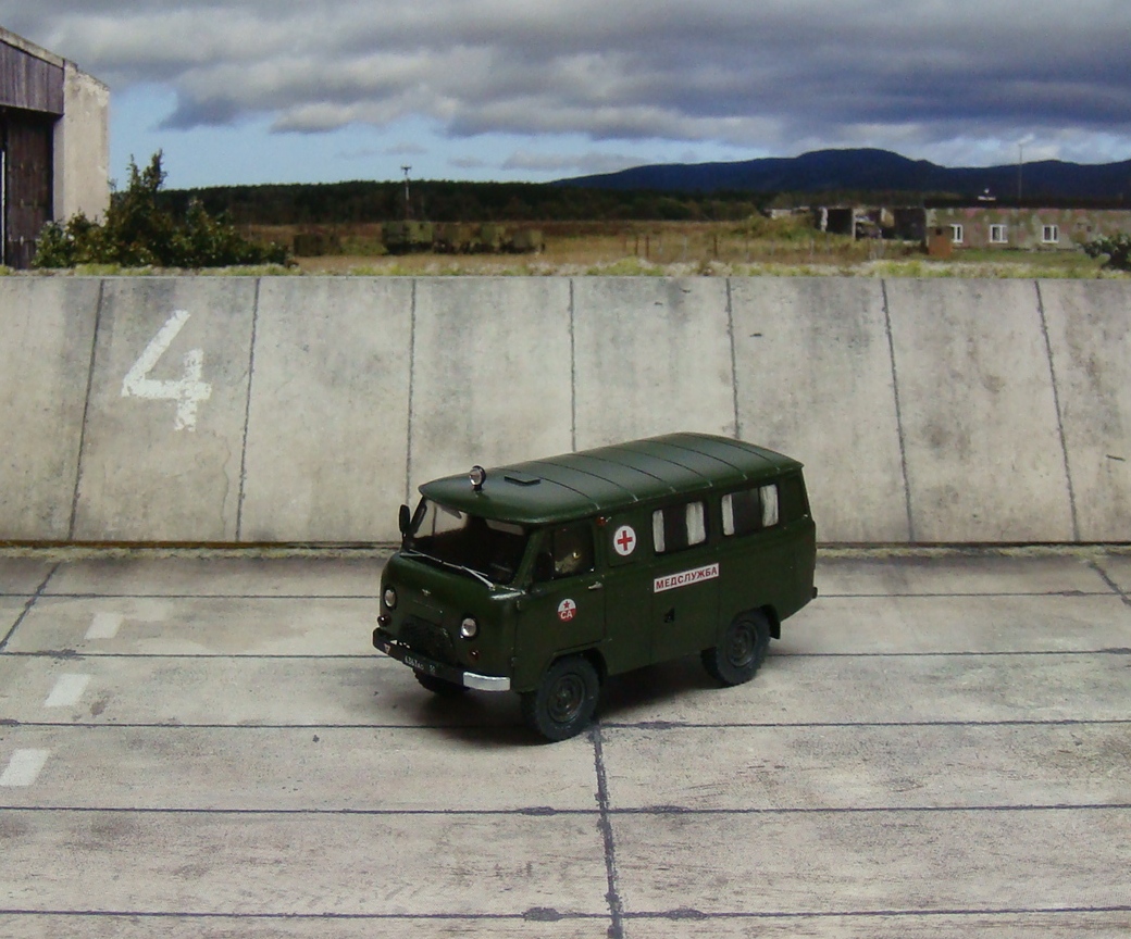 Приветствую коллеги. Закончил я свою буханку - санитарку. Сам набор хорош и мне понравился, хорошая деталировка. Из доработок: Шторки, стекло между водителем и грузовым салоном, огнетушители, медицинские аптечки. Фары, повторители и стекла, кроме лобового, делал сам из тонкого прозрачного пластика. Стекла из набора мне очень не понравились и подогнать их по проему хорошо, у меня не получалось. Вернее, мне не нравился конечный результат с родными стеклами. От сборки набора получил удовольствие. Сложностей особых нет, только вот модель весьма маленькая. Краска, лак, смывка и тонировка Тамия. Недостатки и косяки есть. В результате, вот, что из этого получилось. Надеюсь кому-то понравится.
