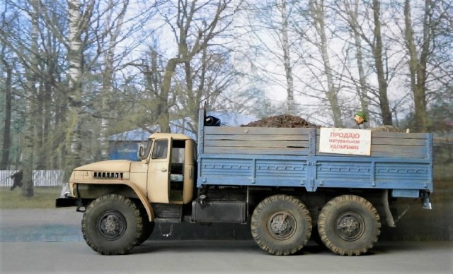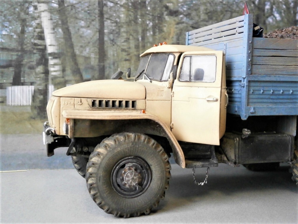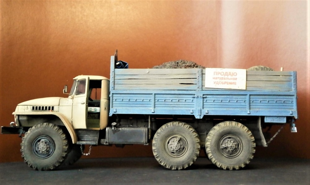 Всем доброго времени! Несмотря на все погодные причуды, весна,хотя бы календарная, уже не за горами! Как и дачный сезон, а как известно залогом богатого урожая является компост:)) В конце 90-х в начале 00-х можно было встретить по дороге во Владивосток места стихийной торговли углём, дровами, чернозёмом и пр. Торговали прям "с колёс", в основном конечно грузовики были японские, крепко запомнились ЗИЛы-самосвалы с артёмовским углём. Уралов и близко не было, это моя фантазия:)) Урал сделал, для разнообразия, с короткой мордой, облицовку использовал от неведомого мне производителя Алангер, кузов КАМАЗовский пр-ва ICM, колёса Трубачёвские резинки. С последними я намучился, делая просадку. Я их на плитке жарил, саморезами притягивал, наполнил холодной сваркой. Ещё над свечой разогнул задние рессоры,получилось неравномерно, отсюда такой результат. Перегной сделал из старой заварки. Фигурка вторая в жизни и первая которой я придавал нужную позу:)) Не проходите мимо!