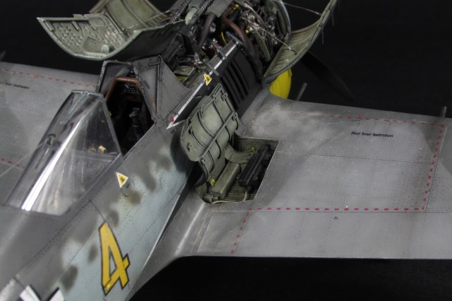 Покраска как обычно. Черный грунт Gunze 1500, по нему белым грунтом прешейдинг. Далее низ и бока RLM 76 mr.Color. Выбрал именно mr.Color потому что он более голубой чем спиртовой mr.Hobby (покупаю готовые цвета, мешать не люблю), тот ближе к грязно-серому. RLM 02 тоже использовал mr.Color. Далее верх RLM 74/75 уже спиртовыми mr.Hobby. Потом глянцевый лак Tamiya X-22. Декали. Декали не понравились, подложка толстовата. Сразу вспомнил декали у МИГ-21 у которых подложка после приваривания снимается и остается чистая надпись. Смывку мешал серую и черную. Пробовал черную и полностью, и просто стыки обшивки - не то, смотрится не естественно. Поэтому использовал два цвета - серый и смесь серого с черным.
