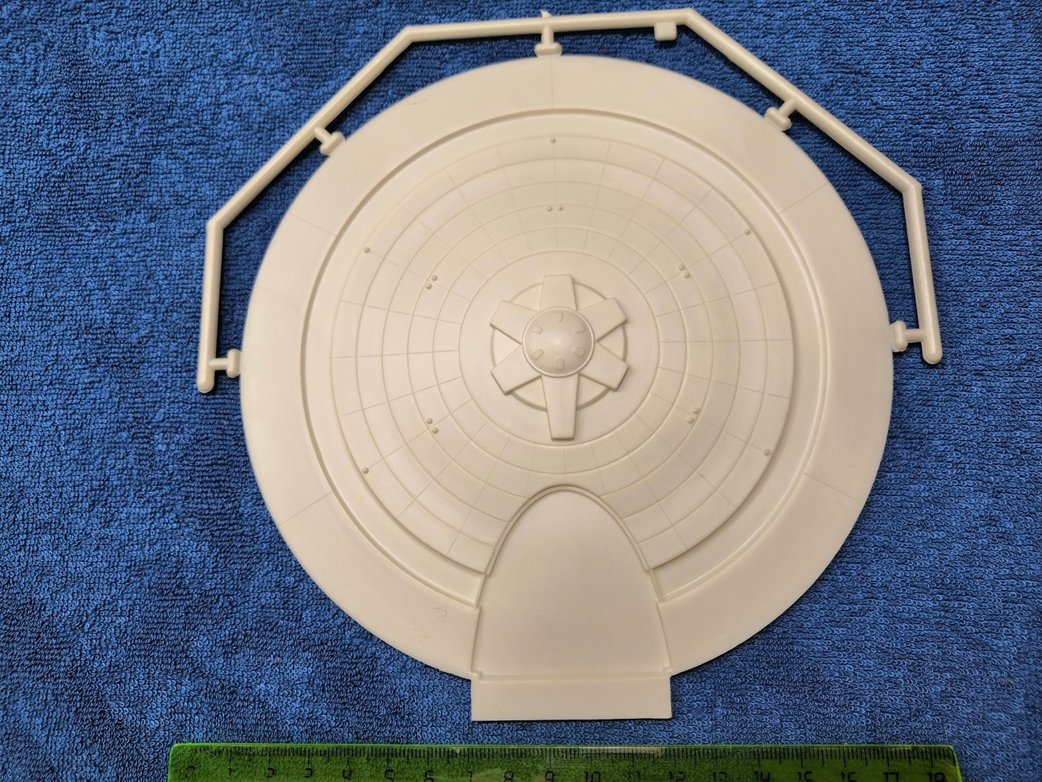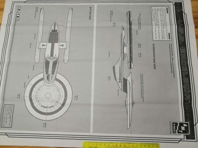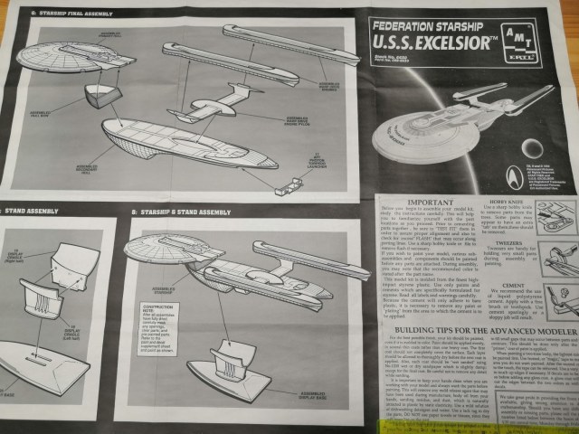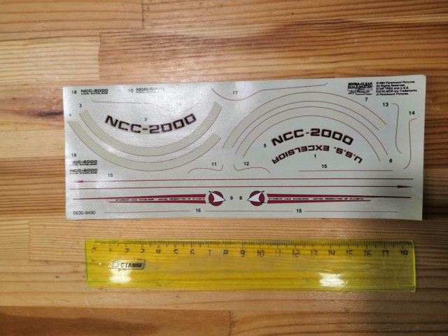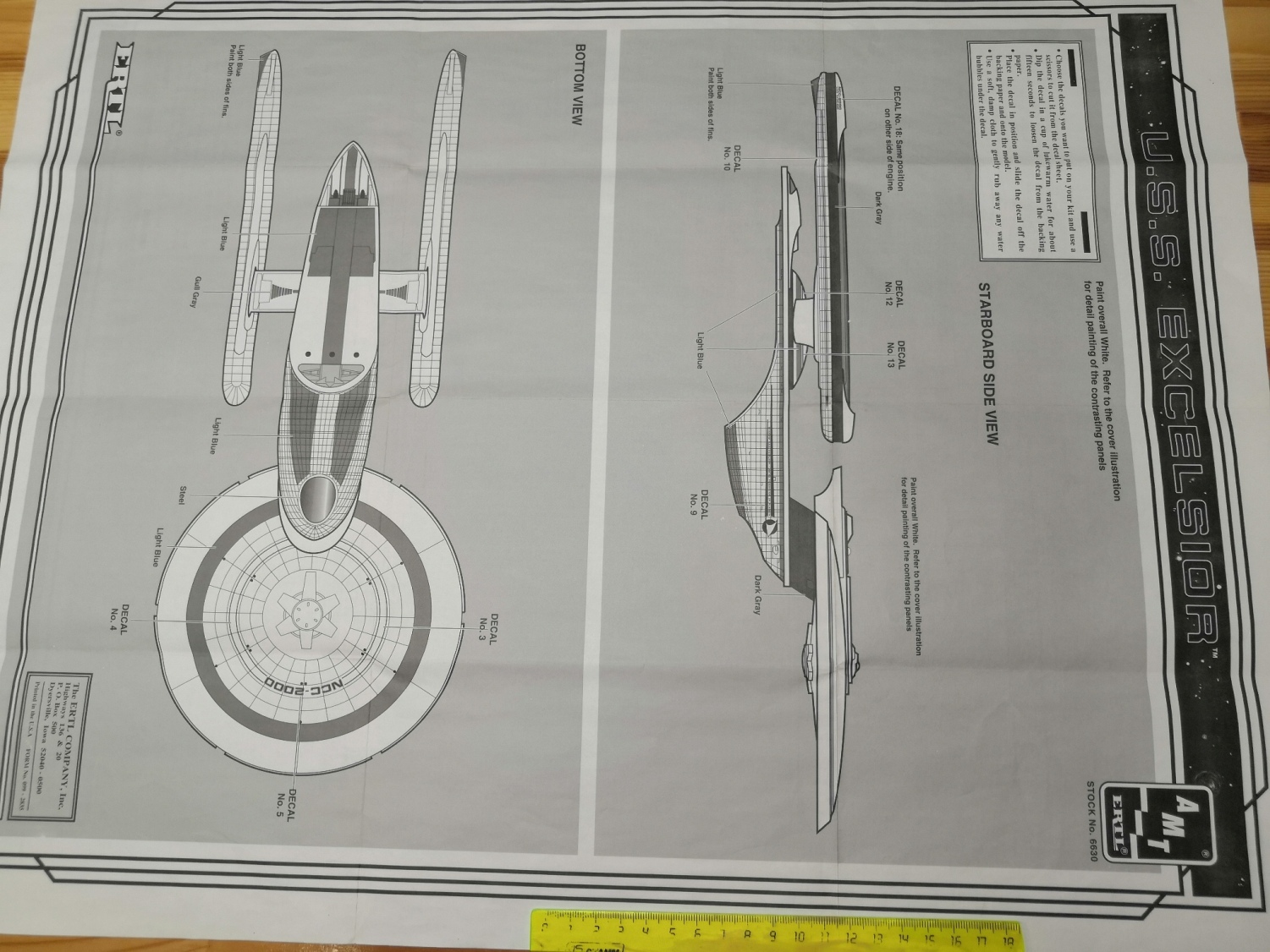 Модель из кинофильма "Стар Трек". Крейсер земной федерации - Эксельсиор. Модель побита временем, прошла долгий и сложный путь до фотосессии в Коропке.Моделистам , любителям фантастики будет интересно посмотреть на данную модель чуть поближе.Сама коробка имеет размеры 44х30 см.В коробке бело/желтый пластик, дека, инструкция, и прозрачные детали.Готовая модель , по размерам должна иметь около 40х20 см.