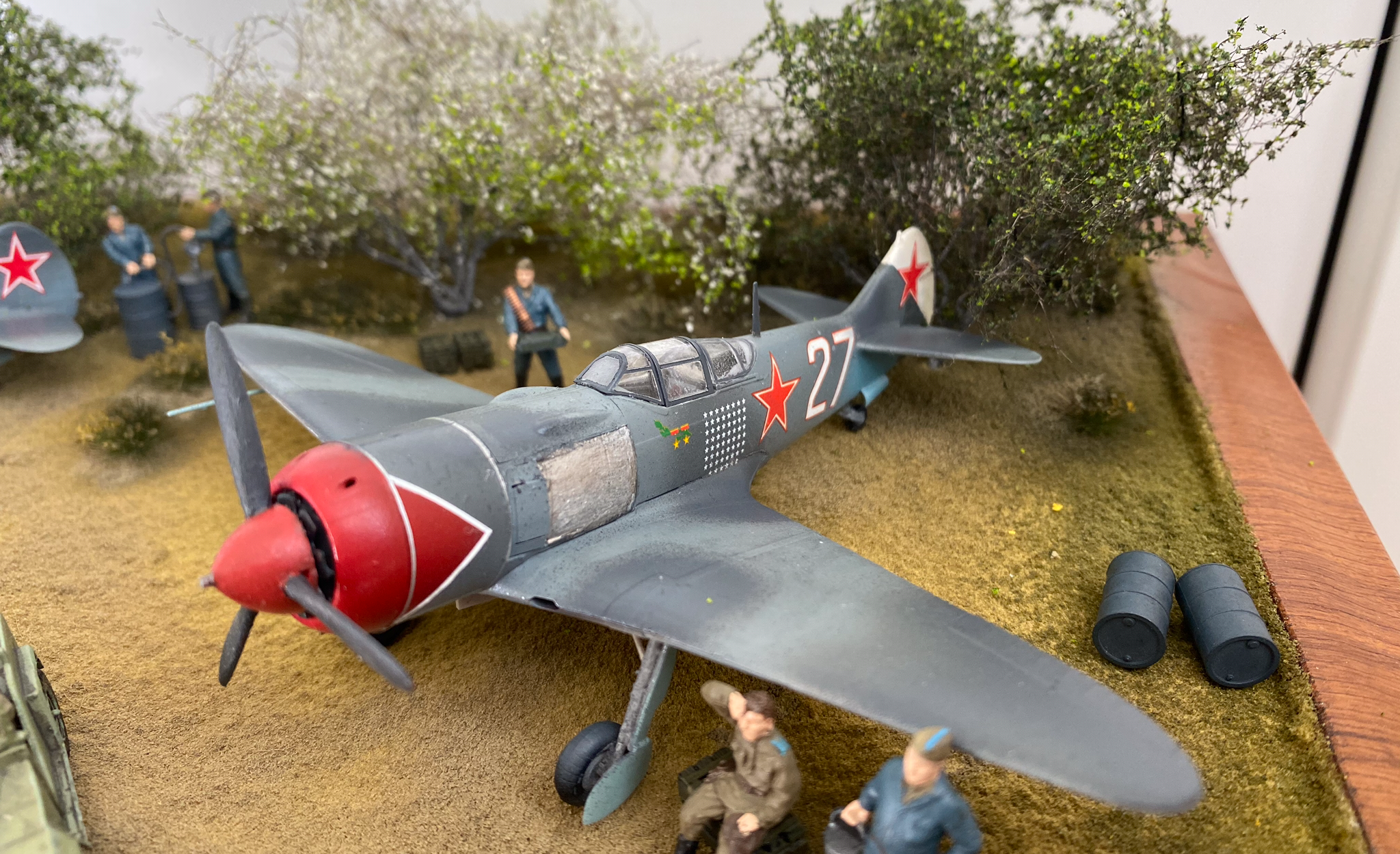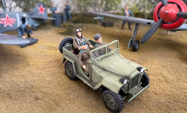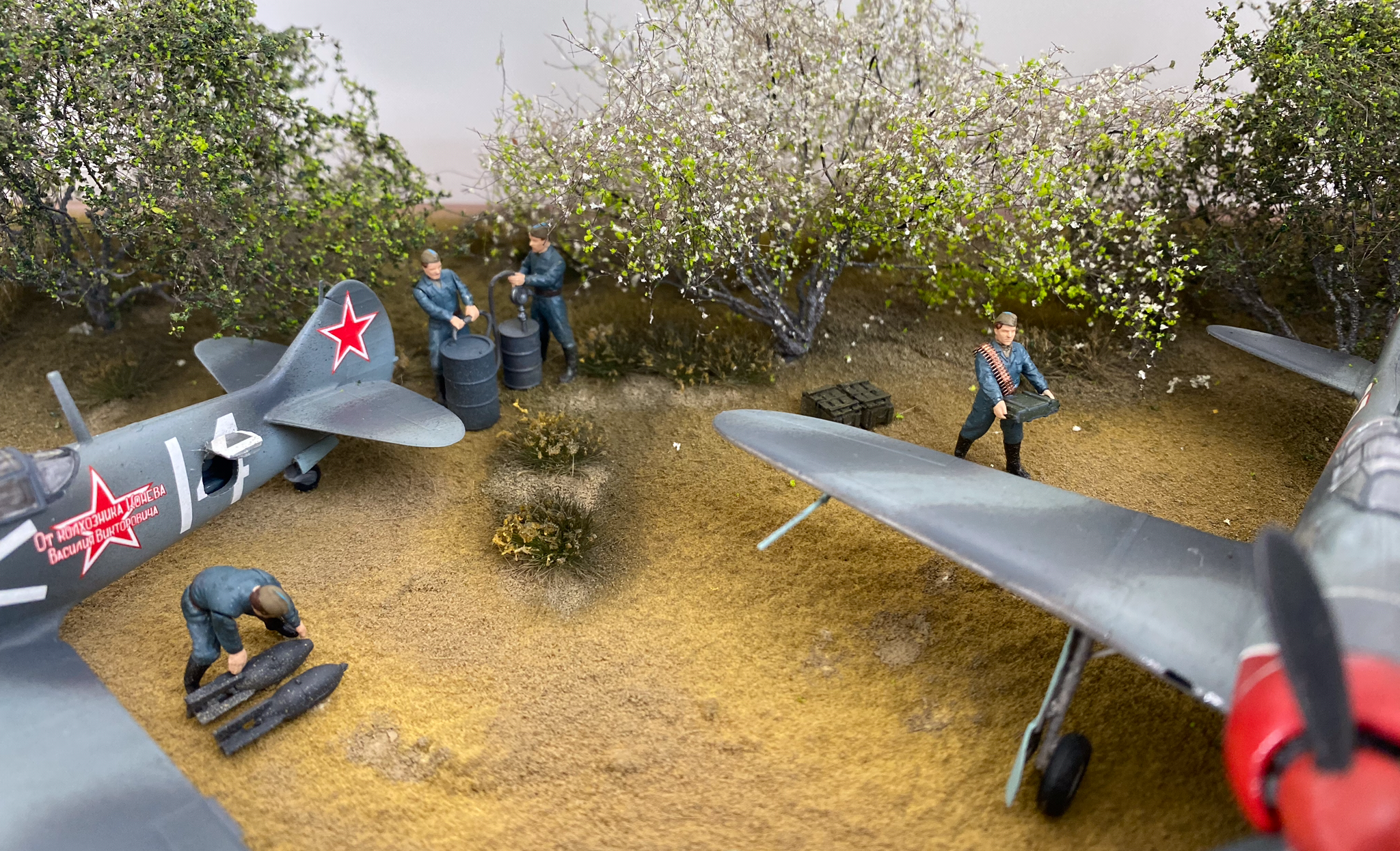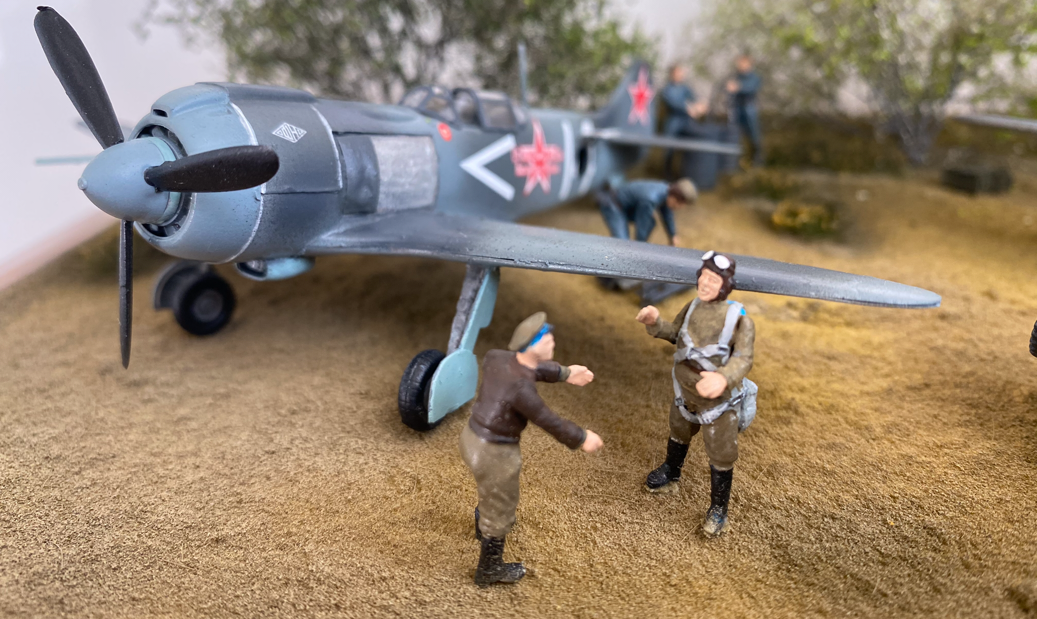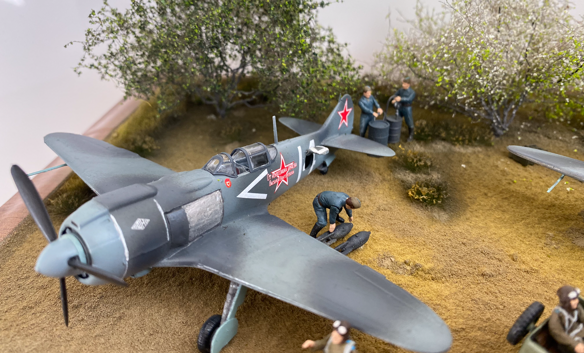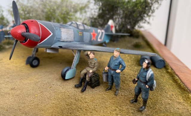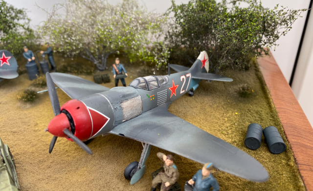 На фото, там где нет Макро, выглядит вполне неплохо. Есть идея, задумка, вроде как движуха показана. Только самолеты разных полков. Кожедуб - 176 гв.ИАП, а Евстигнеев - 178 гв. ИАП. Могли быть они рядом на одном аэродроме?