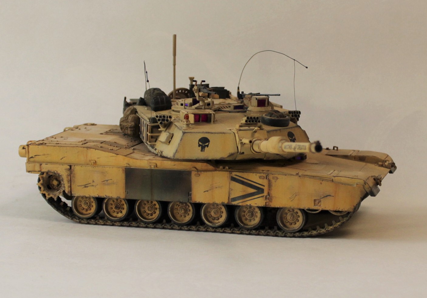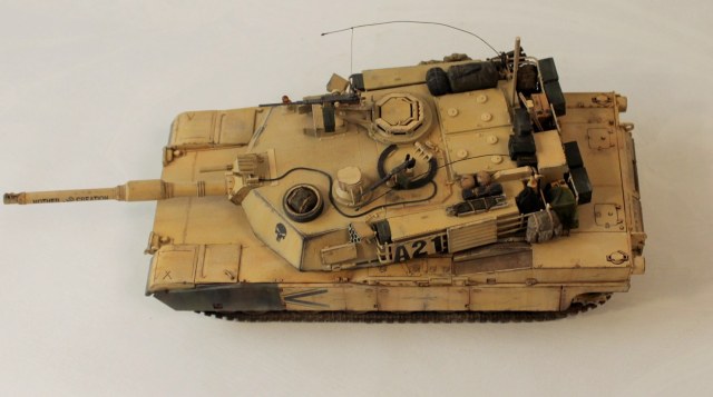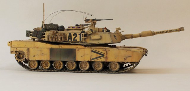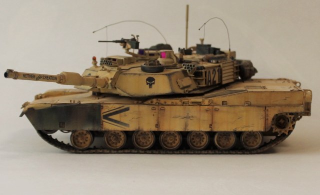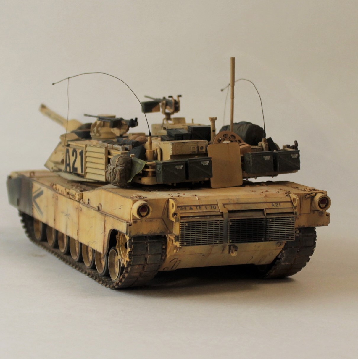 В этом наборе косяков куча, не исправлено ничего. Собрано тоже не слишком аккуратно, забашенная корзина явно завалена влево. Таких кривых антенн на Абрамсах сроду не было, да и гнутся они в пружинных вводах на самом деле. Даже цвет не соответствует прототипу. По маркировке это конкретный учебный танк, но деки налеплены лишь бы были))) Фото тоже так себе.