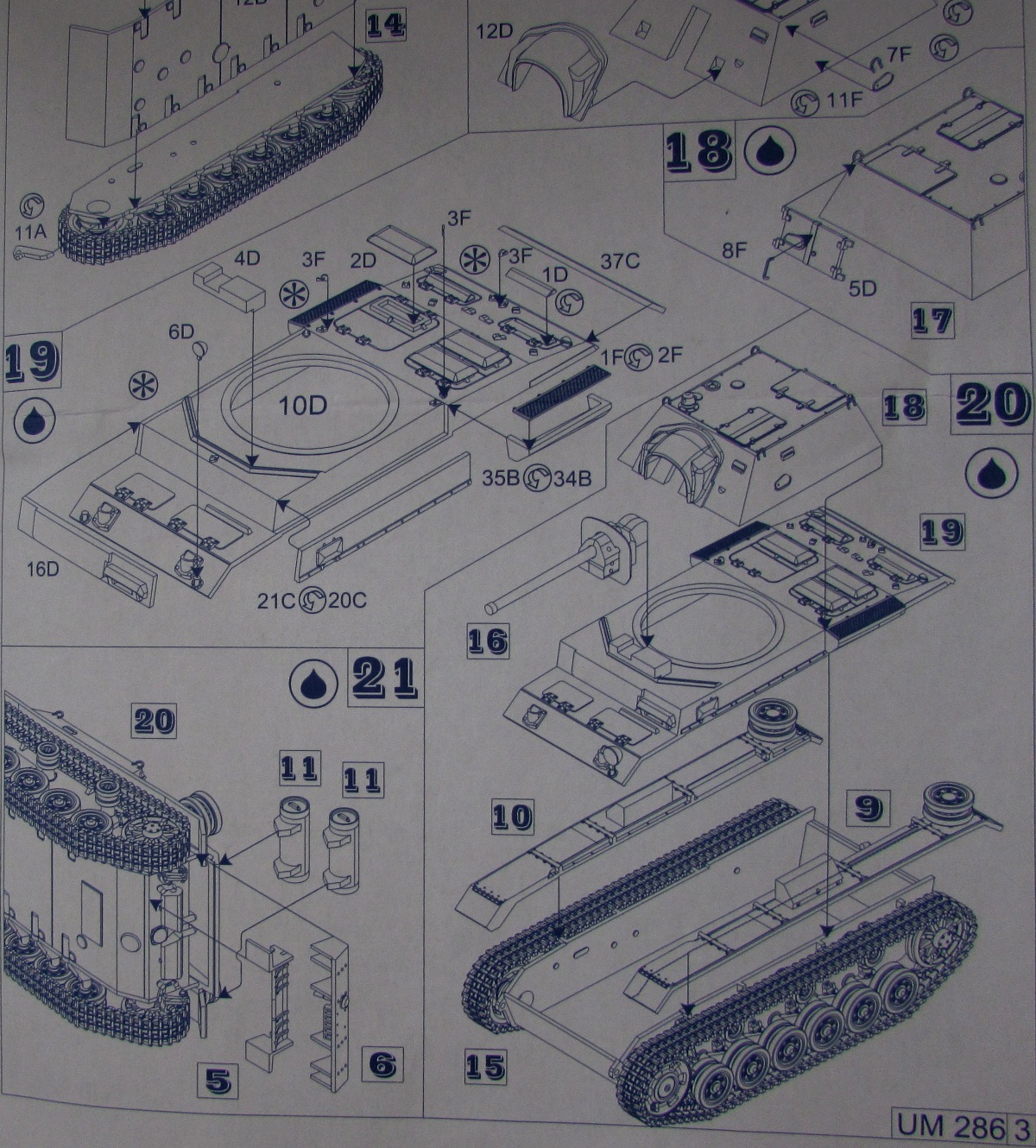 Но самая засада здесь с литьем, точнее - с быстрым устареванием пресс-формы у фирмы. Поскольку здесь больше оригинальных деталей от Pz.Kpfw III, то и проблем гораздо больше. Детали подбашенной коробки даны отдельно, а их грани оплывшие - что вызывает определенные проблемы с убиранием и заделыванием щелей между деталями. Топливные баки вообще ужасны.