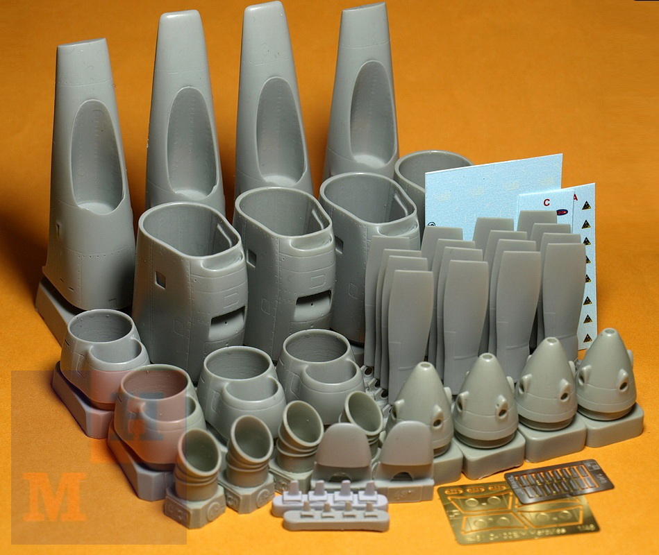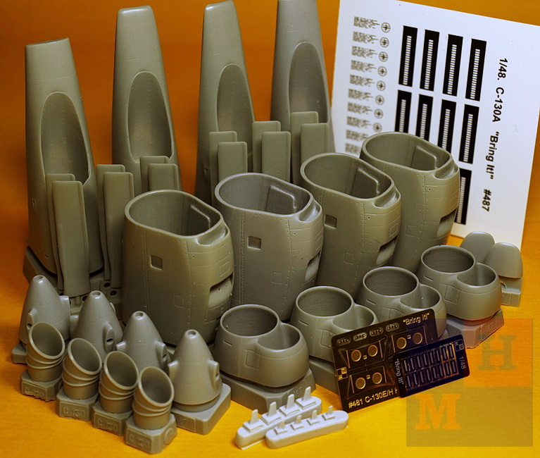 Набор #487. Содержит детали в классическом для С-130А сочетании коротких двигателей Эллисон Т-56А-9 и трехлопастных воздушных винтов A6341FN-D1A фирмы Аэропродактс. Укомплектованных корректными для этой модификации удлиненными задними частями мотогондол. К смоляным деталям прилагается две небольших платы фототравления и декаль с техническими надписями, лого производителя и элементами ПОС.