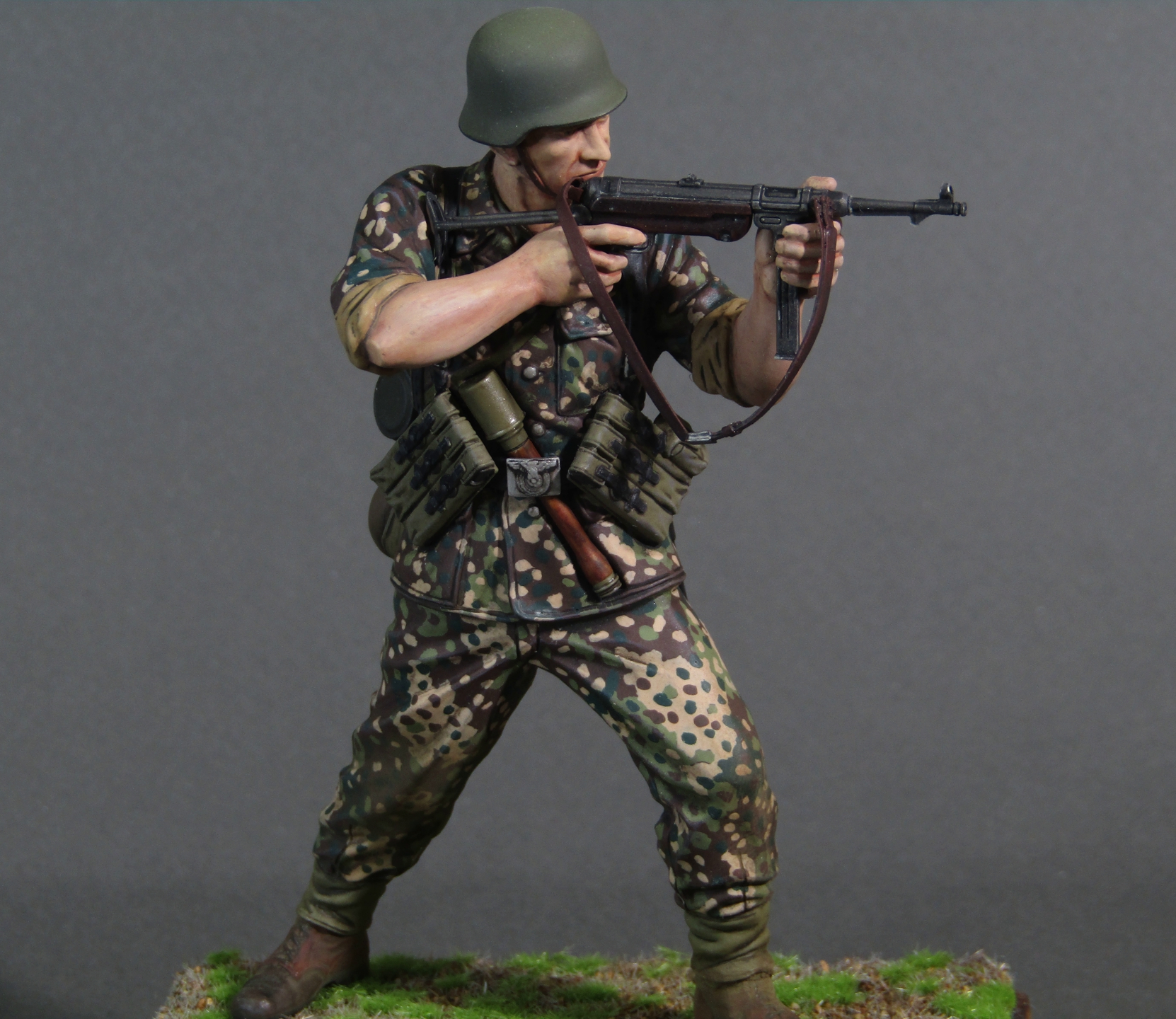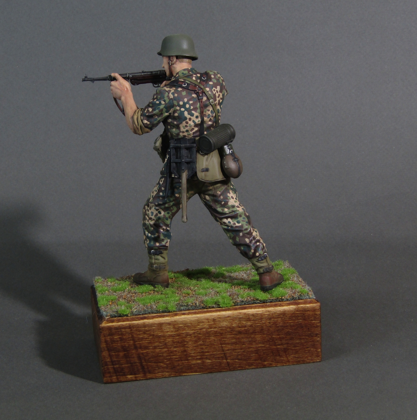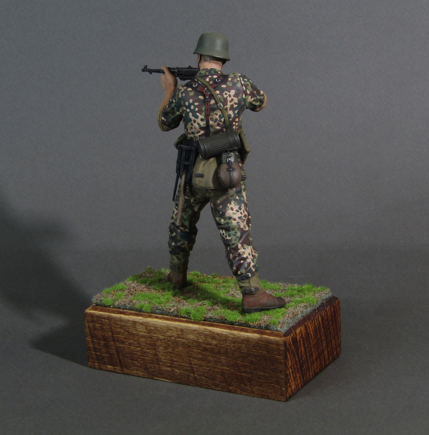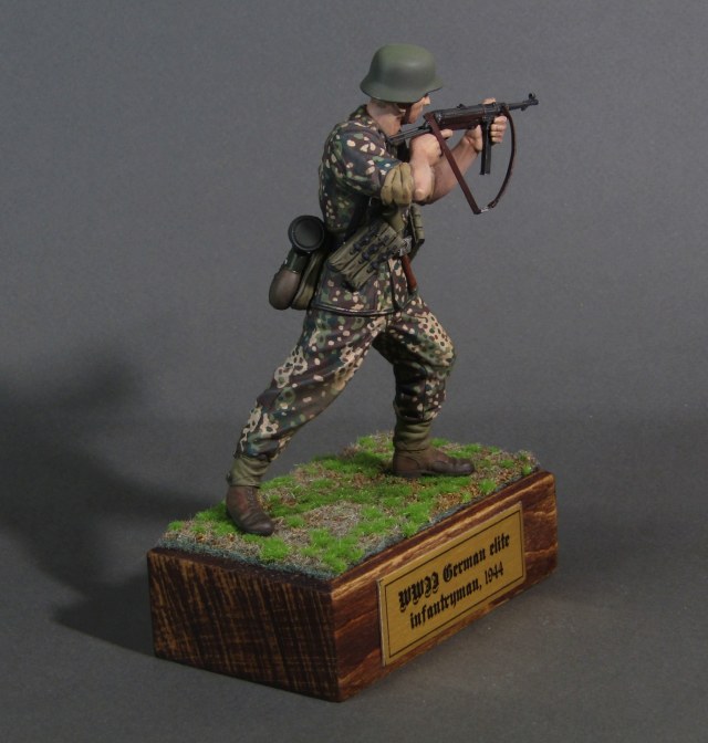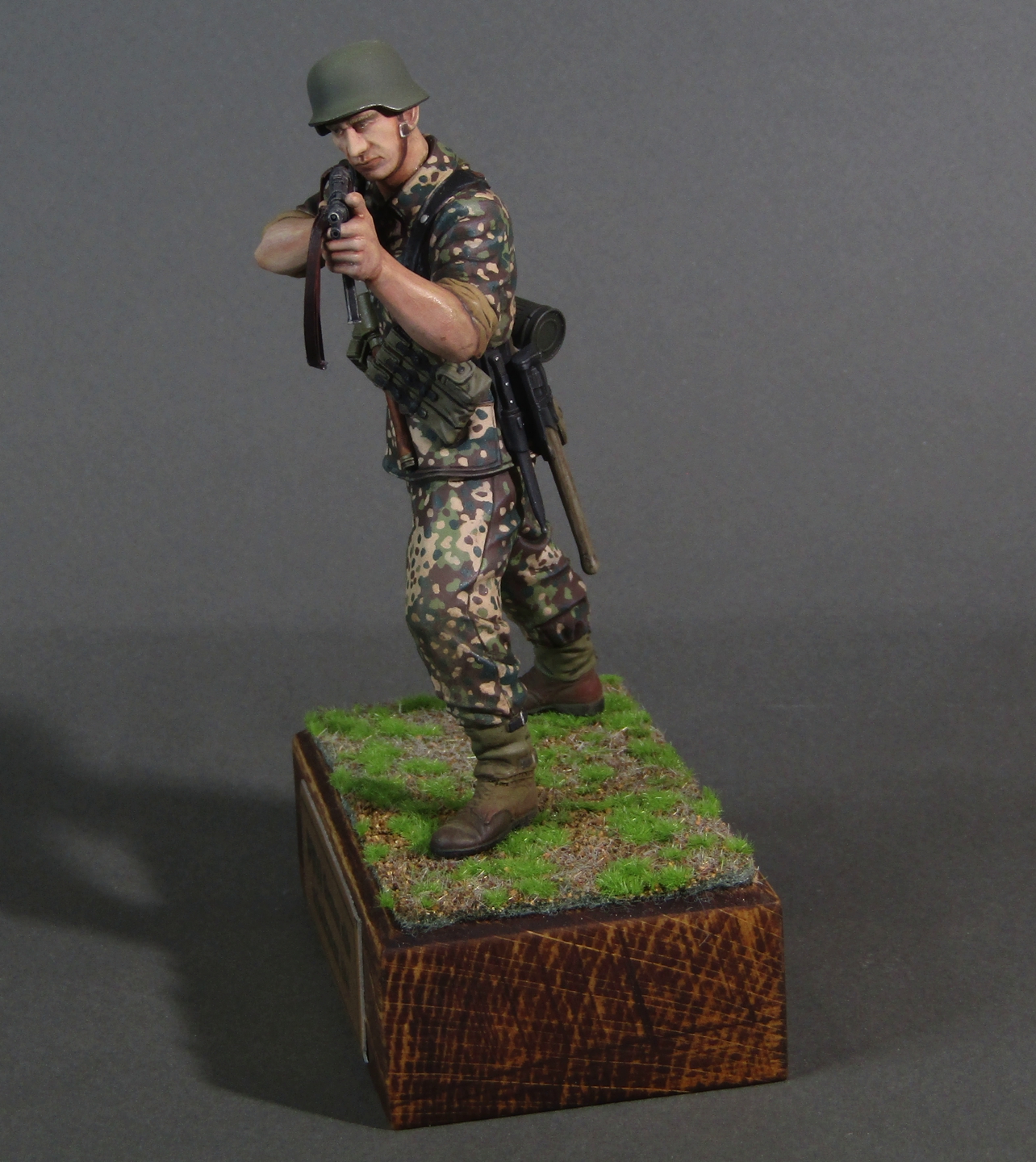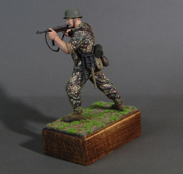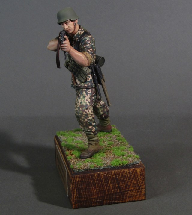 Приветствую коллеги! Представляю свою вторую миниатюру в 16-м масштабе. Честно признаться, несмотря на некоторые недоработки данной миниатюры (гладкая каска например), в целом миниатюрой остался вполне доволен. Из доработок только ремень на MP-40. Грунтовал фигуру серым грунтом Тамия, росписывал акрилами от Тамии и АКАН, кое-где темперой, местами рельеф выделял смывками от Тамии. Деревянная подставка самодельная, сверху наклеен травяной мат от Ammo Mig. Приятного просмотра коллеги...