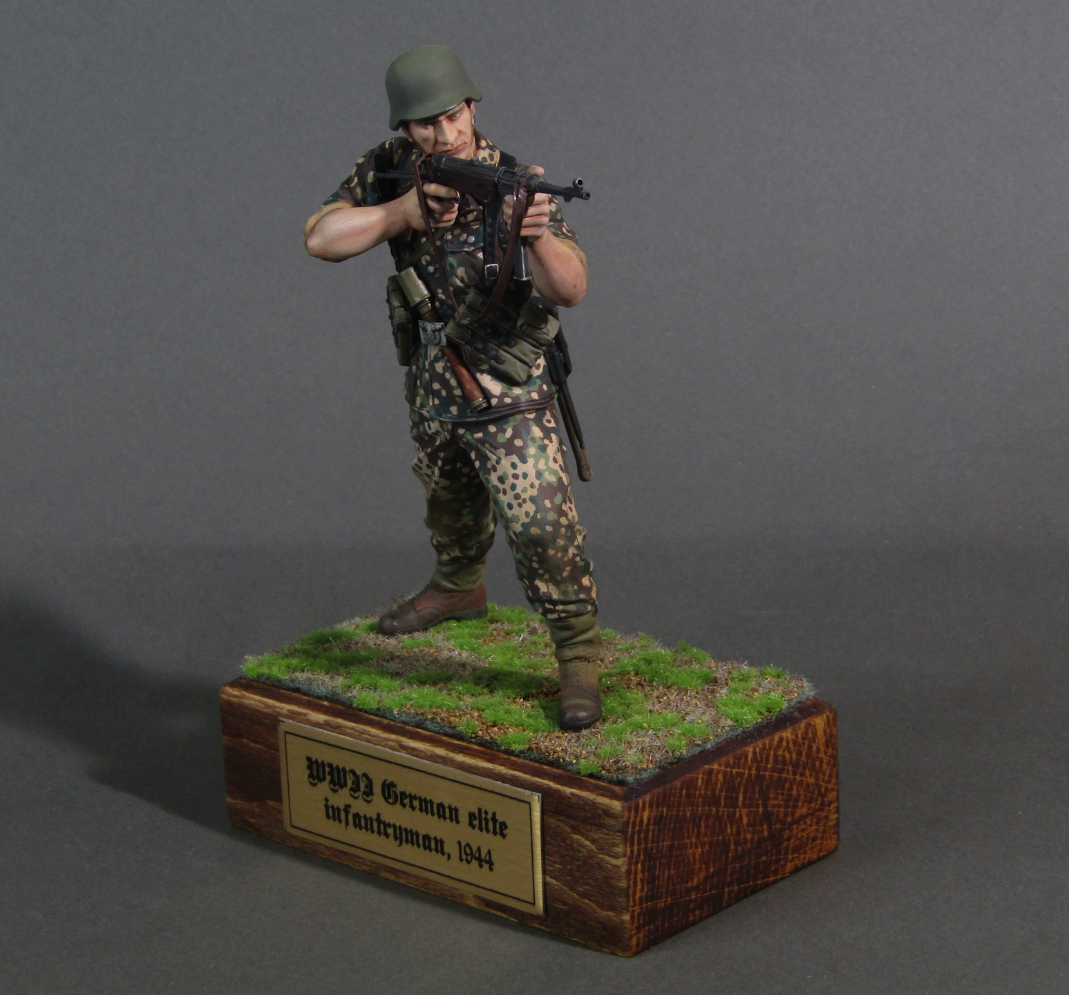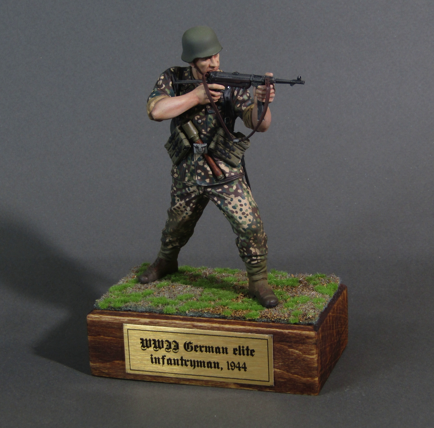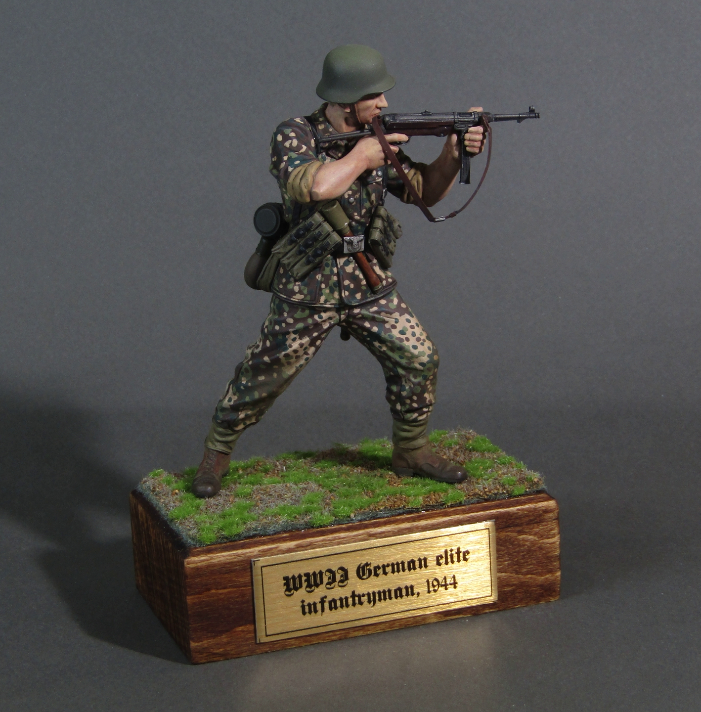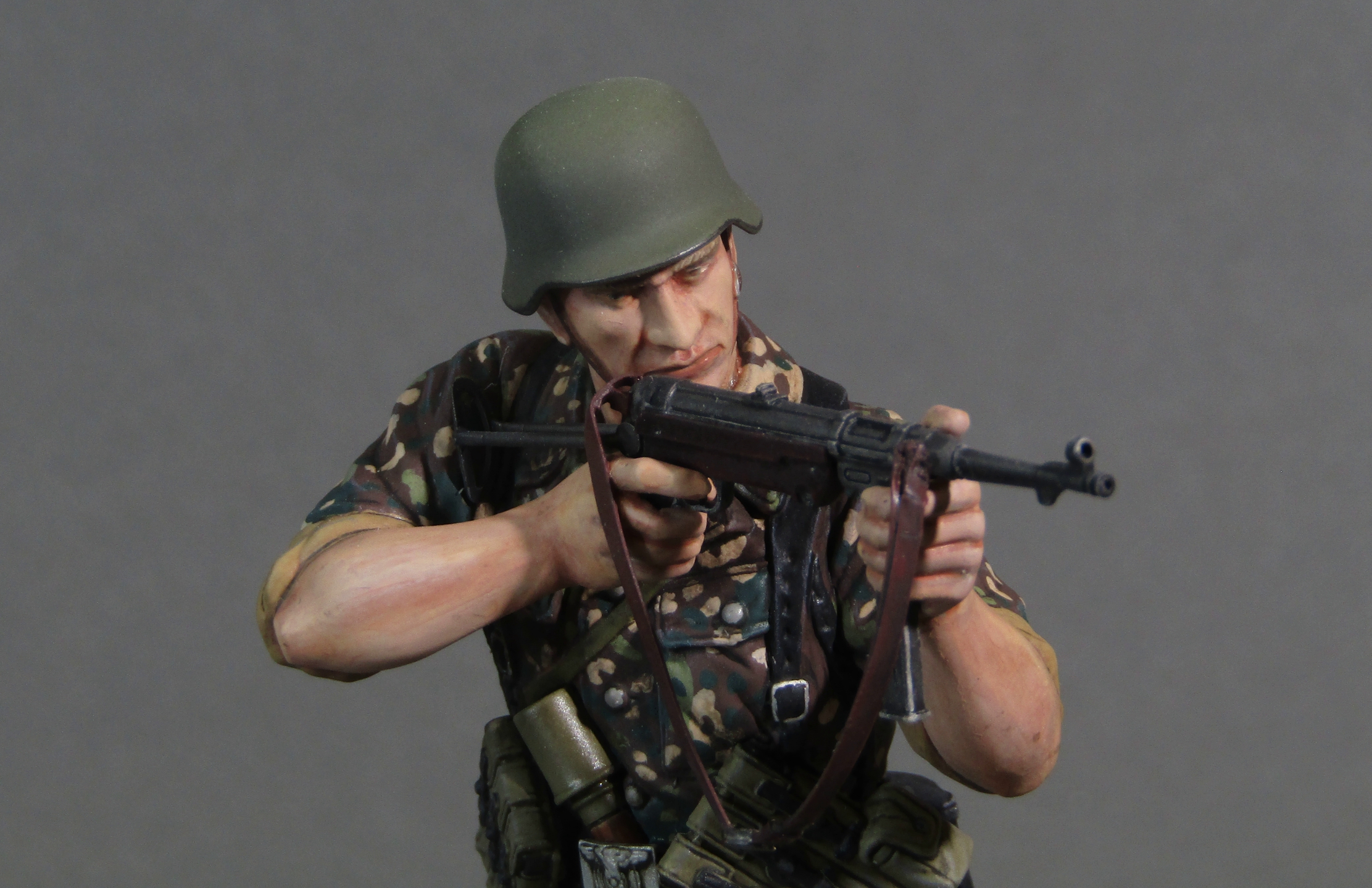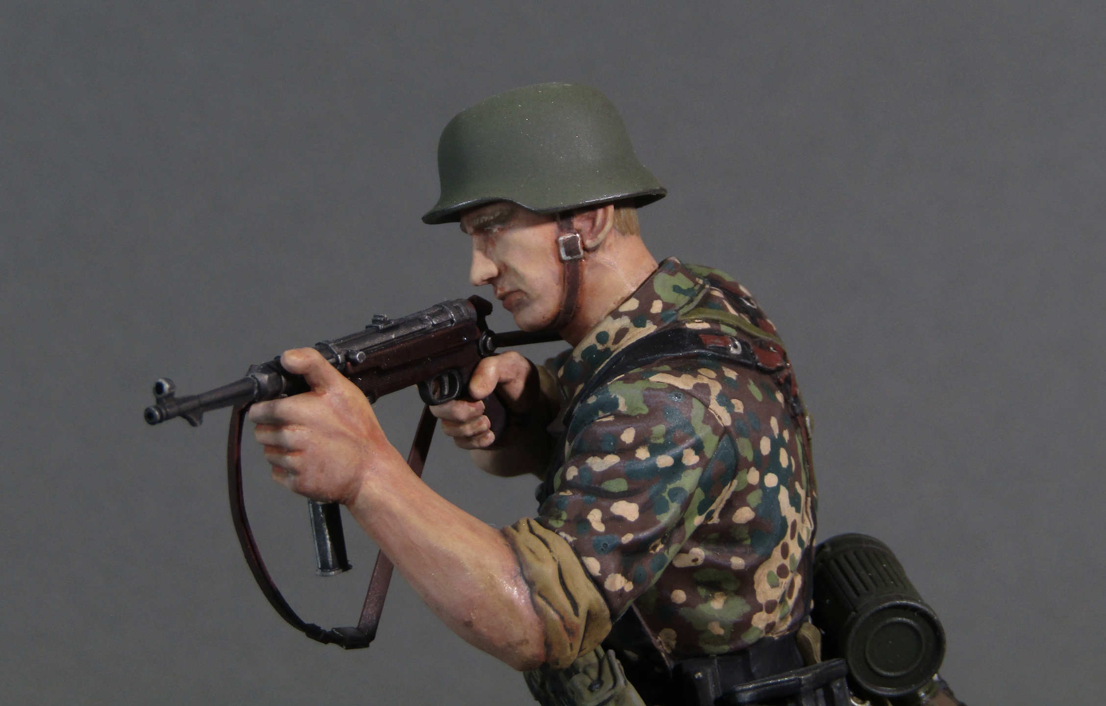 Приветствую коллеги! Представляю свою вторую миниатюру в 16-м масштабе. Честно признаться, несмотря на некоторые недоработки данной миниатюры (гладкая каска например), в целом миниатюрой остался вполне доволен. Из доработок только ремень на MP-40. Грунтовал фигуру серым грунтом Тамия, росписывал акрилами от Тамии и АКАН, кое-где темперой, местами рельеф выделял смывками от Тамии. Деревянная подставка самодельная, сверху наклеен травяной мат от Ammo Mig. Приятного просмотра коллеги...