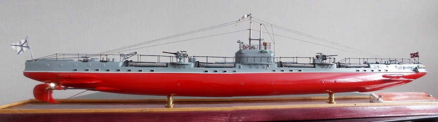 Модель подводной лодки изготовлена в масштабе 1:100, имеет длину 680 мм, ширину 44, мм. Корпус наборный, состоит из шпангоутов, килевой рамы, стрингеров и обшивки из деревянных реек. Для склеивания корпуса применялся нитроклей, зашпатлеван автомобильной шпатлевкой, покраска проводилась нитроэмалью из аэрографа. Для изготовления деталировки применялась белая консервная жесть, листовая латунь, проволока. Торпеды, стволы орудий, лафеты и все круглые детали выточены на токарном станке, своего производства.