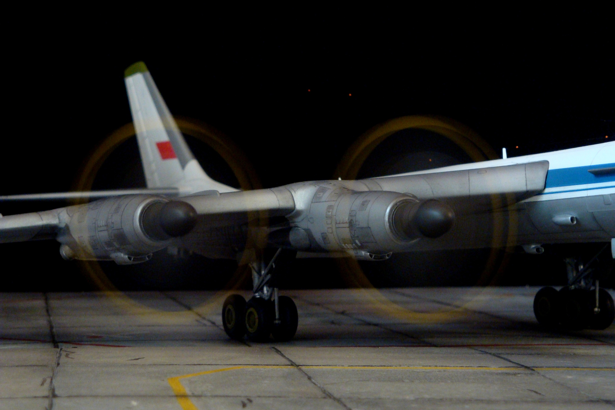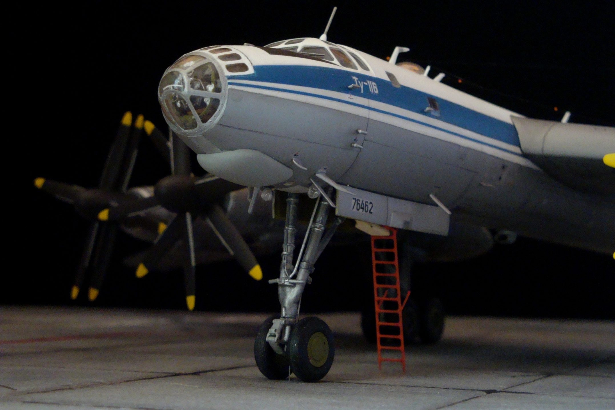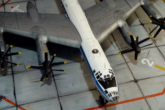 Из того что Вы перечислили в глаза не бросается. Мне бросились в глаза колеса шасси от современных 142\95МС и желтые законцовки винтов слишком широкие. А что, шасси из А-модела были "не в дугу"?